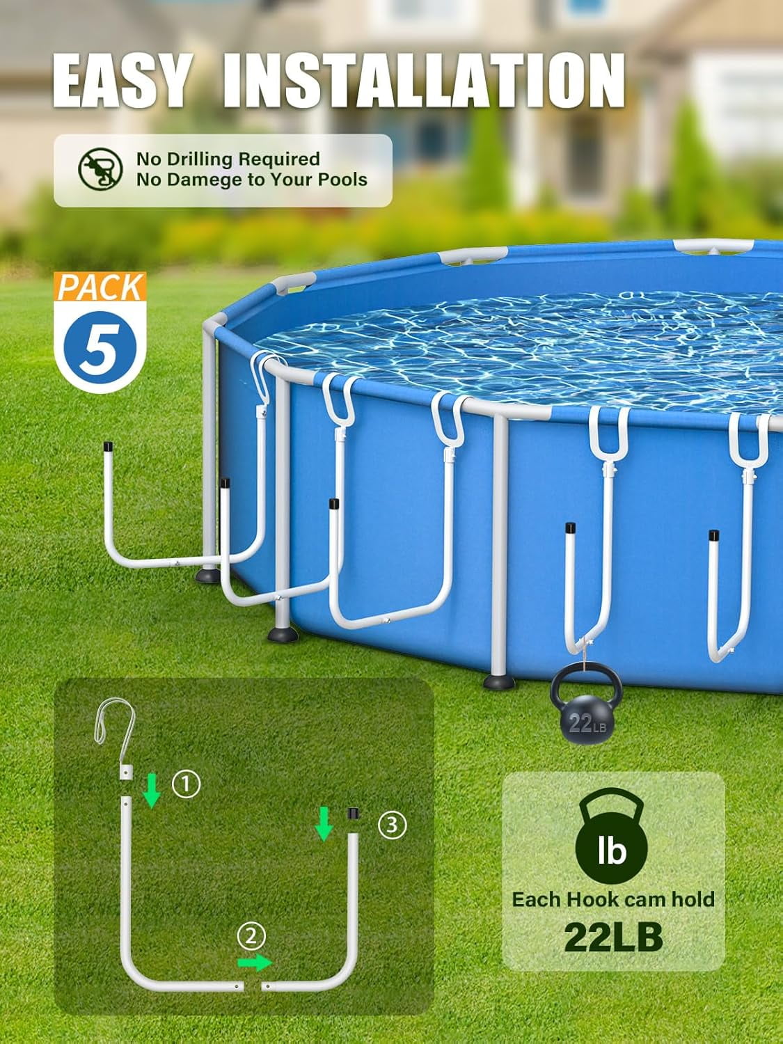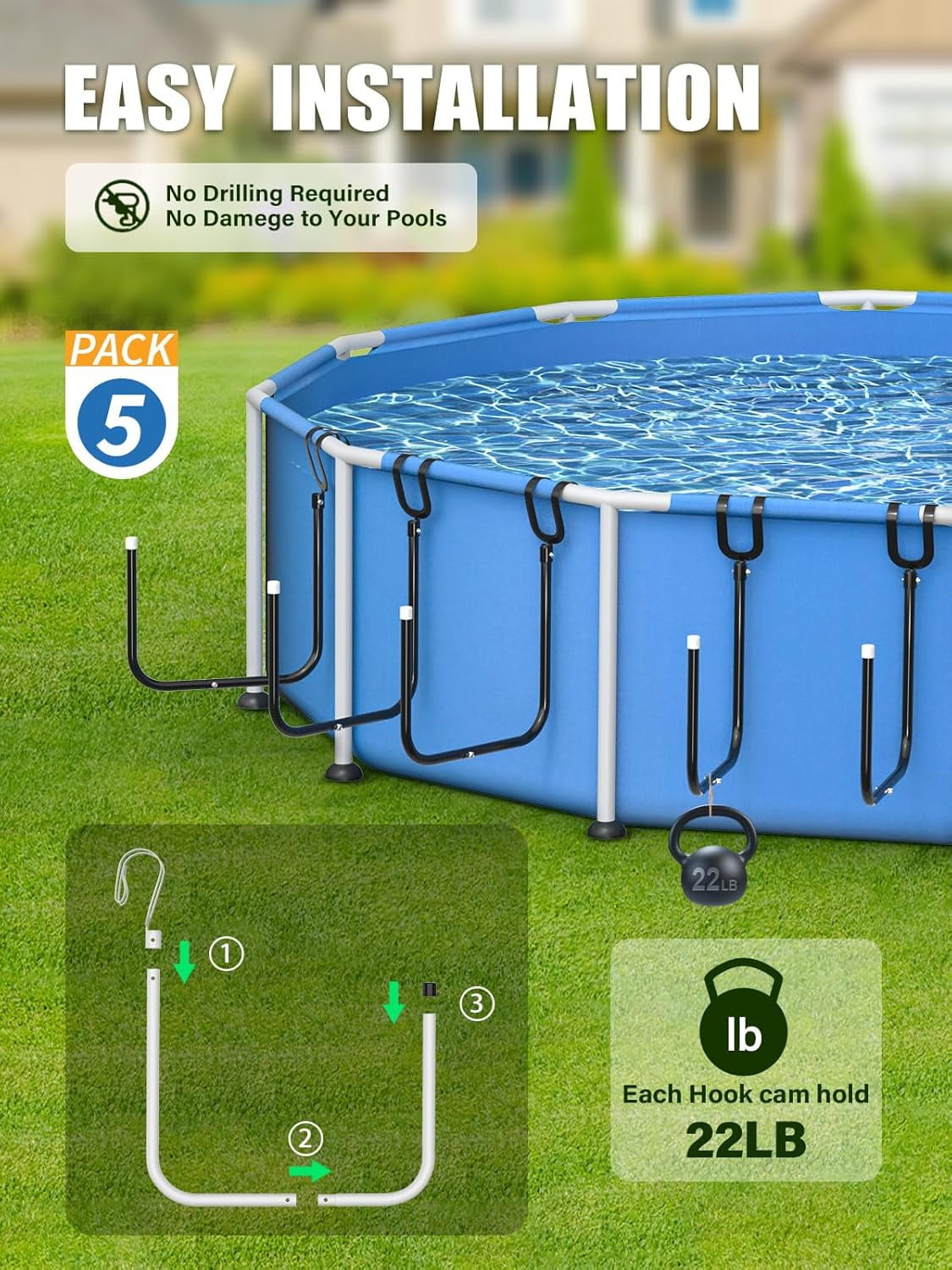 TOOL-FREE INSTALLATION: No drilling into the pool, no extra tools needed. The installation of this above-ground pool solar cover holder is a breeze. Just need to install the cover hook and the Elastic hook can be adjusted to fit different types of pools, and then hook on the frame of the above-ground pool.