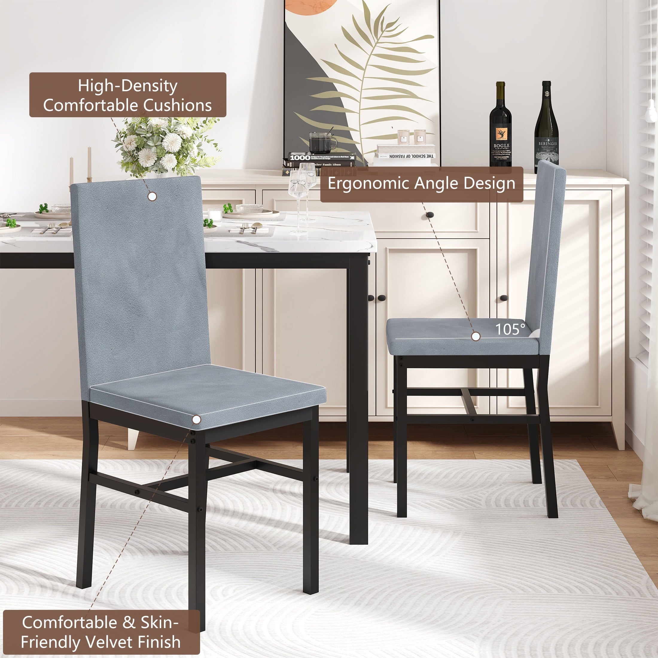 Solid Construction and Comfortable Chairs – The high-grade imitation marble pattern tabletop and durable metal ensure long-lasting durability and strong weight support. The high-density, comfortable cushions and skin-friendly velvet upholstered chairs with ergonomic design offer comfort. The table and chairs set are bound to add a certain amount of elegance to your home that you and your guests will absolutely love.