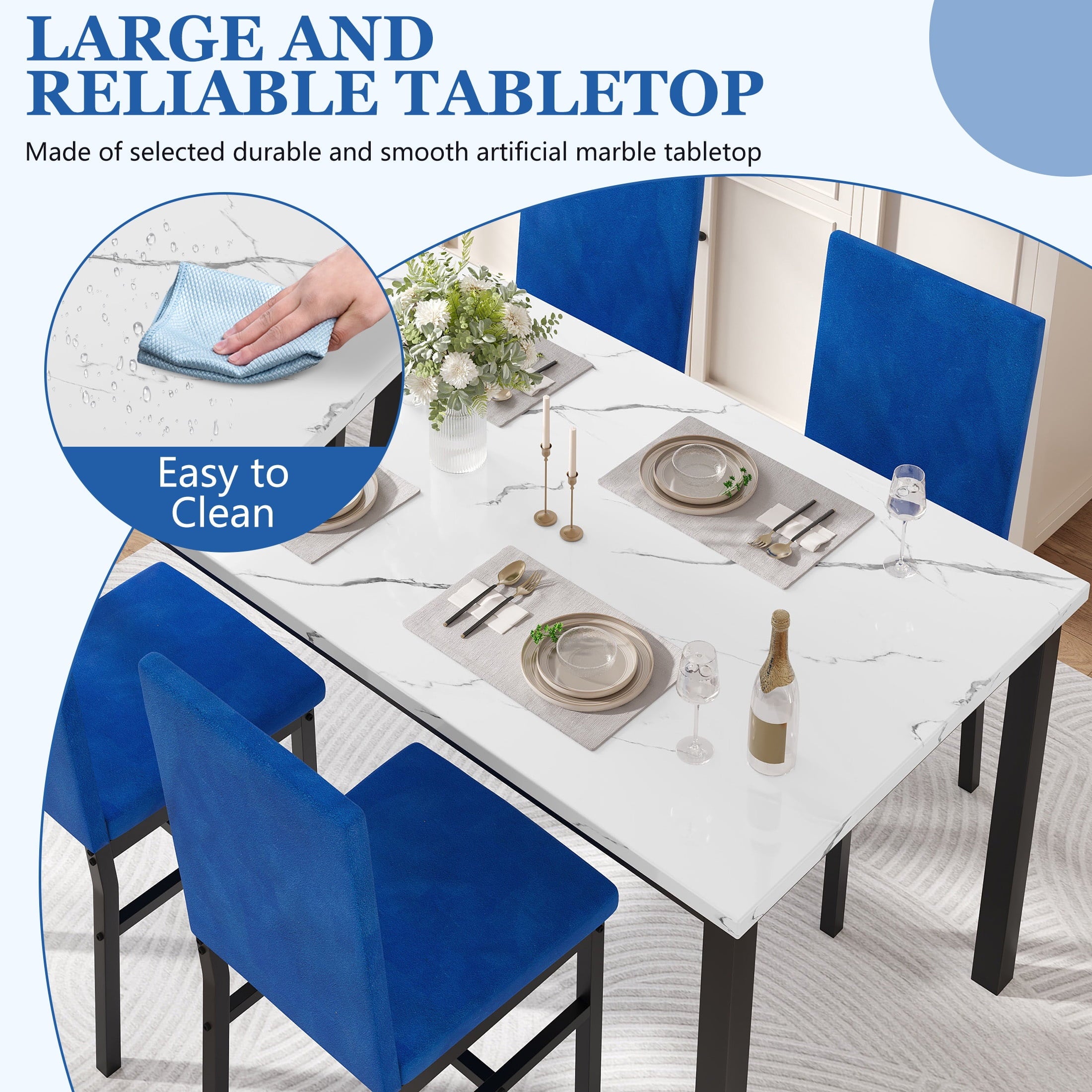Faux Marble Dining Table Set for 4 – The kitchen table and chairs set features an imitation marble finish with straight lines and a bright, shiny surface, adding a modern and elegant touch to the home and blending perfectly into any decor. This dining table set includes 1 marble dining table and 4 chairs, perfect for a home dining room or office use, with enough space for 4-6 people.