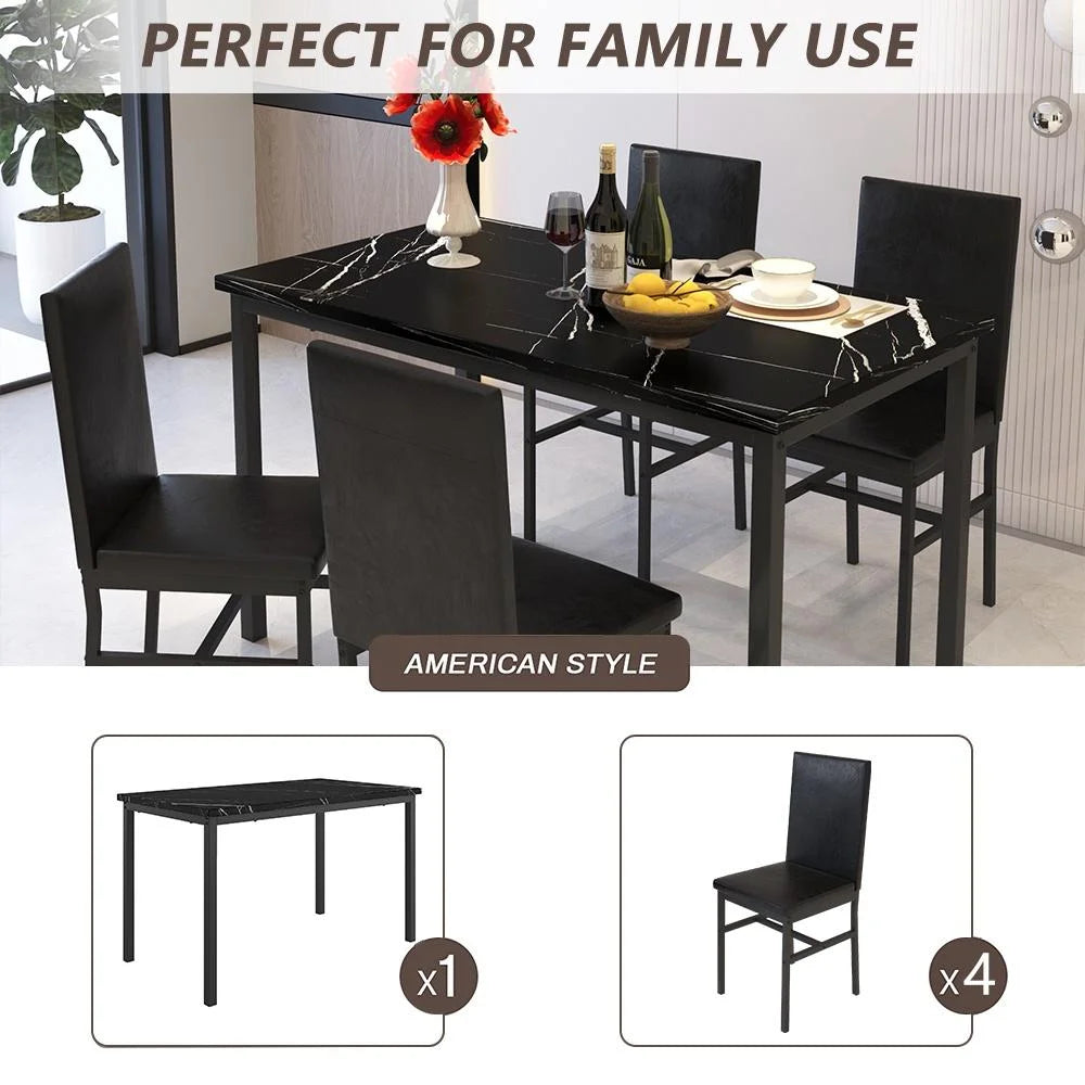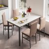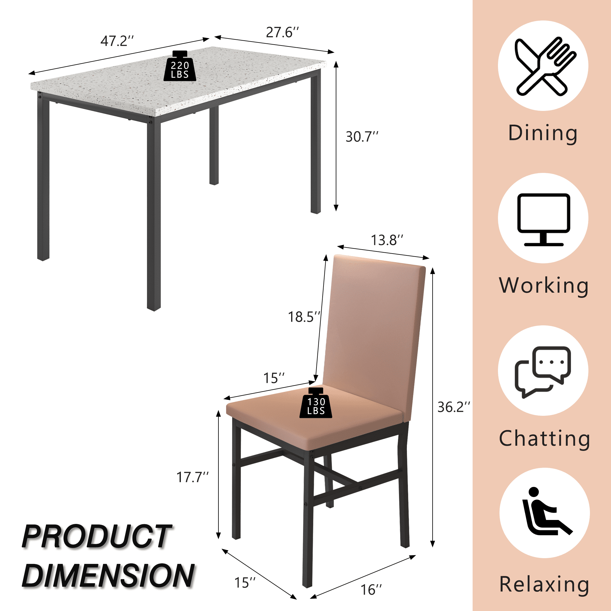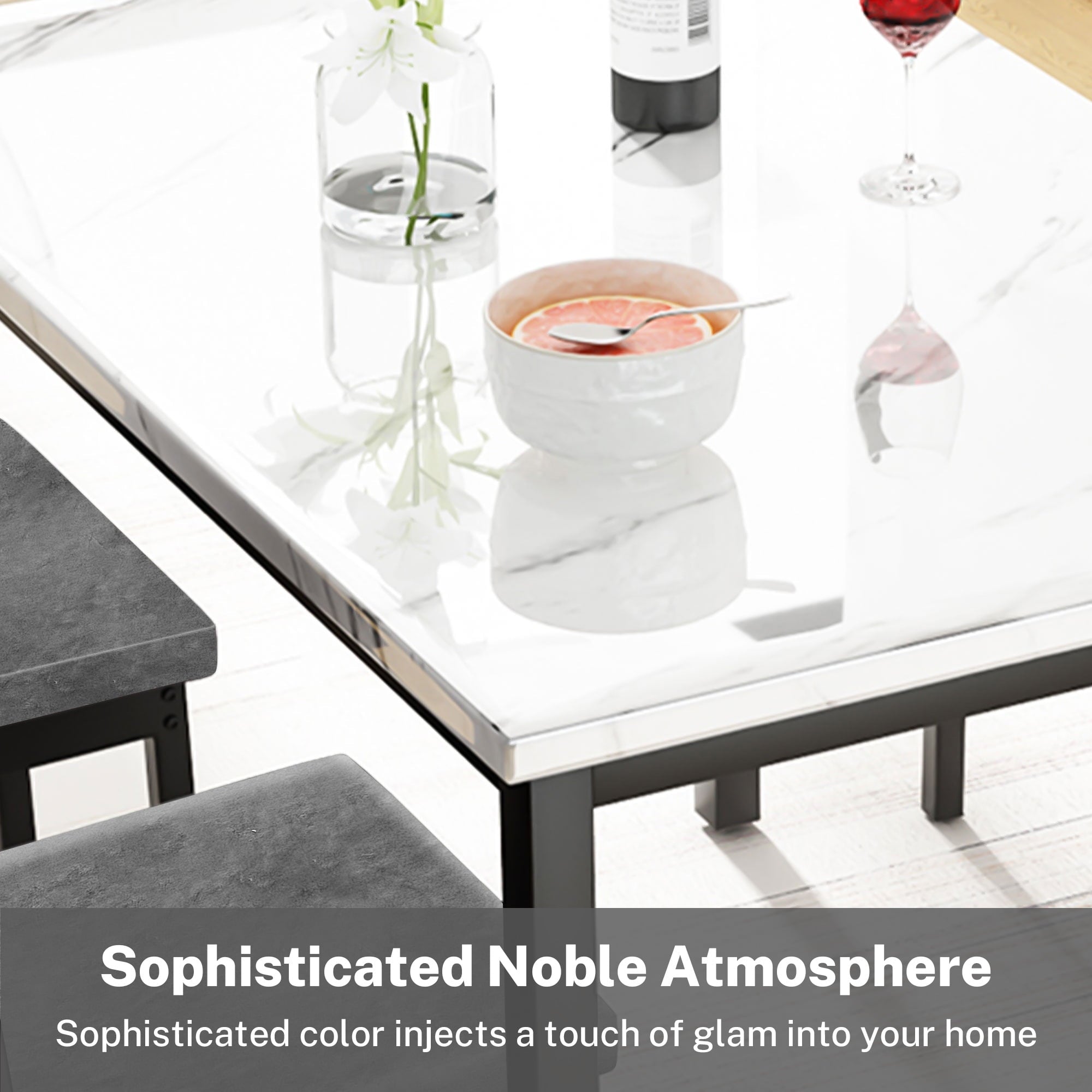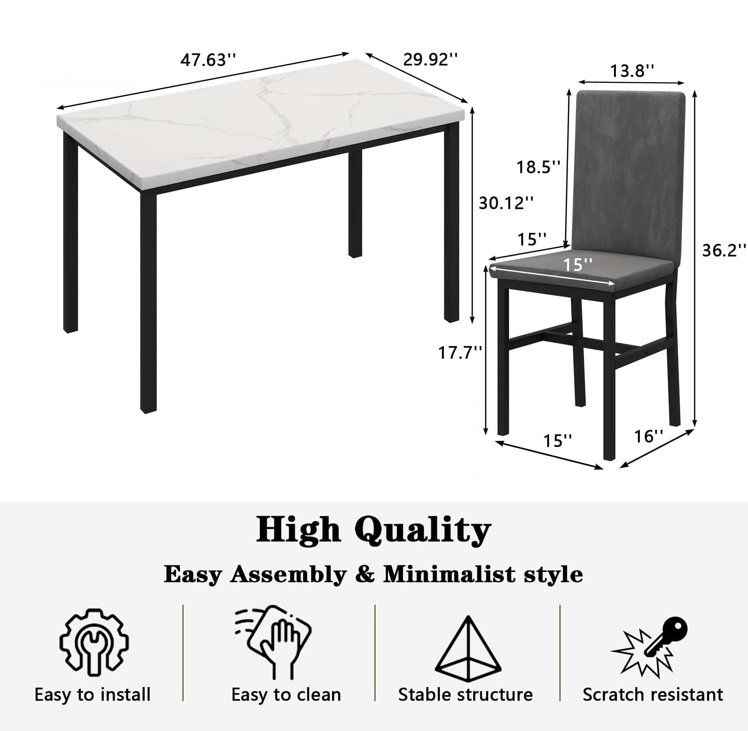 This 5-piece dining table set is ideal for you to spend a happy dining time with your family. The table with a faux marble countertop can add a touch of elegance and sophistication to your home. The dining chairs are decorated with soft cushions and durable velvet fabric, which would bring you an extra comfortable experience. Waterproof marble tabletop surface can be cleaned most easily when sprinkling or drinking water. And the legs are constructed with solid metal, offering durability that you can enjoy for several years. This dining table and chairs set is perfect for your kitchen, dining room, living room, and some small places.