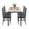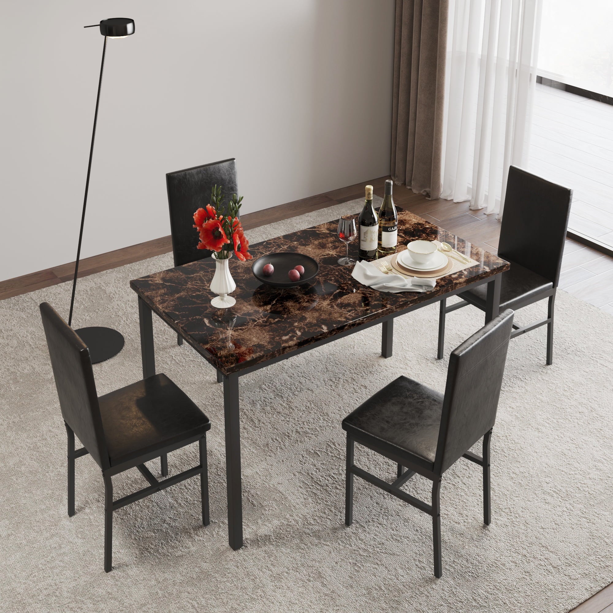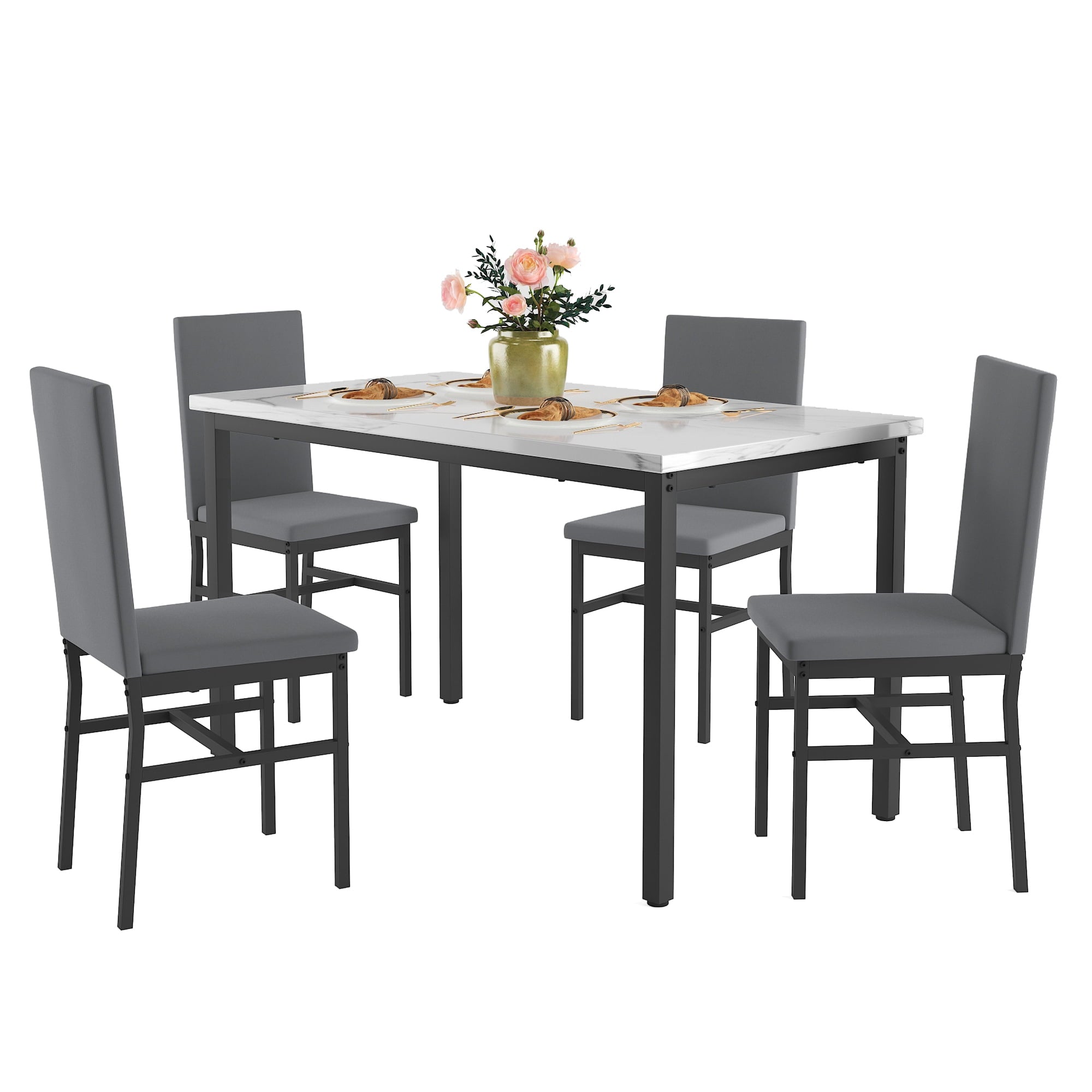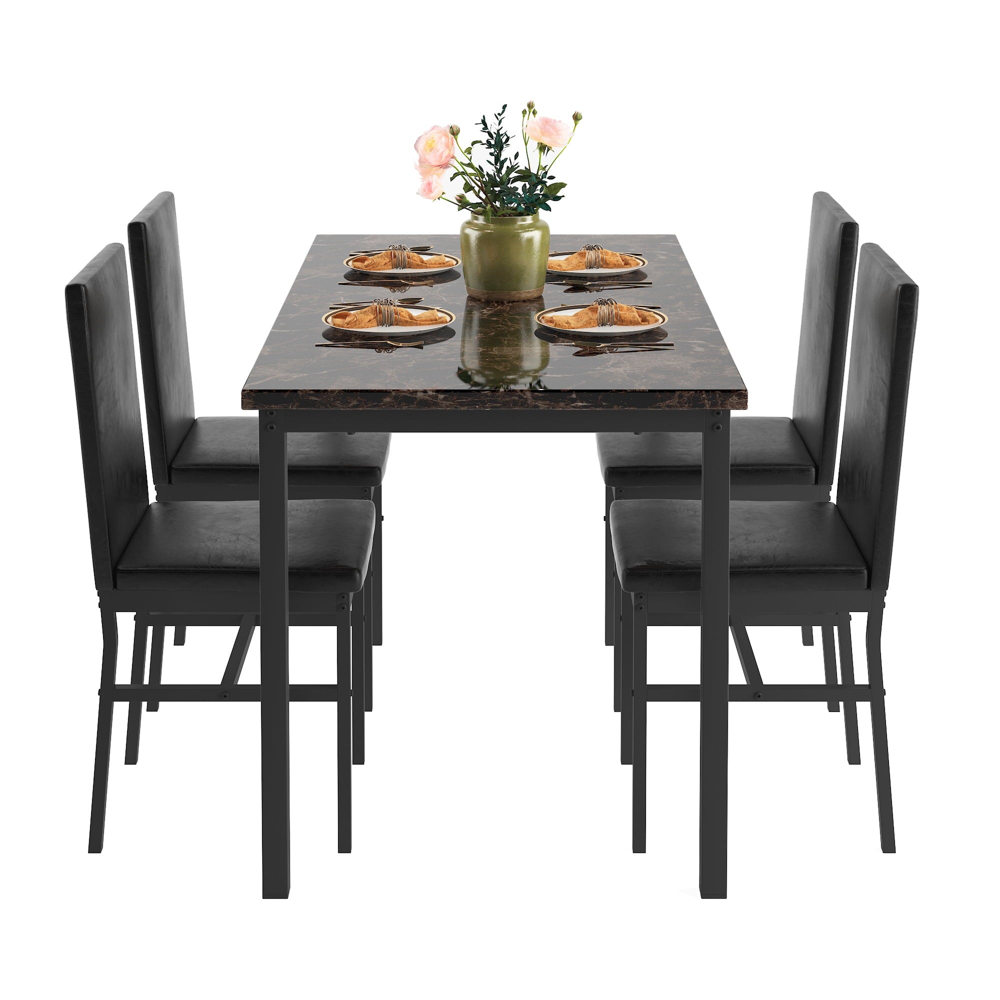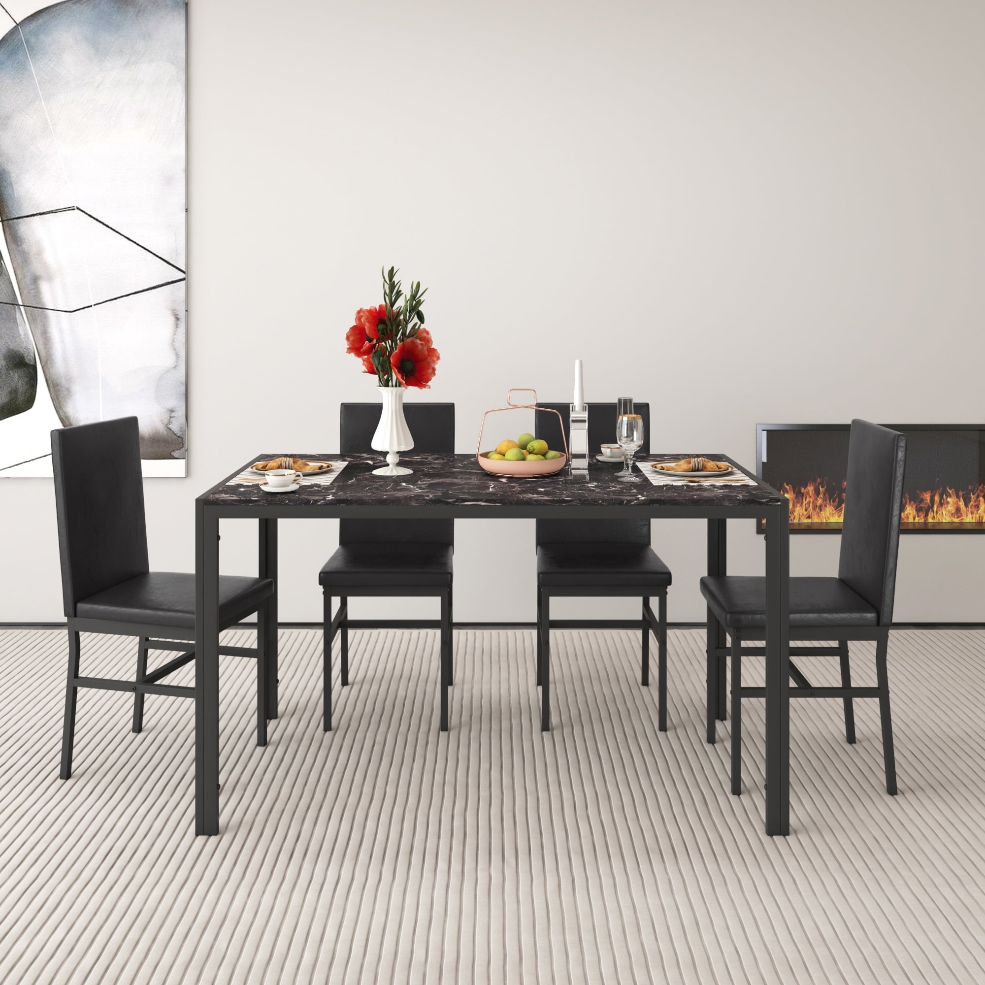 This 5-piece dining table set is ideal for you to spend a happy dining time with your family. The table with a faux marble countertop can add a touch of elegance and sophistication to your home. The dining chairs are decorated with soft cushions and durable velvet fabric, which would bring you an extra comfortable experience. Waterproof marble tabletop surface can be cleaned most easily when sprinkling or drinking water. And the legs are constructed with solid metal, offering durability that you can enjoy for several years. This dining table and chairs set is perfect for your kitchen, dining room, living room, and some small places.