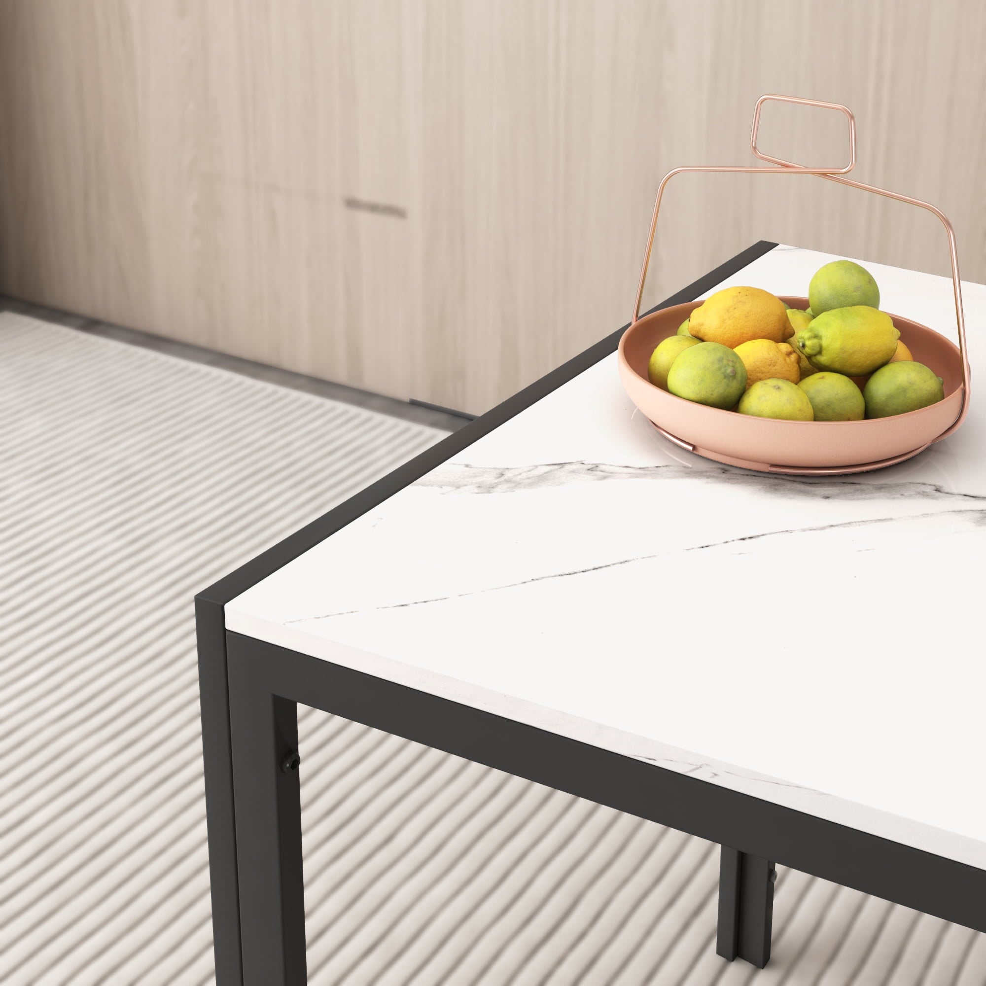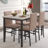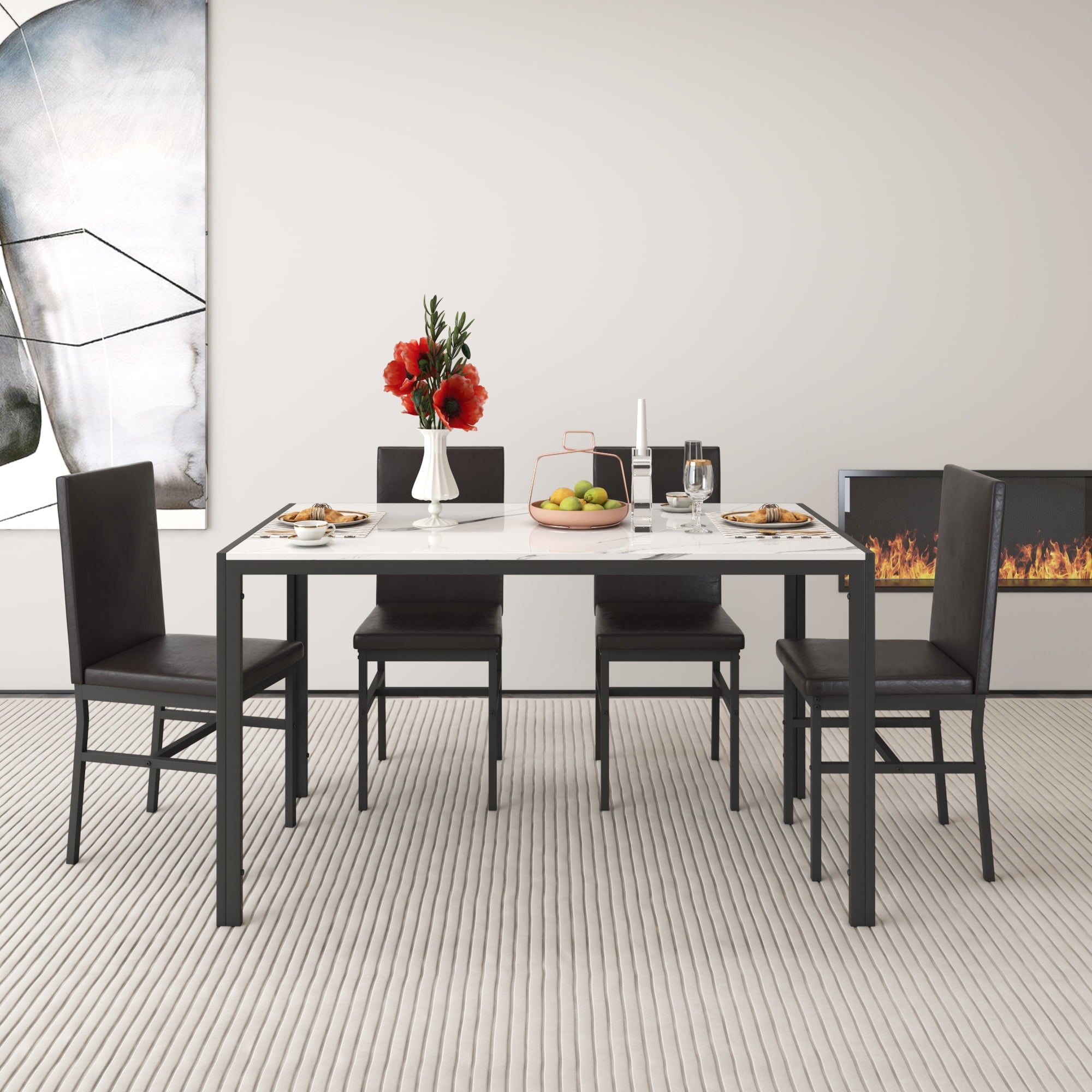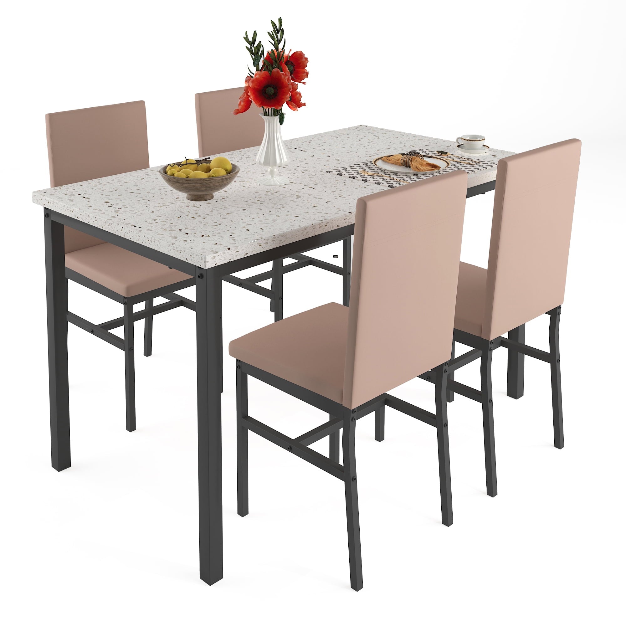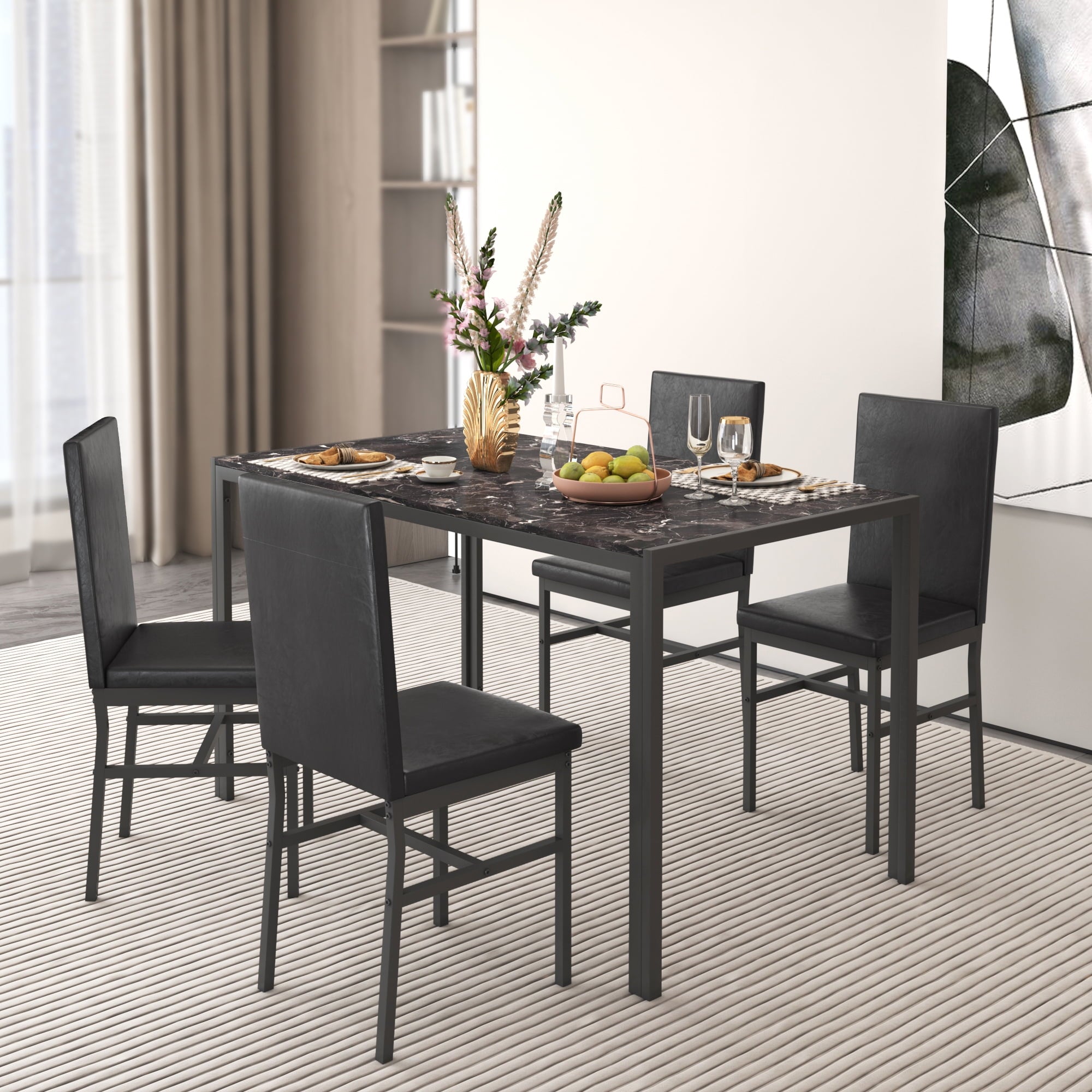 This 5-piece dining table set is ideal for you to spend a happy dining time with your family. The table with a faux marble countertop can add a touch of elegance and sophistication to your home. The dining chairs are decorated with soft cushions and durable velvet fabric, which would bring you an extra comfortable experience. Waterproof marble tabletop surface can be cleaned most easily when sprinkling or drinking water. And the legs are constructed with solid metal, offering durability that you can enjoy for several years. This dining table and chairs set is perfect for your kitchen, dining room, living room, and some small places.
