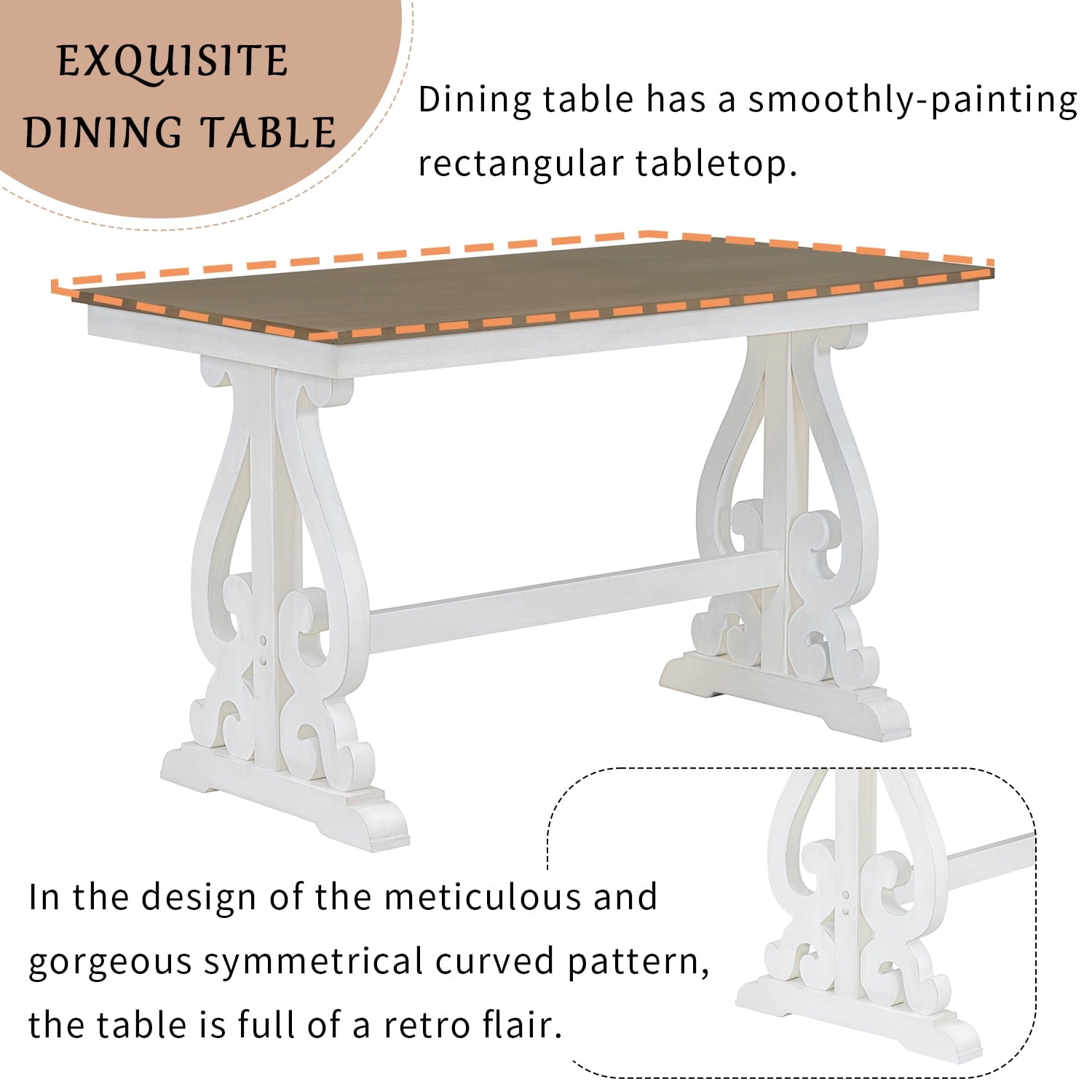 The Special design of the tabletop shows elegance and care. Polished edges are curved to ensure that all sides are smooth to the touch. Featuring a tabletop that is subtly larger than the apron, the two-layer design effortlessly enhances the rustic aesthetic and showcases the table’s impeccable quality. With a large tabletop and solid table legs, this set is ideal for your home.