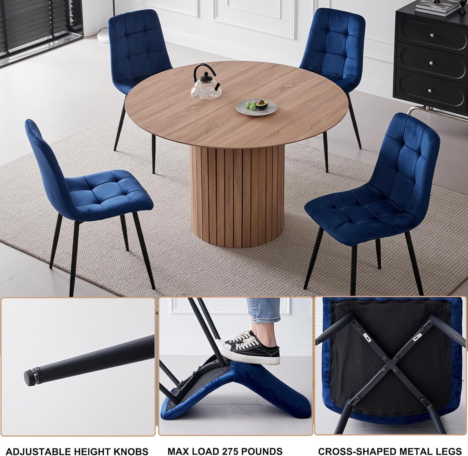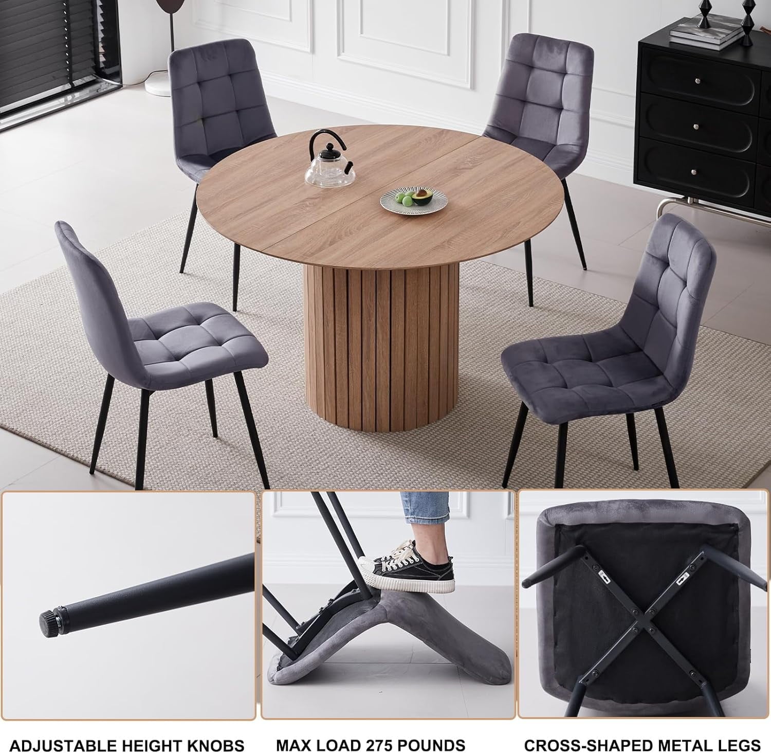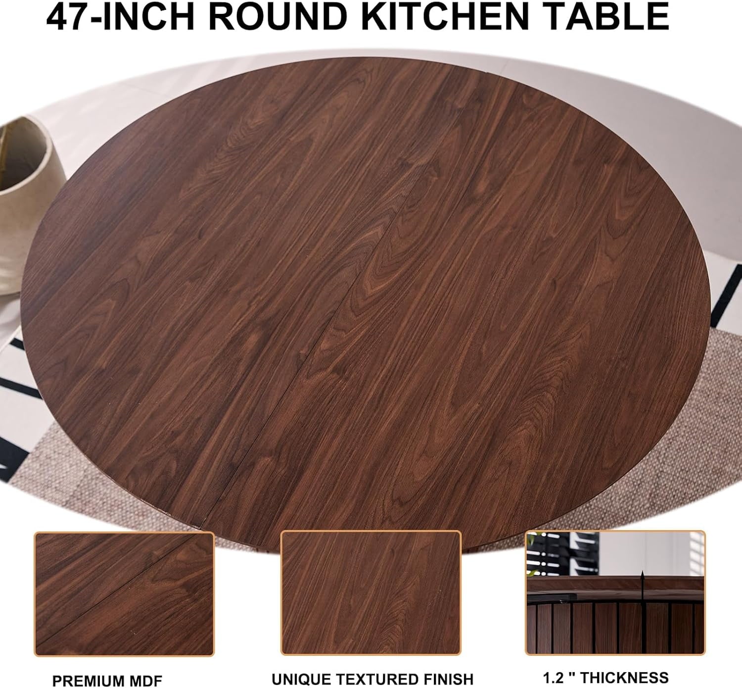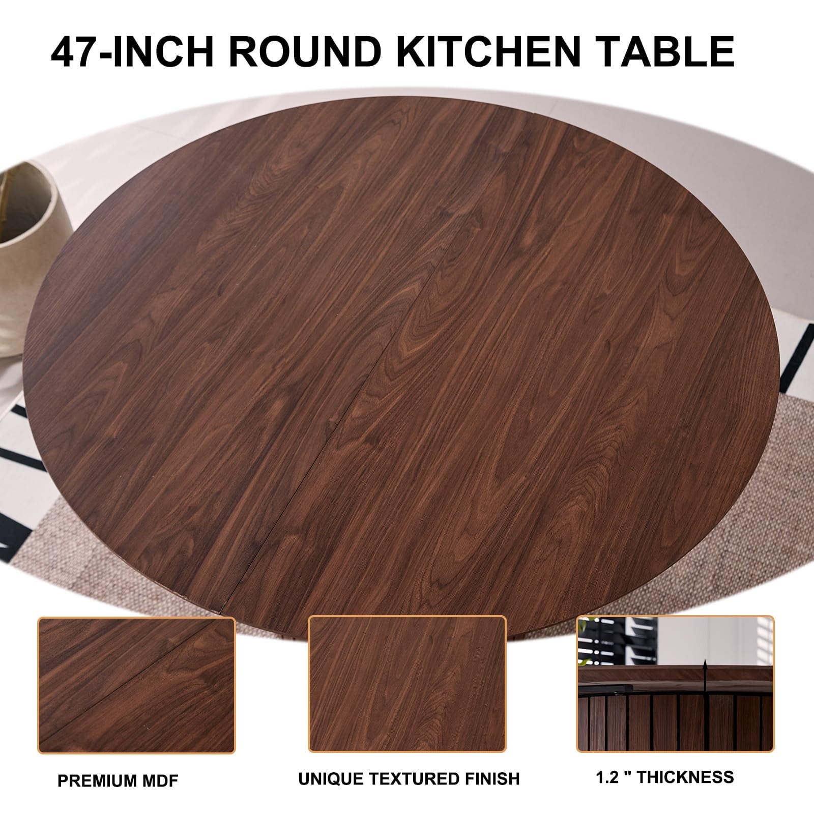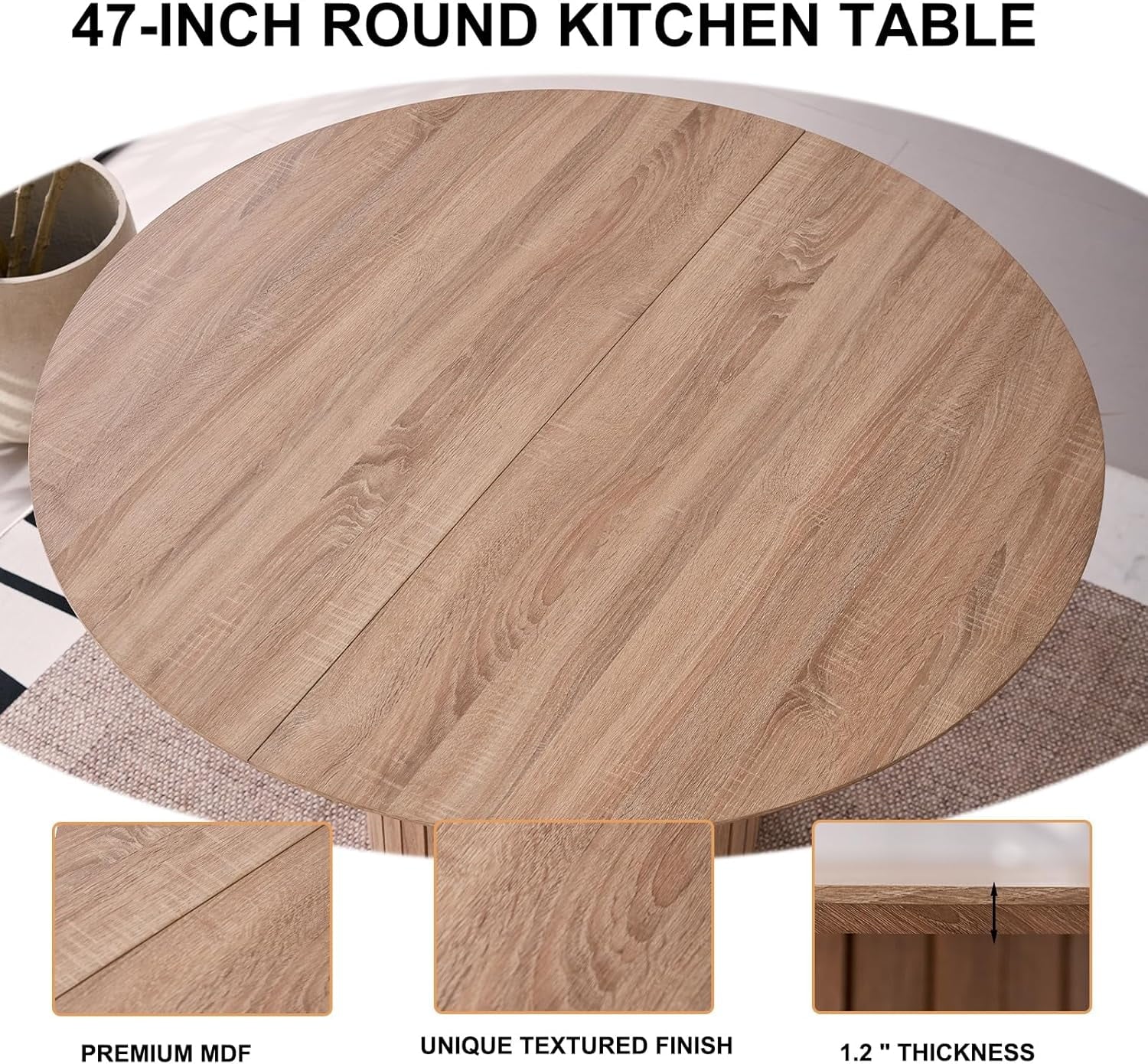 Premium Round Table: Round kitchen table is crafted from premium MDF. This table not only boasts a unique textured finish that complements any home decor style but also offers exceptional stability. It is heat-resistant, scratch-resistant, and waterproof.