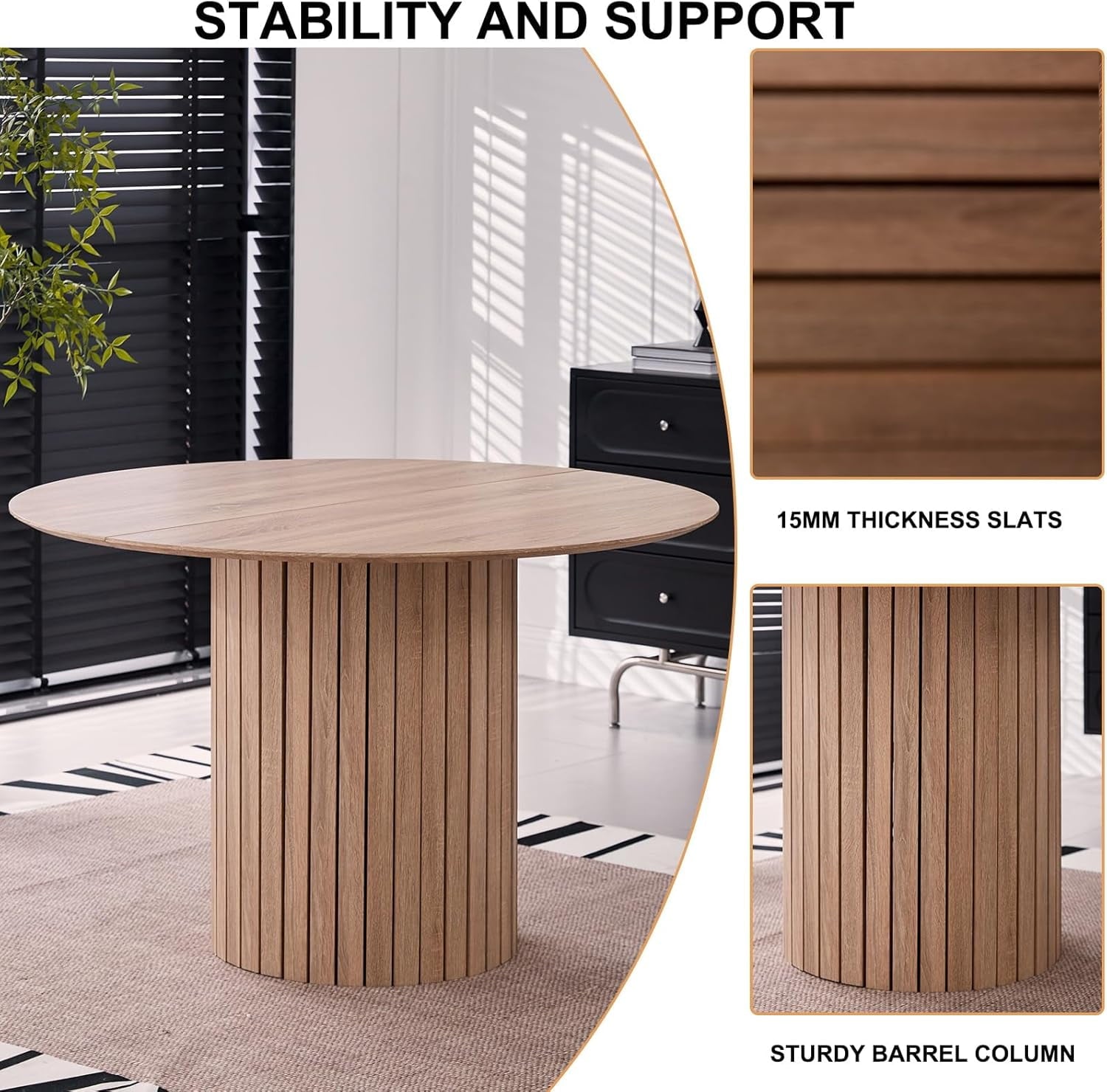 Sturdy Industrial Barrel Column Design: The dining table features a sturdy (Diameter of 20.5 Inches)barrel column surrounded by 15mm thickness slats wooden strips, providing stability and support for years to come.