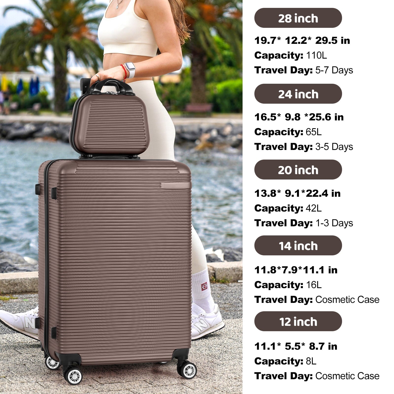 Three piece set including the following luggage sizes: 20 inches, 24 inches and 28 inches Plus 12 inch and 14-inch Makeup Bag