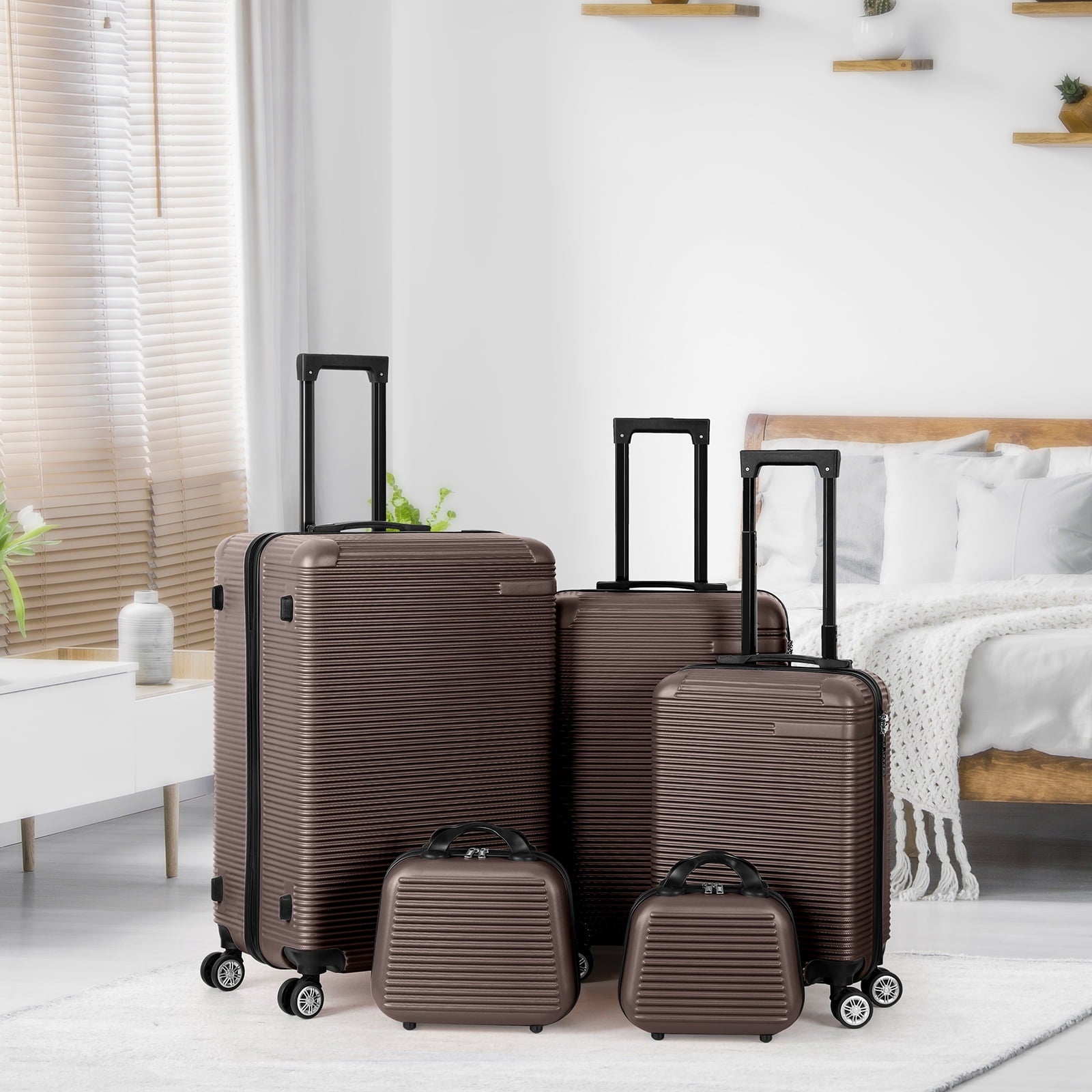 5 Piece Travel Luggage Set, 12″ 14″ 20” 24″ 28” Expandable Lightweight Suitcase with Noise-free Double Spinner Wheels & TSA Lock, ABS Hardshell Suitcase for Vacation, Brown