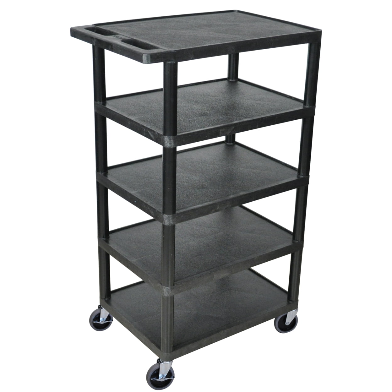 Hold up to 300 lbs. on five durable shelves that won’t scratch, dent, stain or rust. This strong, easy-rolling five-shelf cart offers true multi-tiered utility. With 8.5″ of space between each flat shelf, you can fit a wide variety of contents or supplies. The 4″ casters easily roll the cart, and with two locking brakes, you can quickly stabilize the cart. Multipurpose lightweight utility cart. Shelves and legs are constructed of an injection-molded thermoplastic resin that will not stain, scratch, dent or rust. Includes five flat shelves with .25″ retaining lip to secure items