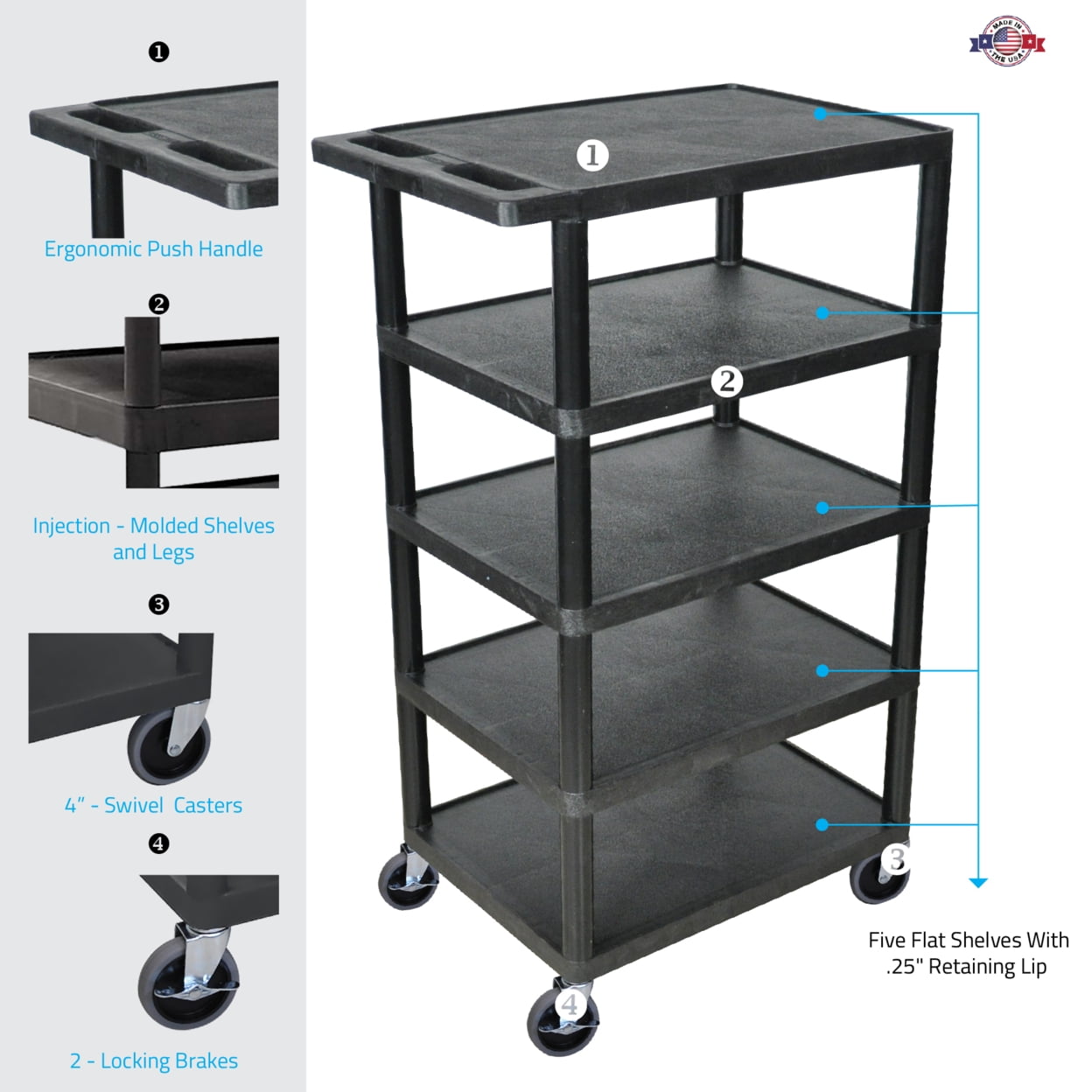 - Includes five flat shelves with .25″ retaining lip to secure items