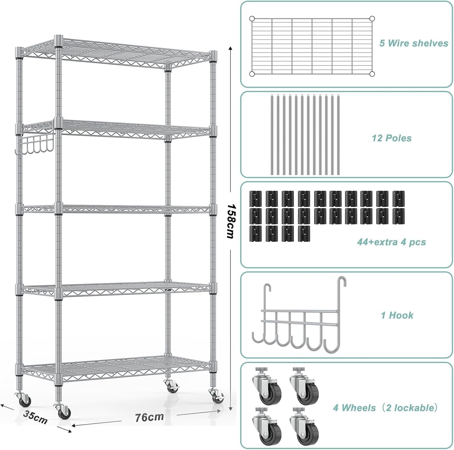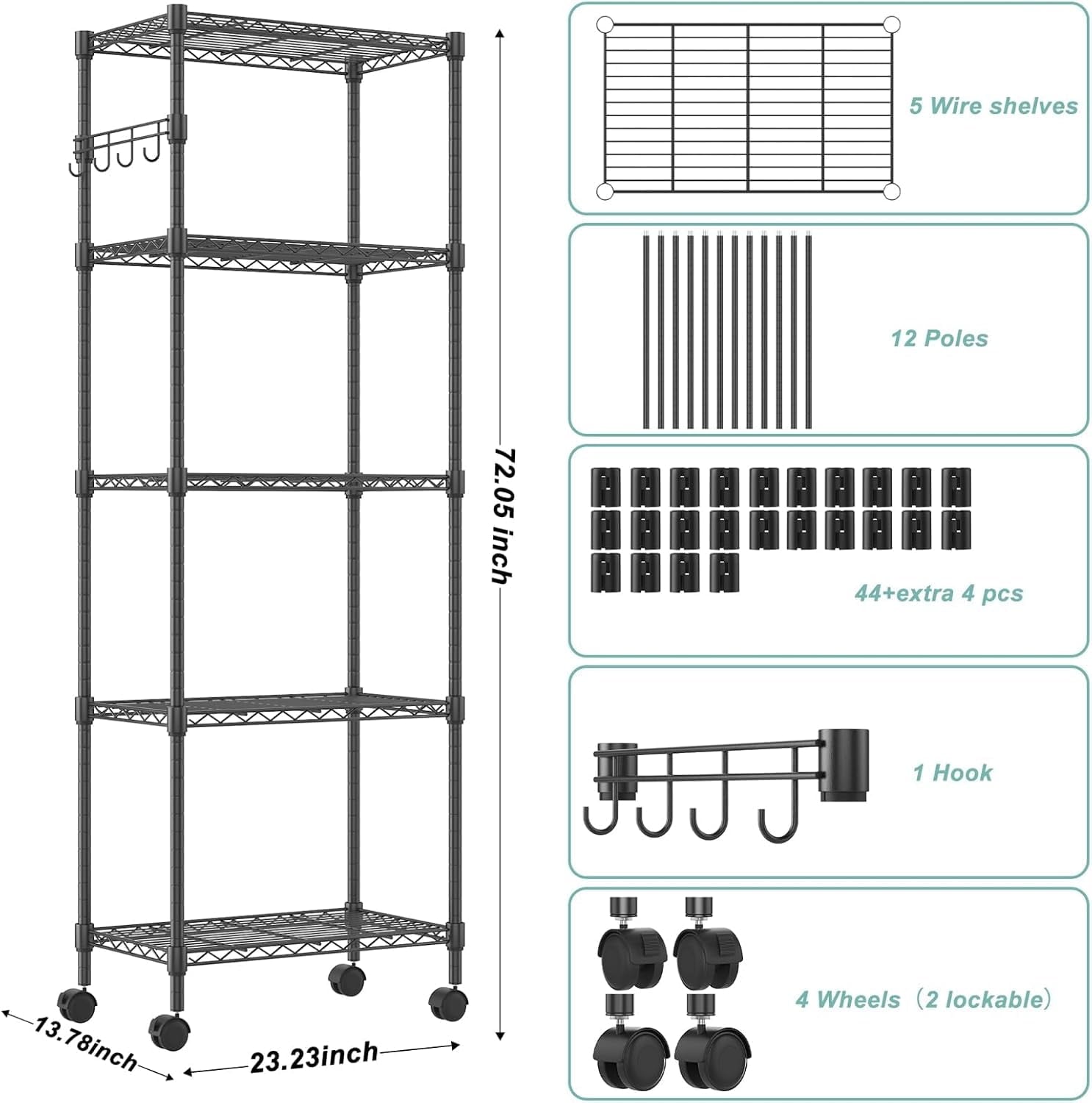 - 【Smart Storage Shelf】The 5-tier metal shelves (29.92”W x 13.78”D x 62.2”H) can provide additional storage space without occupying too much space. The storage shelves can be placed in kitchens, bathrooms, rooms, living rooms, warehouses, offices, industrial, commercial exhibitions, hotels, supermarkets, etc