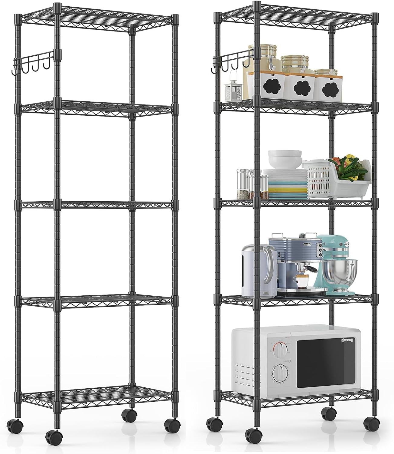 Experience the power of personalized organization with our 5-tier heavy-duty wire shelving unit. Its adjustable shelves allow you to create dedicated spaces for large household appliances and small knick-knacks alike. Embrace the freedom of customizable storage and transform your space with this versatile wire shelving system. Enjoy the joy of a well-organized life with our tailor-made solution to perfectly fit your unique storage needs!