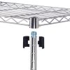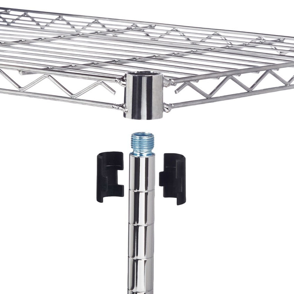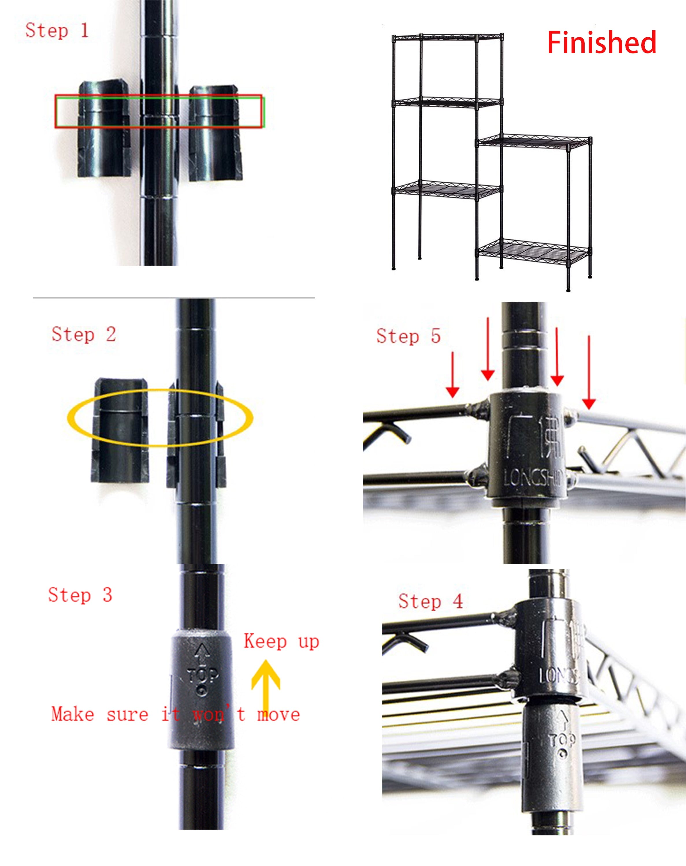 Super easily to install and no tools required; The height of wire shelves are adjustable in 1-inch increments with slip-sleeves depending on your needs. Recommends: Make sure the plastic clips “TOP” are facing up and the wire shelving unit cover the plastic clips completely for your safety.
