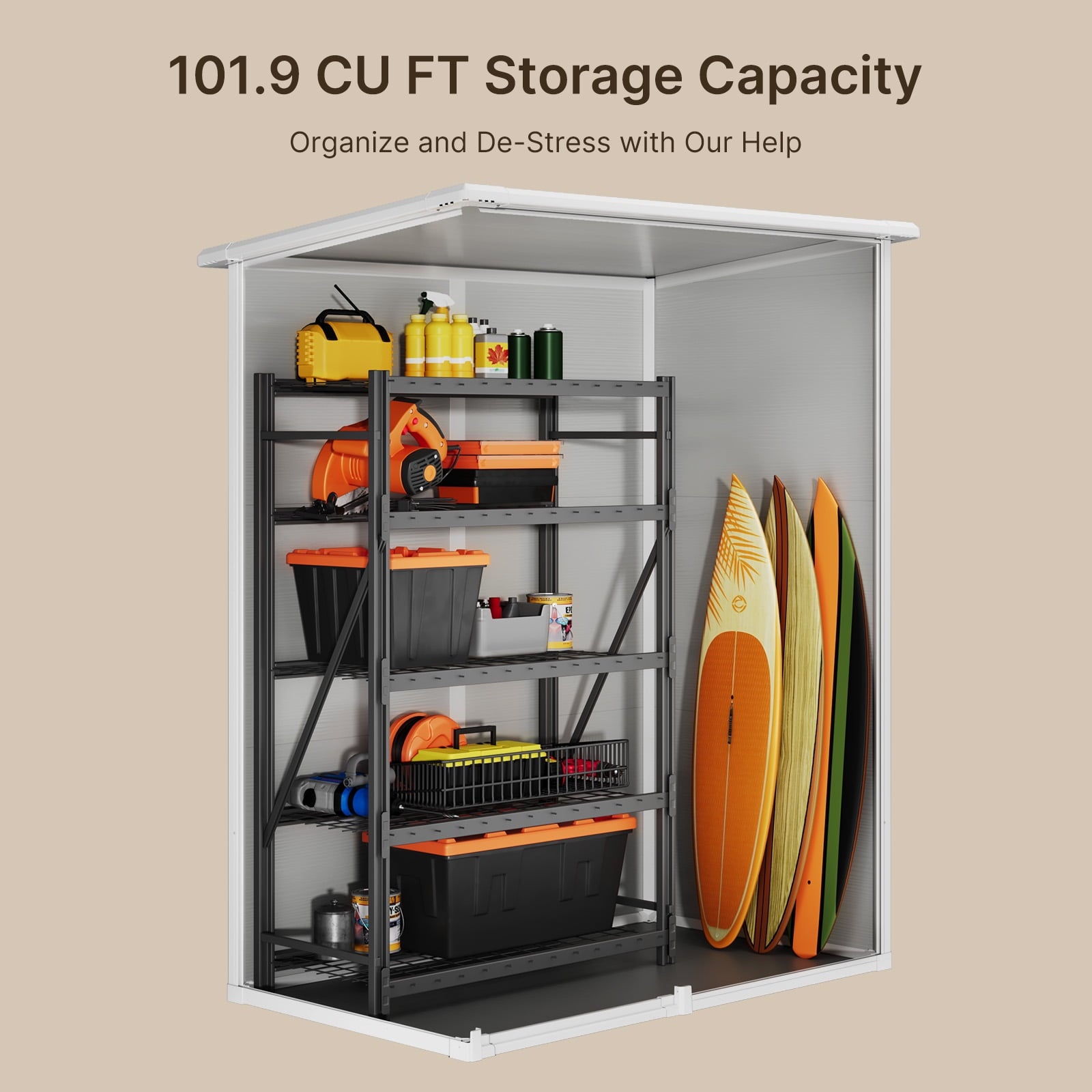 • Spacious Haven for Your Belongings: With a roomy 5X3 ft design and a remarkable 101.9 cubic feet of storage space, this outdoor storage shed is perfect for all your outdoor treasures! From grills and bicycles to lawn chairs and gardening tools, your backyard essentials will have a neat and organized home, helping you get ready for family gatherings or outdoor adventures with ease!