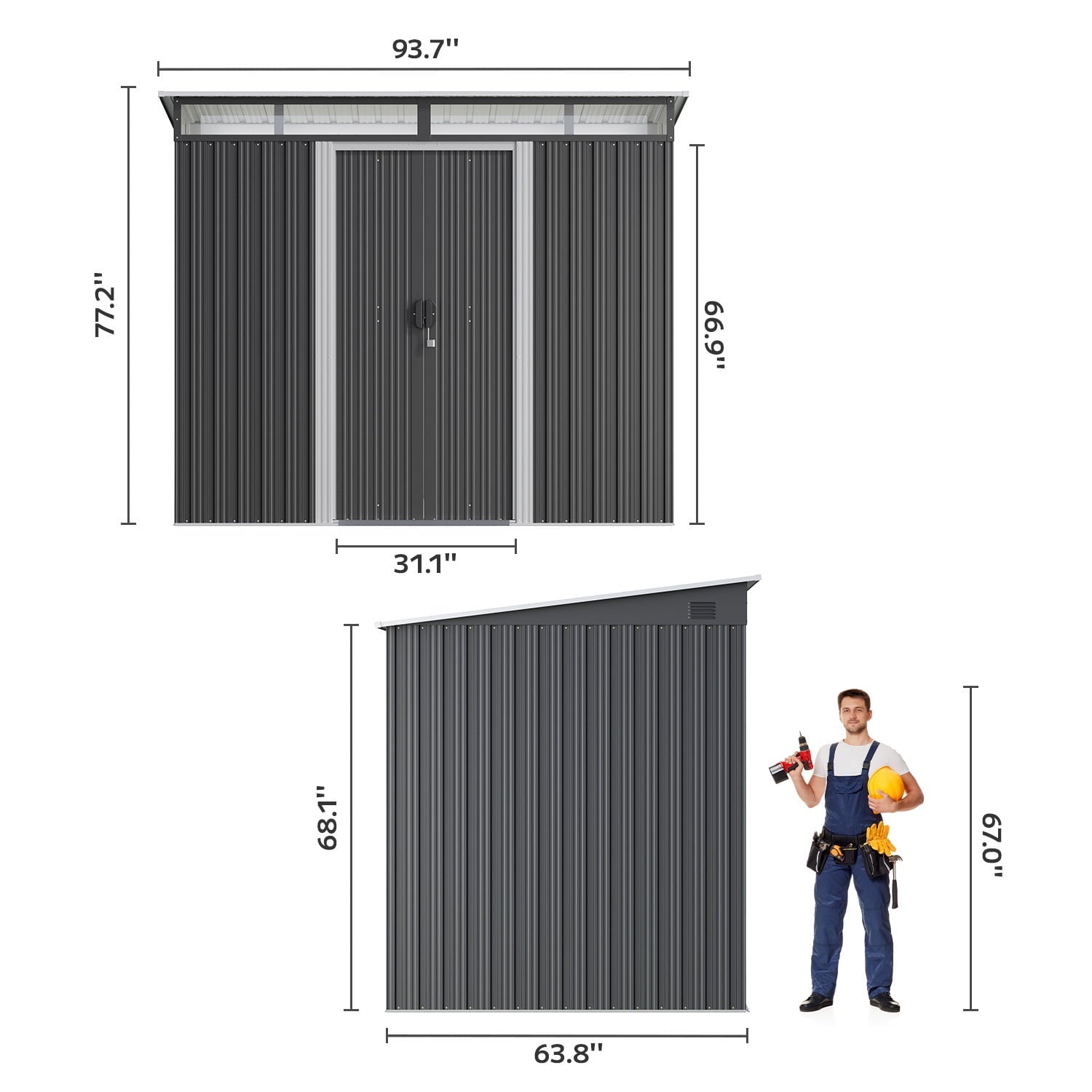🌼【Multifunctional outdoor storage shed】Product size:93.7″D x 63.8″W x 77.2″H.. This metal shed has multiple uses. In addition to regular tool storage, it can also be used in pet rooms, garbage rooms