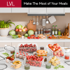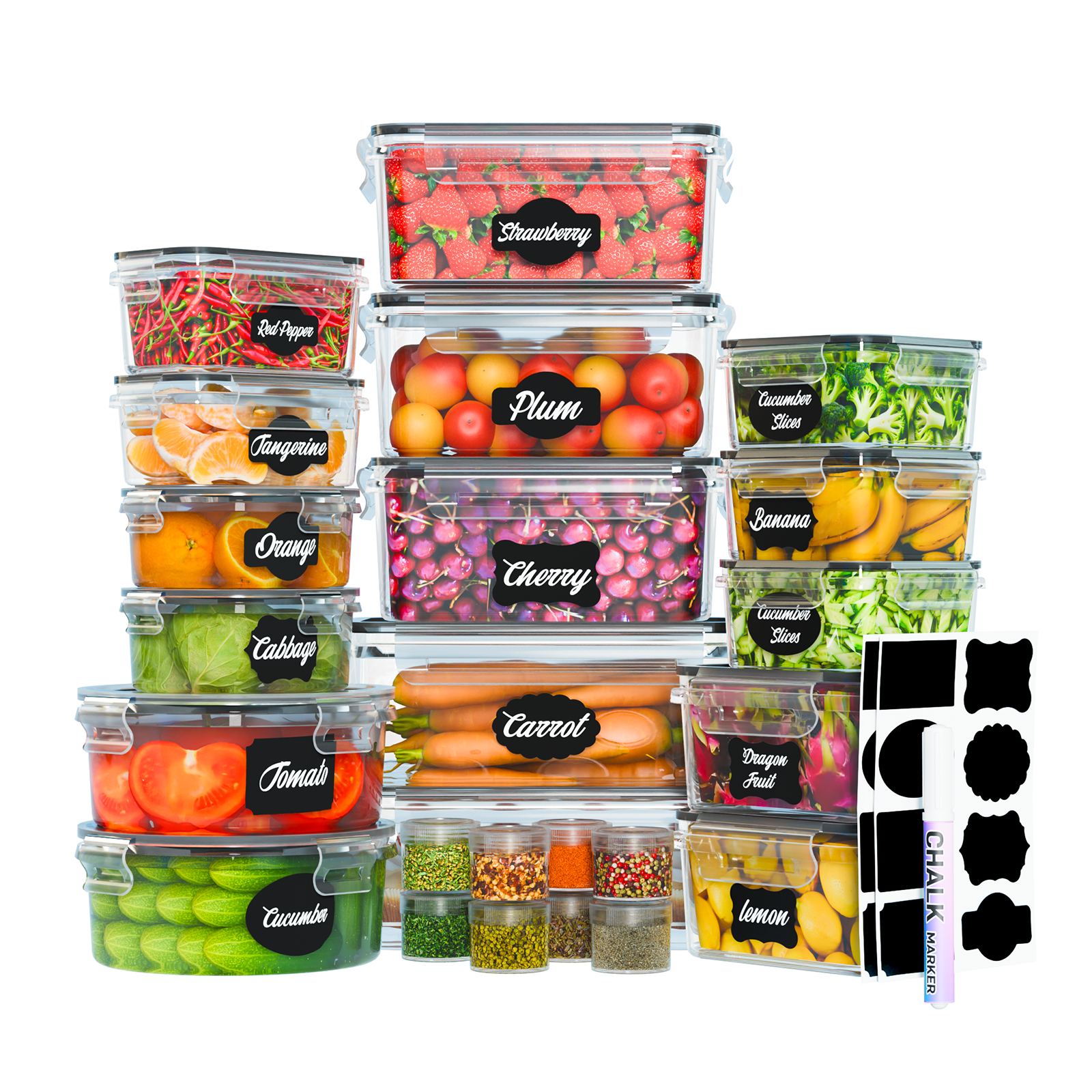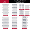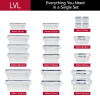 Includes 24 containers and 24 lids in 10 various useful sizes: (2) 33.8 oz rectangular containers, (3) 28.4 oz rectangular containers, (2) 23.6 oz round containers, (2) 18.5 oz rectangular containers, (3) 11.8 oz rectangular containers, (1) 10.8 oz rectangular container, (1) 10.1 oz round container, (1) 8.1 oz rectangular container, (1) 8.1 oz round container, (8) 1.2 oz dressing cups. Plus, sticky labels and chalk pen.
