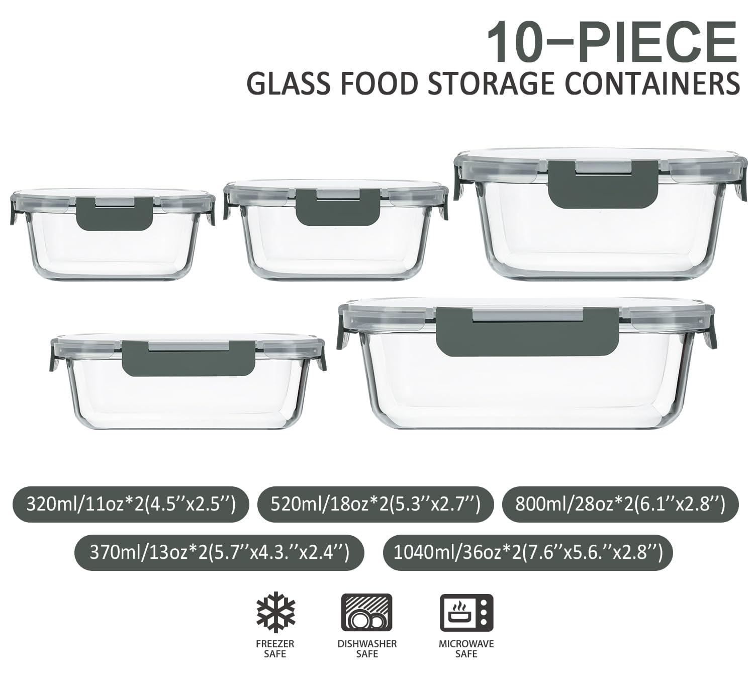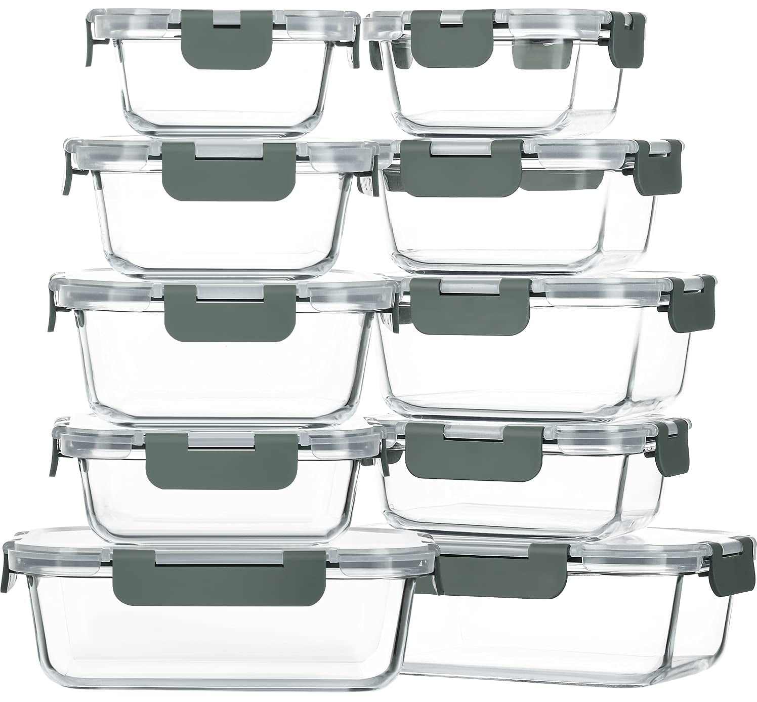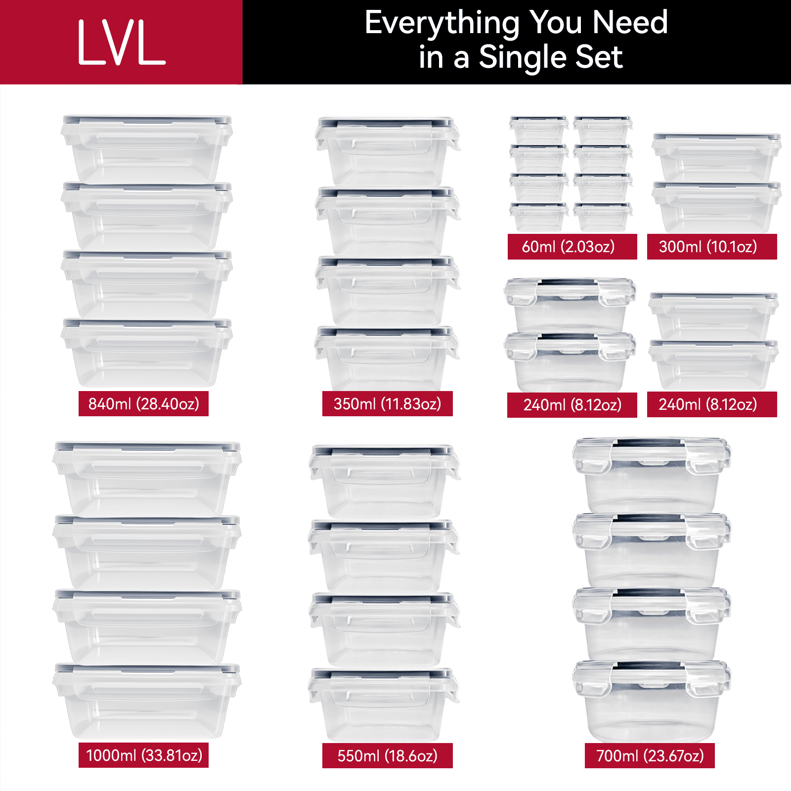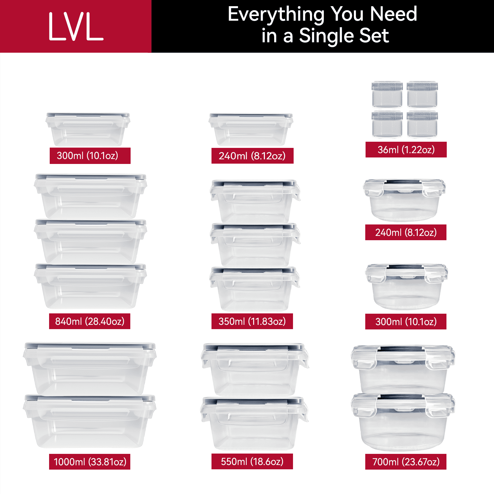 - Includes 24 containers and 24 lids in 10 various useful sizes: (2) 33.8 oz rectangular containers, (3) 28.4 oz rectangular containers, (2) 23.6 oz round containers, (2) 18.5 oz rectangular containers, (3) 11.8 oz rectangular containers, (1) 10.8 oz rectangular container, (1) 10.1 oz round container, (1) 8.1 oz rectangular container, (1) 8.1 oz round container, (8) 1.2 oz dressing cups. Plus, sticky labels and chalk pen.