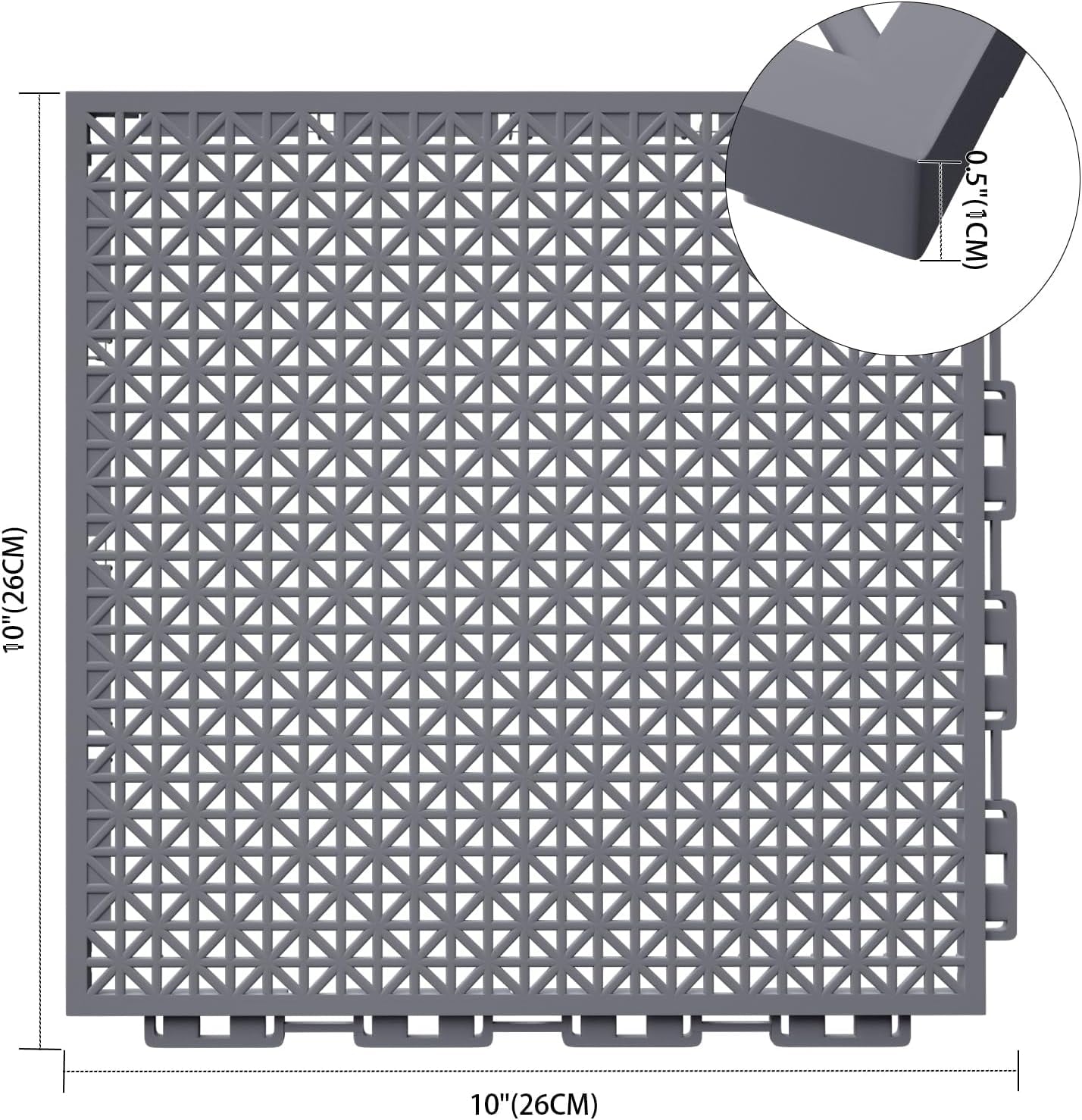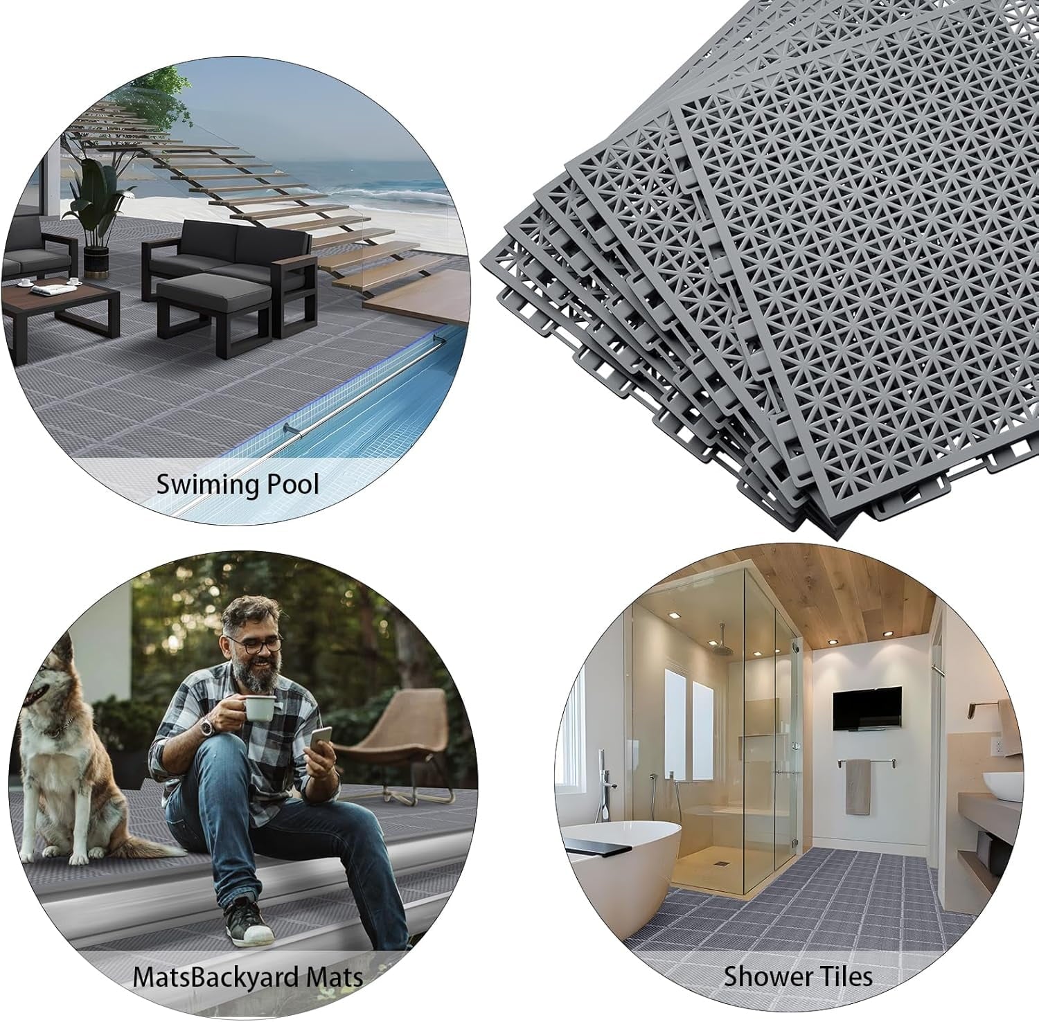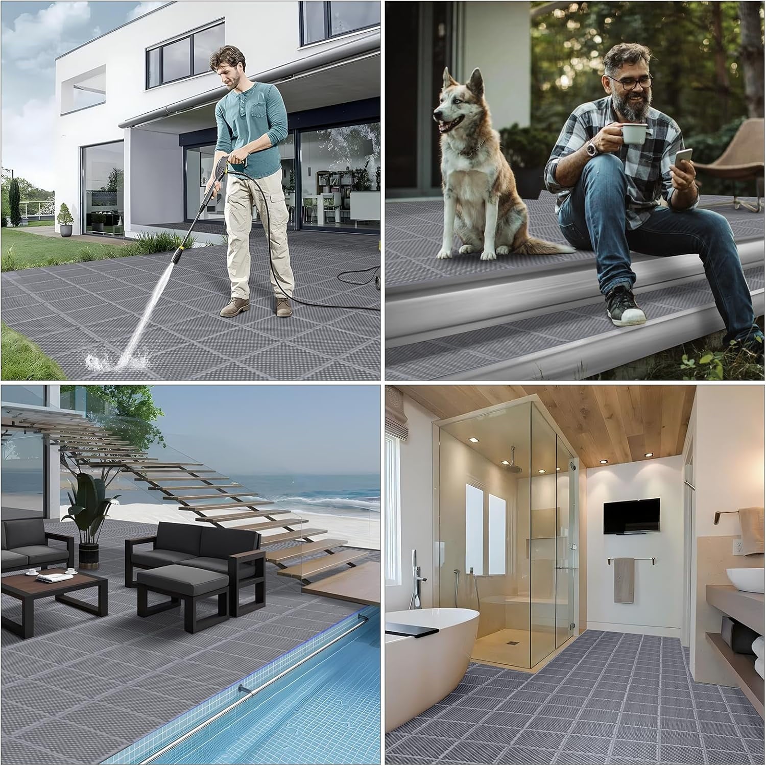 • Widely Used: Our interlocking floor tile system with drainage holes is resistant to well water and ultraviolet radiation, which can be widely used indoors and outdoors. You can use it indoors, such as swimming pool, shower room, balcony, bathroom, kitchen, etc., and can also be used in various outdoor places, such as terraces, boat decks, dog kennels, workstations, courtyards, saunas, RV and other places, so that you no longer worry about the problem of slippery ground