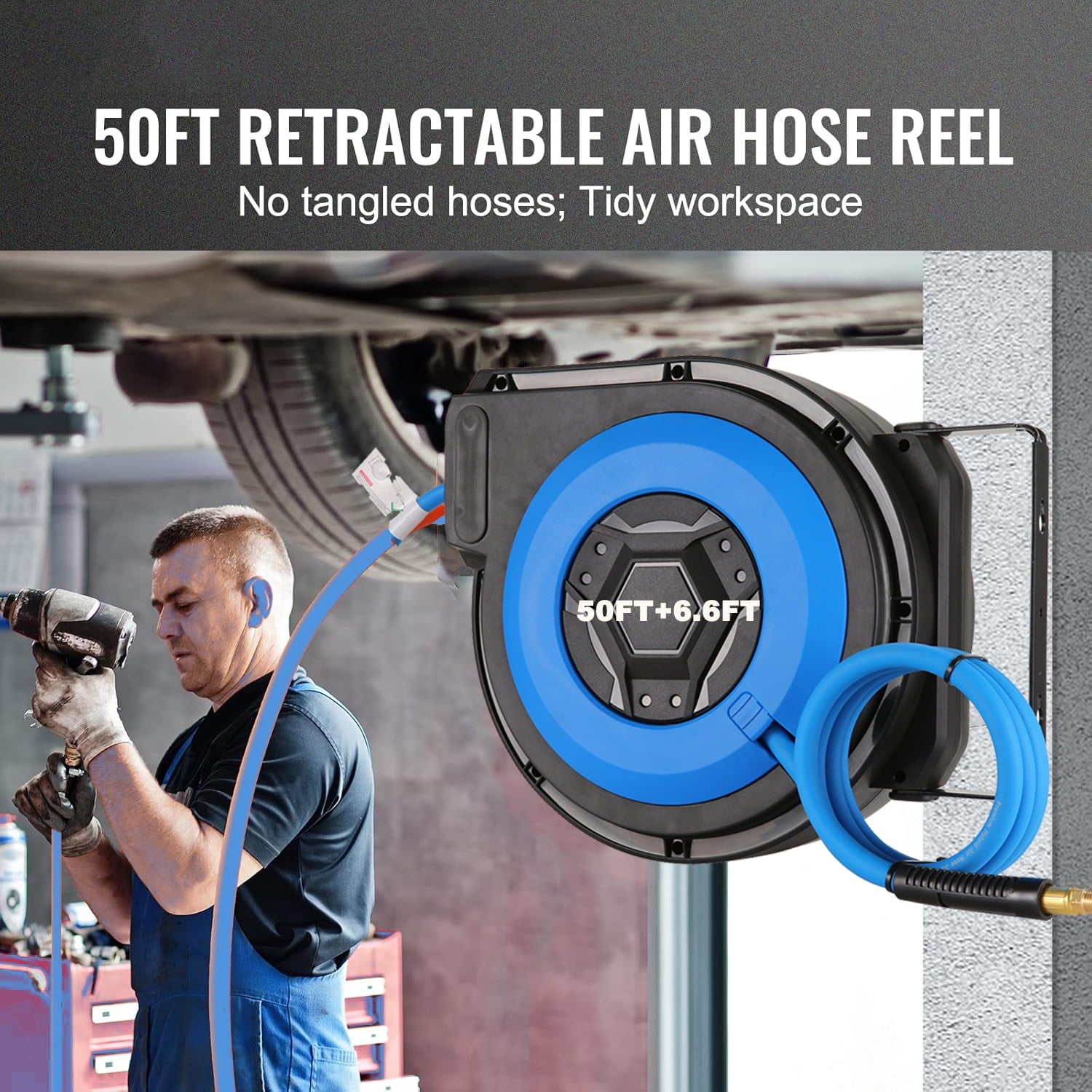 【Retractable Hybrid Air Compressor Hose Reel】 air hose with a 50 + 6.6ft oil and abrasion-resistant air hose that offers all-weather flexibility with a temperature range from -13 to 131 ℉, making it ideal for year-round use, including cold winters.