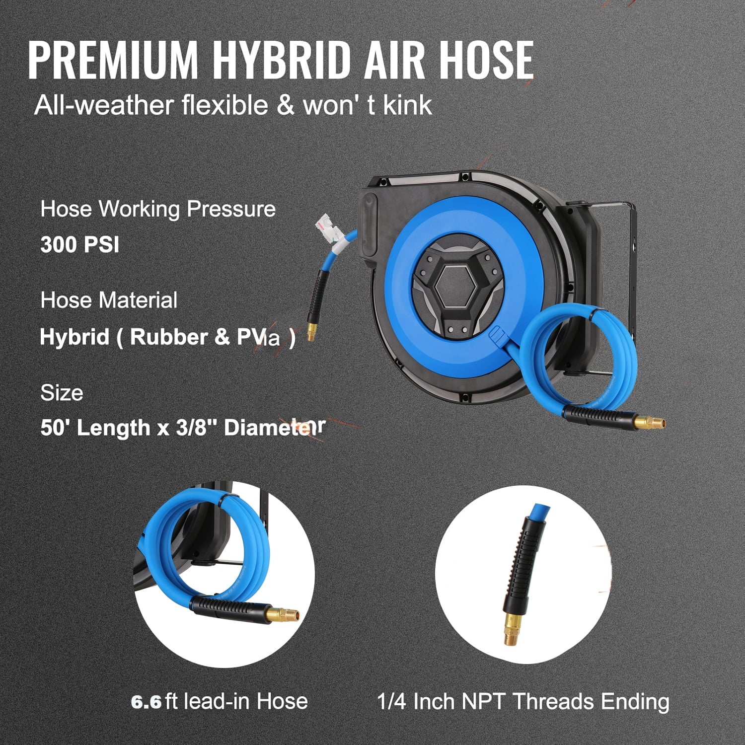 Retractable Air Hose Reel Air Compressor Hose Reel Automatic Rewind with 3/8 IN x 50 FT Hybrid Air Hose 6.6 ft Lead in Max 300PSI Wall Mount Enclosed Air Reel, 180° Swivel Mount