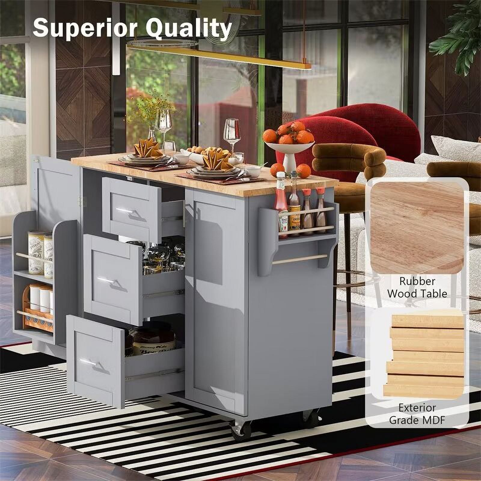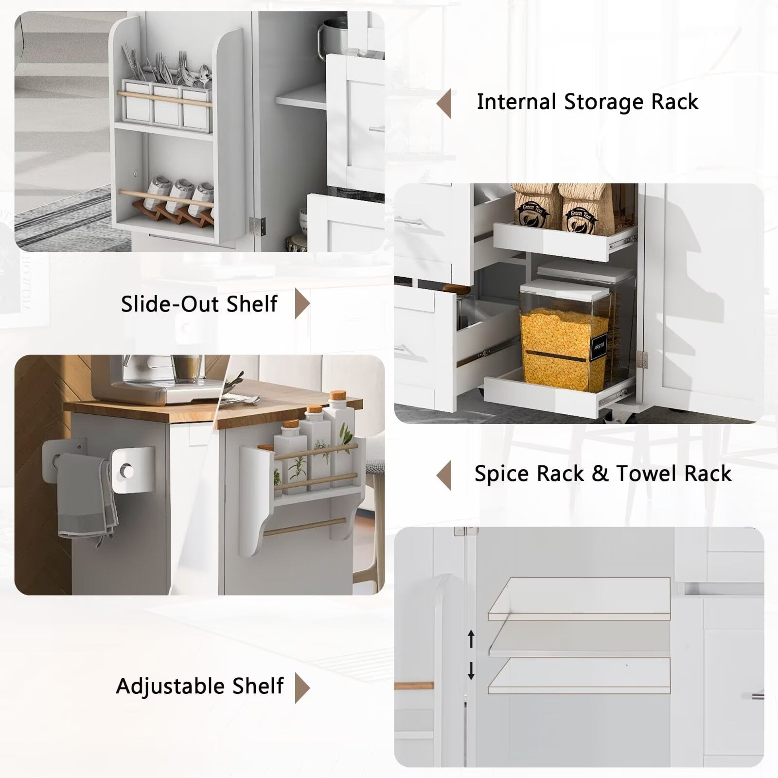 - 【Slide-Out Cabinet Shelf Design】Our kitchen island is equipped with two convenient slide-out shelves that incorporate durable steel full-extension ball-bearing rails. This innovative design effectively resolves your storage challenges while optimizing the limited space available, allowing you to achieve impeccable organization and effortlessly access all your stored items. Say goodbye to untidy and cluttered shelves as you relish the convenience of our enhanced storage solution.