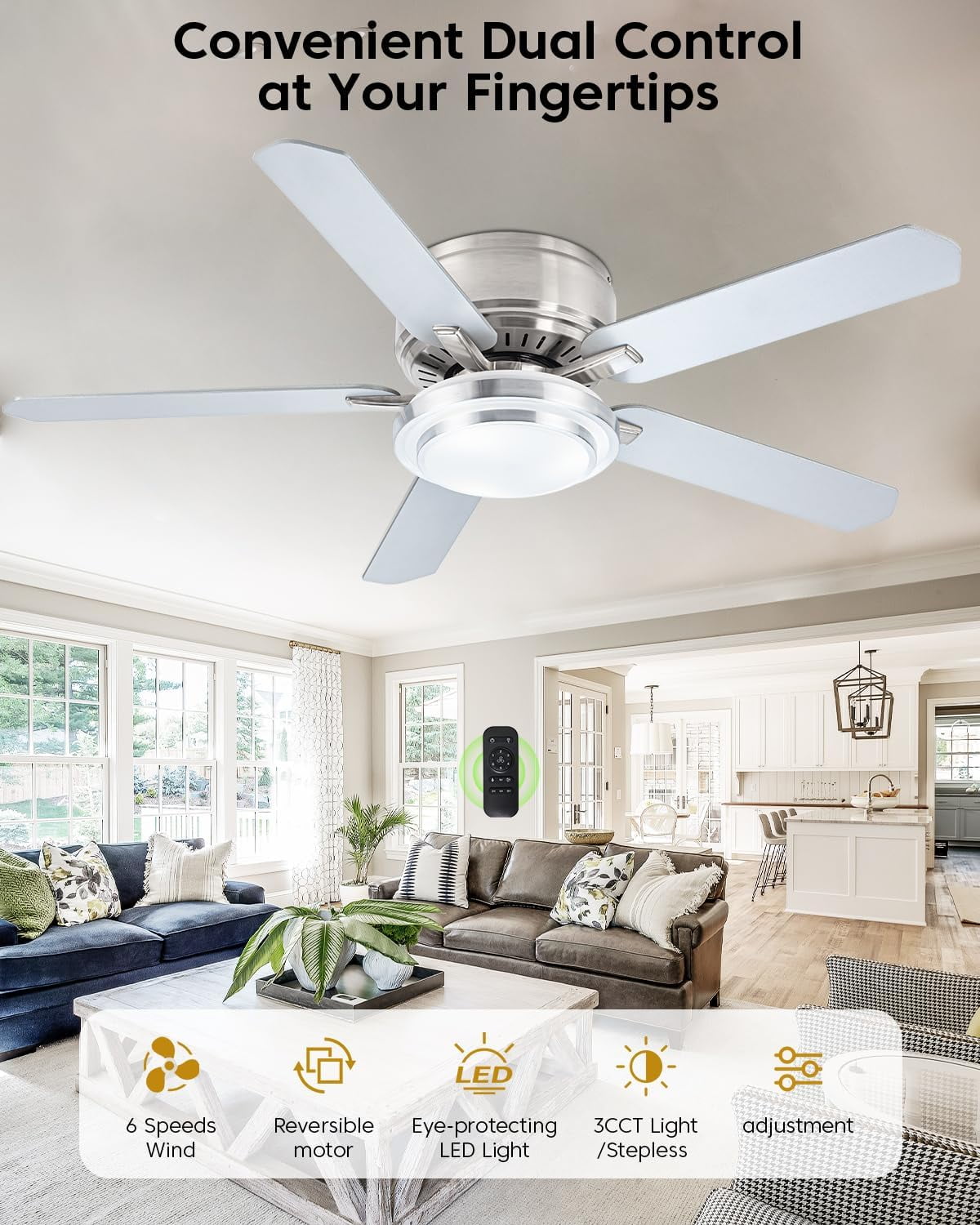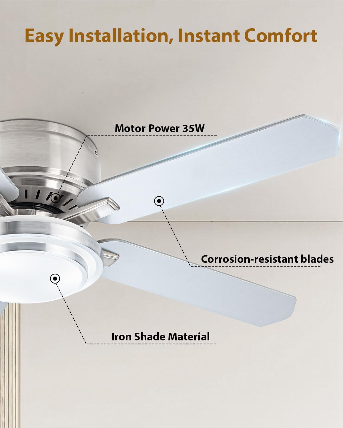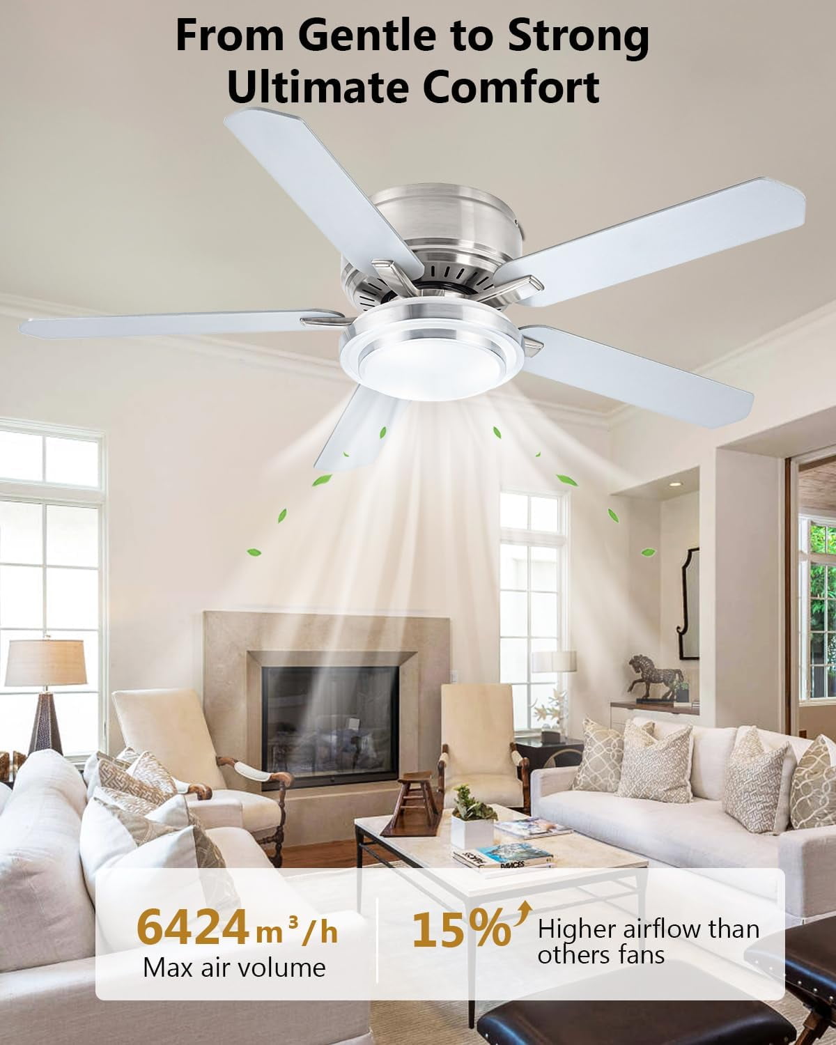 Suitable For Various Scenes: low profile flush mount ceiling fan for living room, office, study, kitchen, dining room, terrace and other indoor/outdoor use.