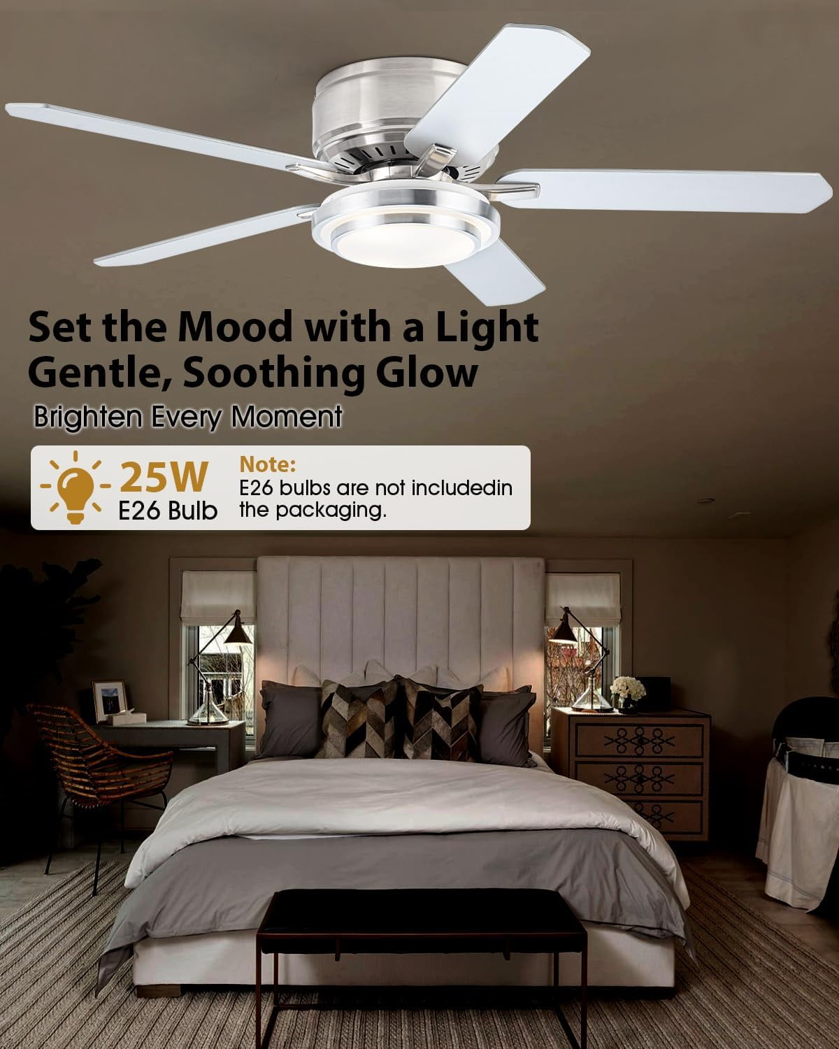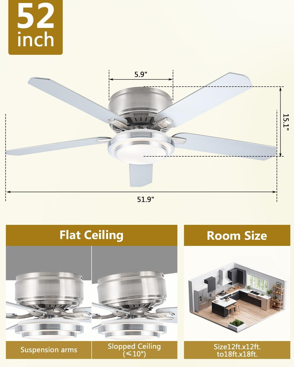 Warm Reminder: To extend the service life of your 52 inch flush mount ceiling fan with light,Cavoid direct exposure to rain or sunlight.