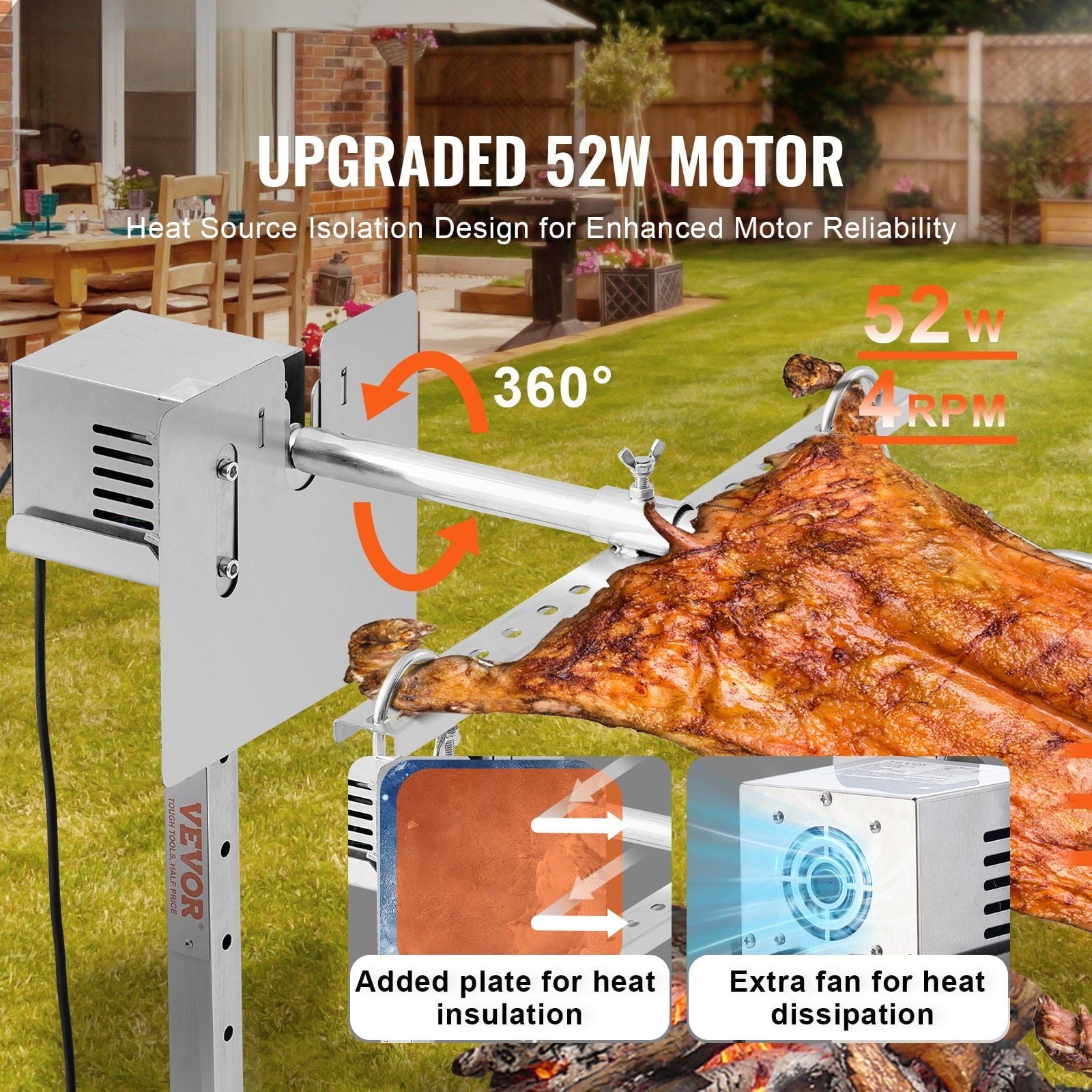 - Enhanced Heat Shield: The grill rotisserie kit features a newly upgraded motor, making grilling easier! It includes a powerful 52W motor that can effortlessly rotate the spit rod at 4 RPM. The enlarged heat plate and increased motor fan power effectively block heat sources from impacting the motor, reducing motor malfunctions.