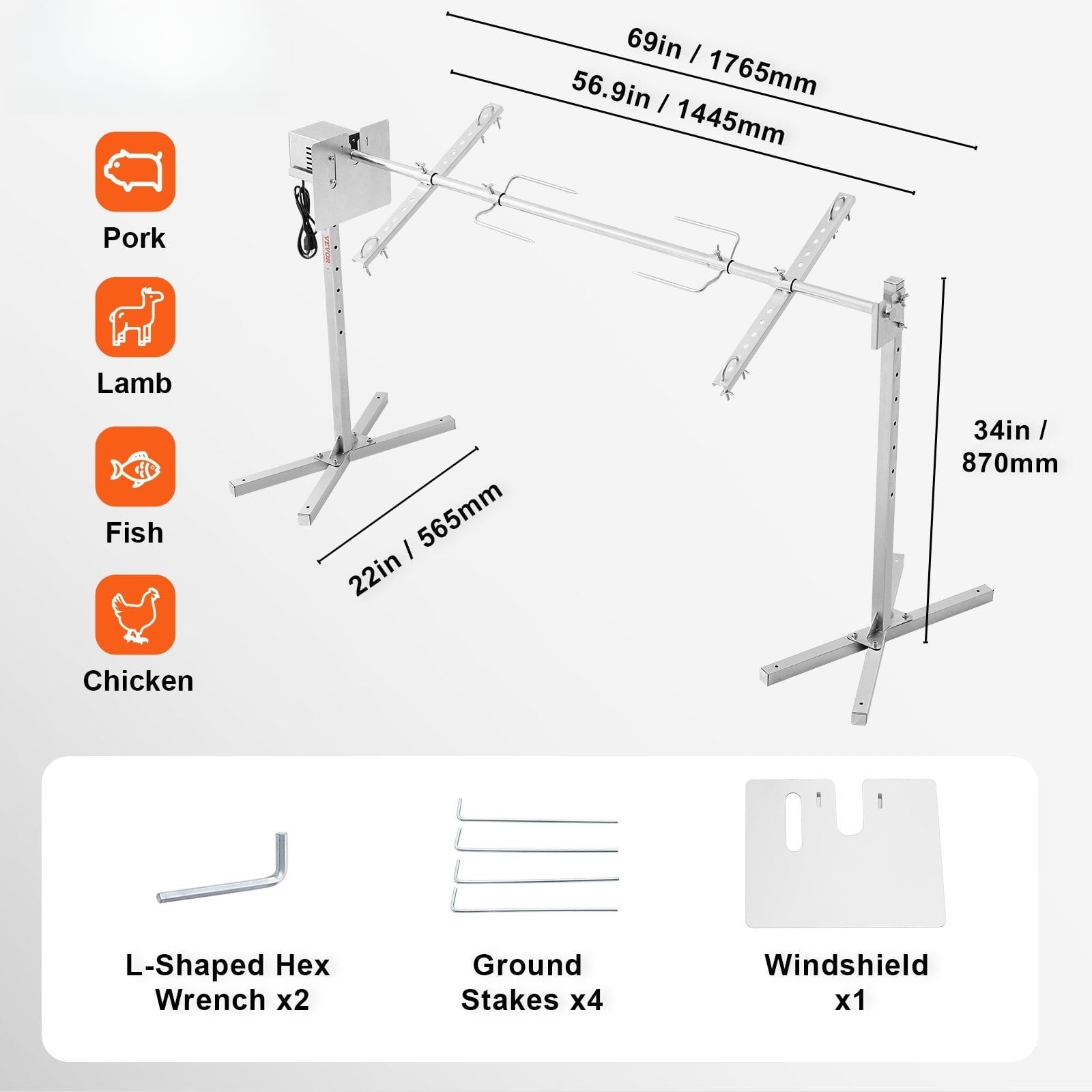 - 56-Inch Sectional Spit Rod: Simply use the threaded round rod to hold larger-sized ingredients, making operation convenient. The sectional spit rod can be easily disassembled to reduce product size.