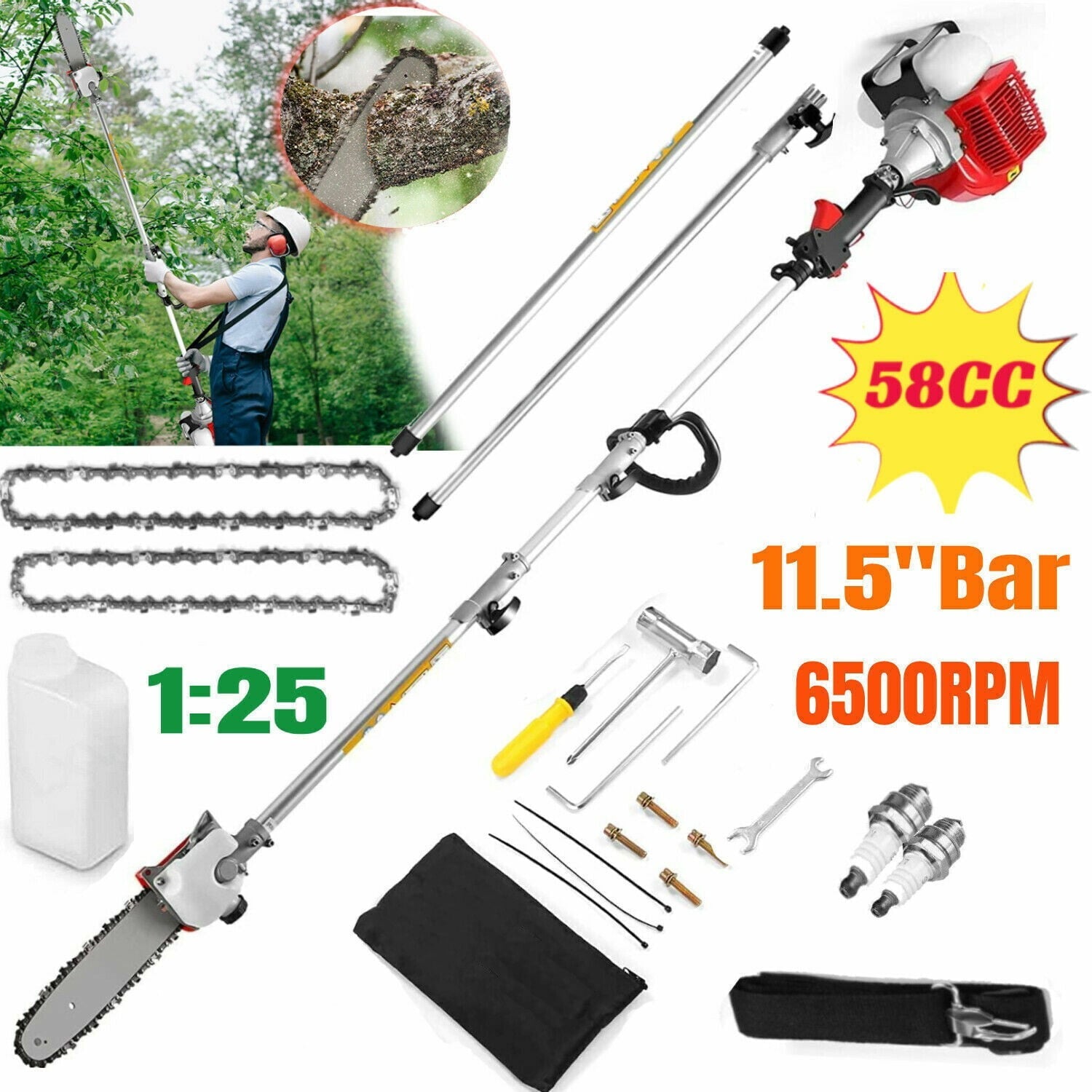 【2 Replacements & 1 Mixing Bottle】The pole saw is equipped with 2 chains and 1 extra replacement spark plug. No need to buy replacement parts, longer service life. 1.1L plastic mixing bottle for mixing oil and uses mixed oil (1:25 oil to gasoline ratio).