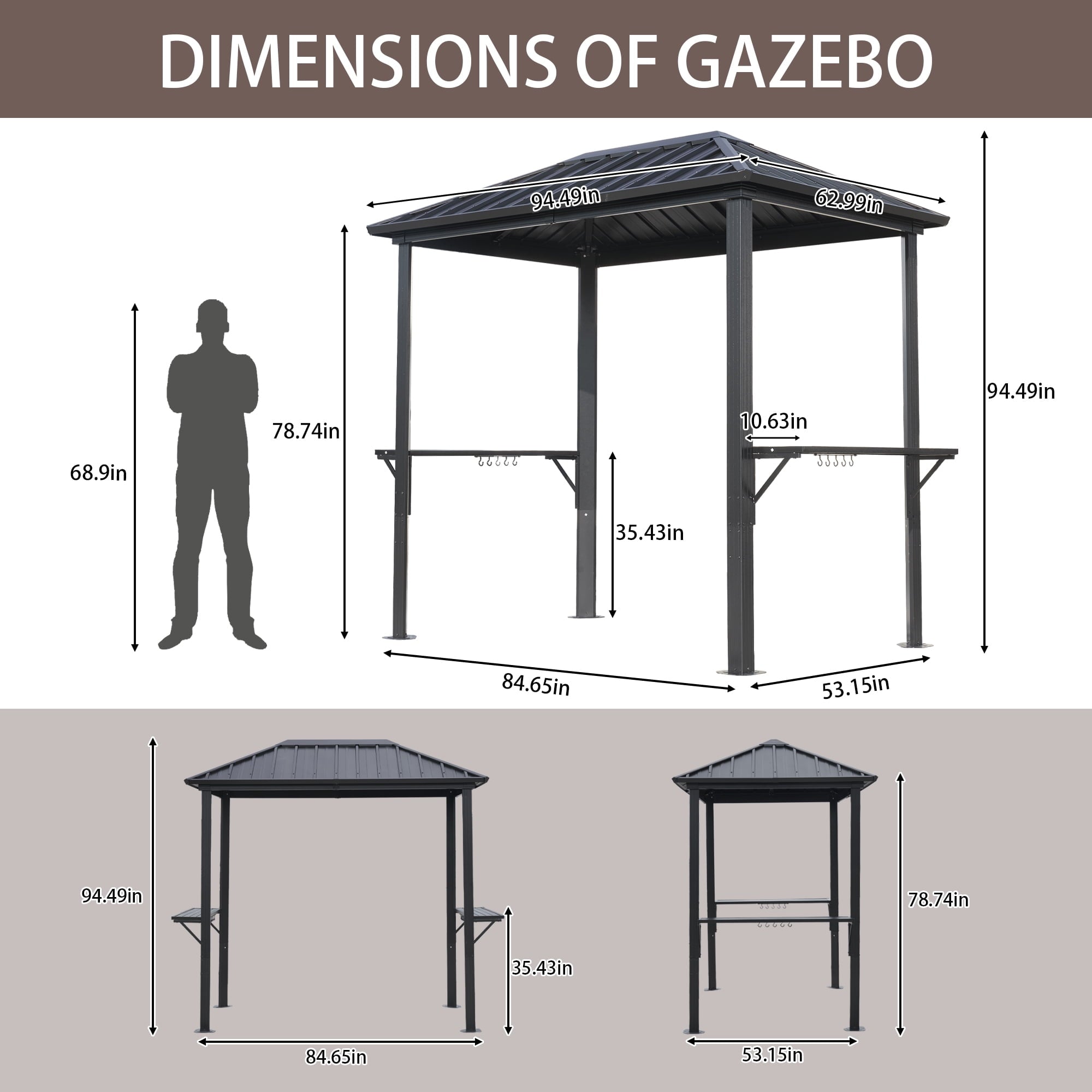 Convenient Shelves and Serving Tables: Equipped with built-in shelves and serving tables, this gazebo offers convenient storage and preparation space. The shelves are perfect for holding cooking utensils, condiments, and ingredients.