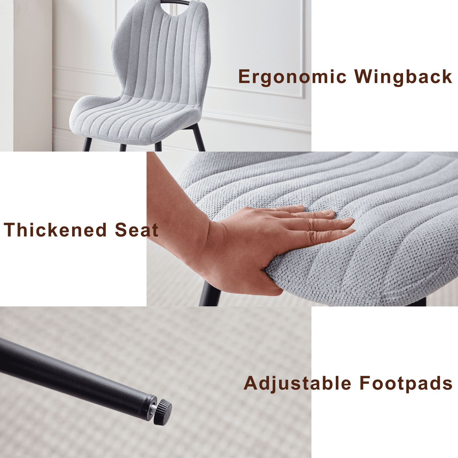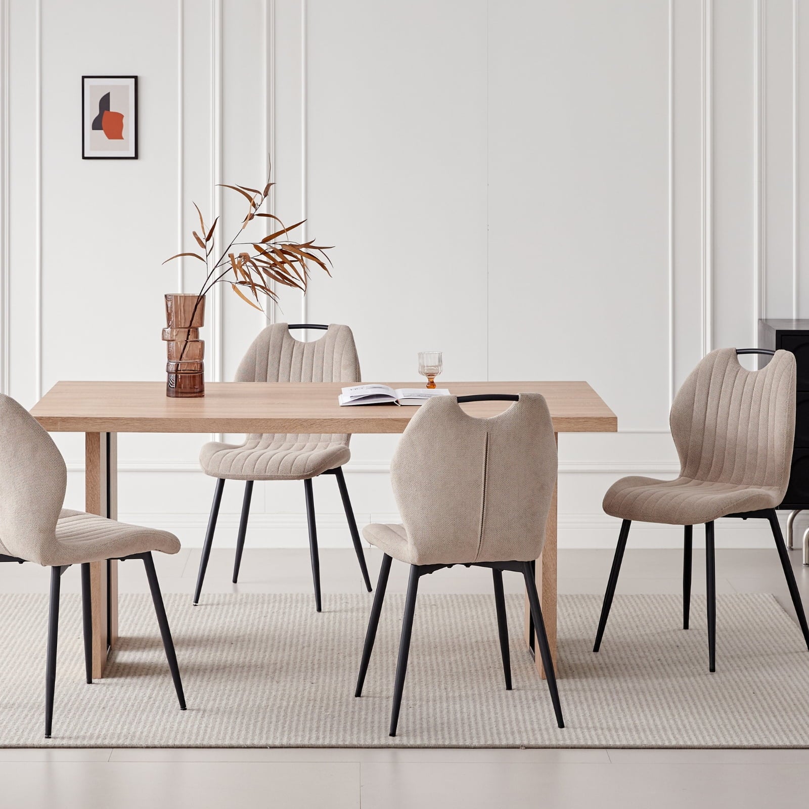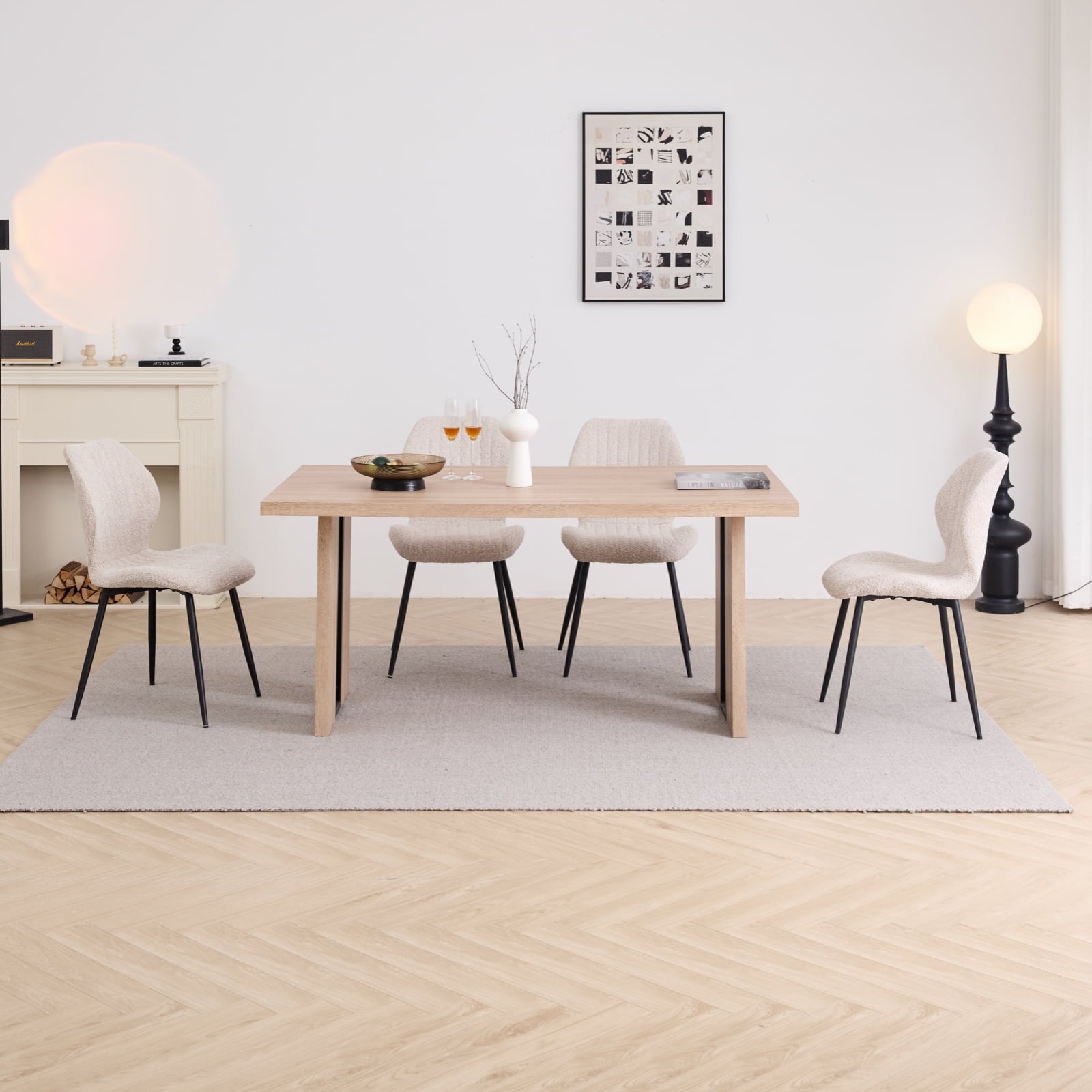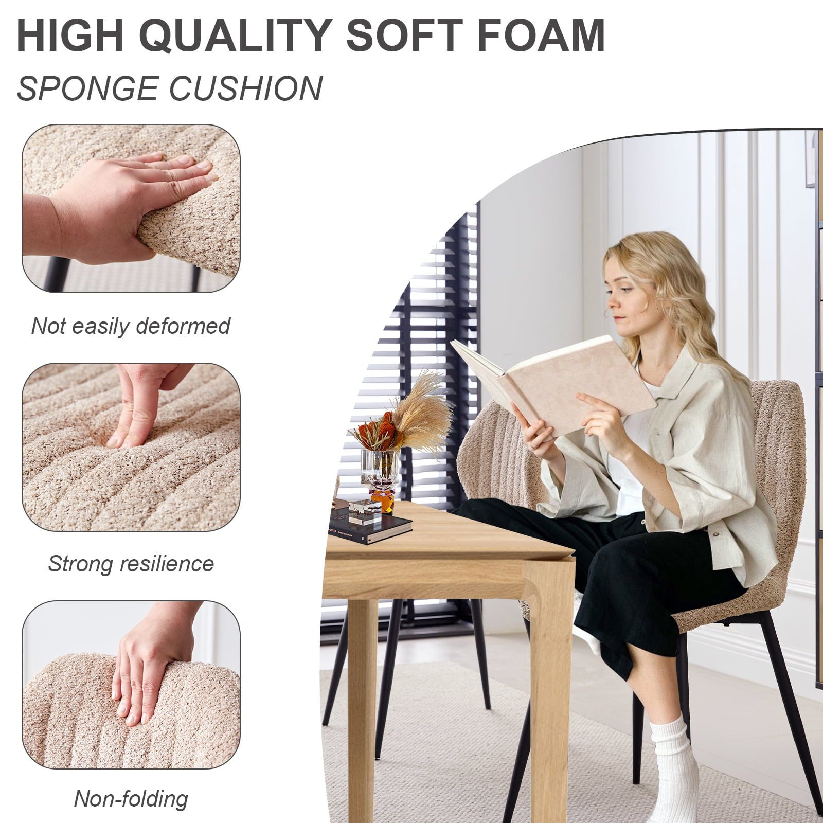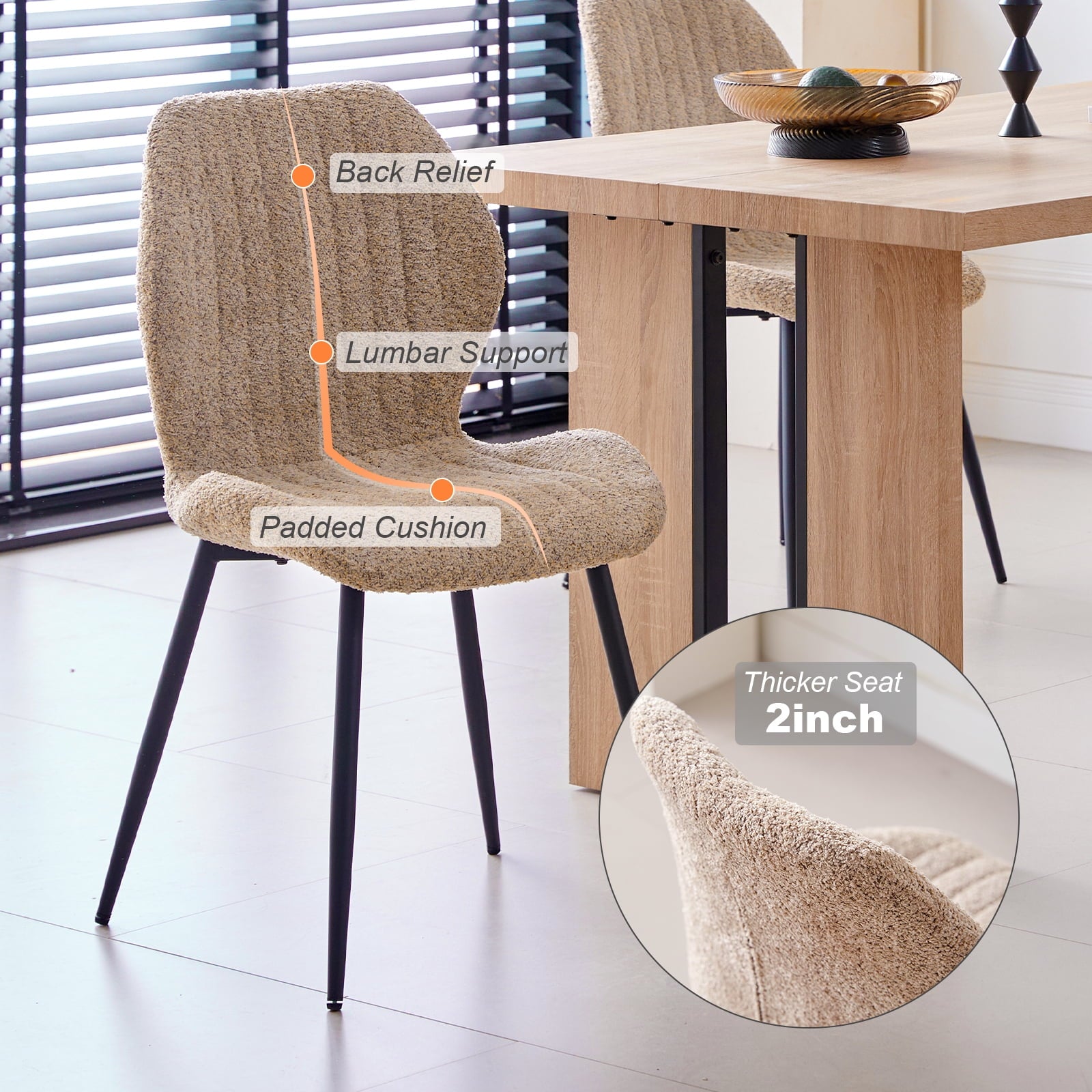 - High Backrest and Thick Seat Cushions Long-lasting Comfort: Sherpa dining room chairs set of 4 features an ergonomic design that conforms to the body’s curves, providing excellent support and a comfortable seating experience. The thickened cushion and soft boucle high backrest ensure that you won’t feel fatigued even after prolonged sitting. Whether you’re enjoying a hearty dinner or chatting with family and friends for hours, you’ll always remain comfortable and at ease.