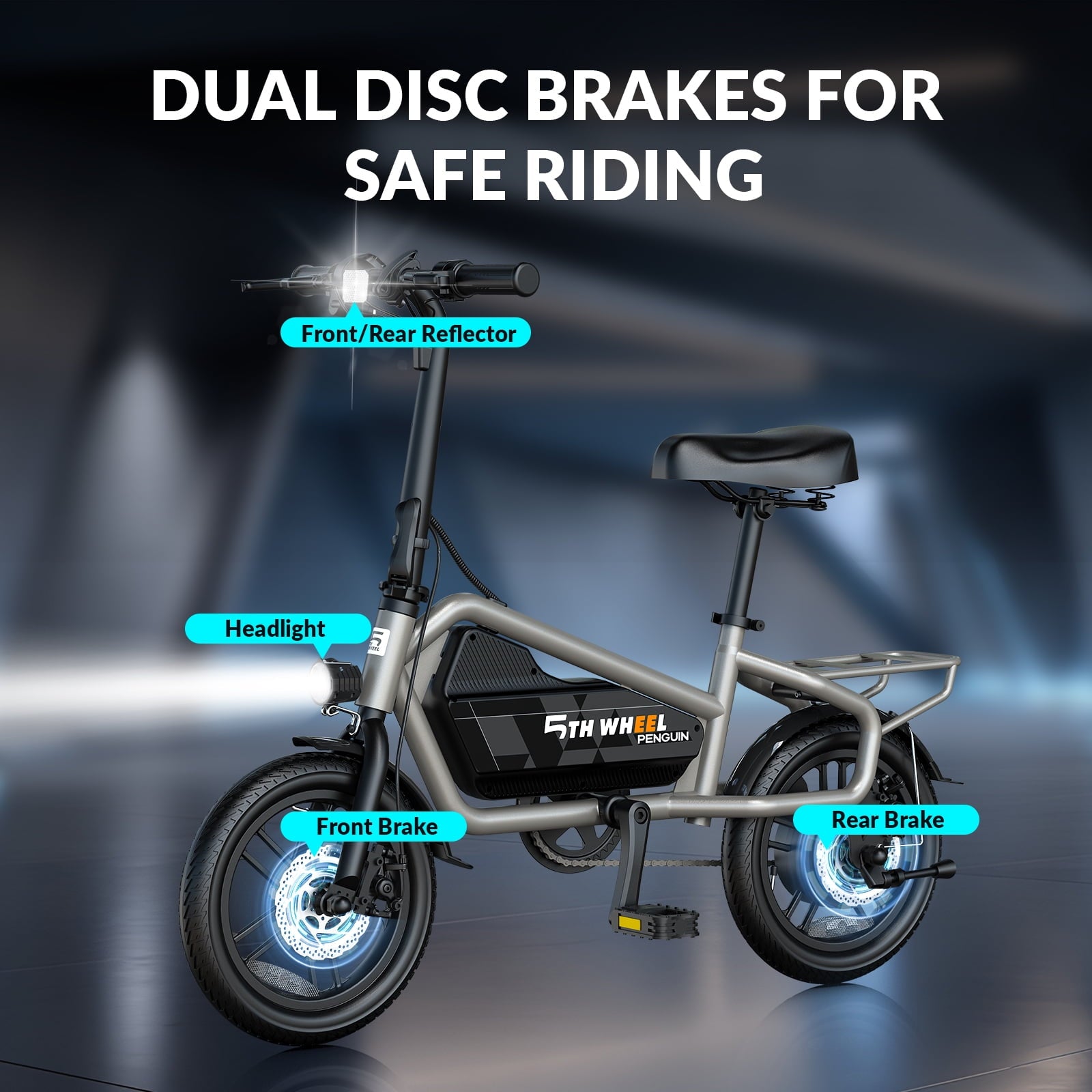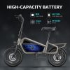 * Safety with Disc Brakes — Combined with EABS and a mechanical disc brake system, the e scooter guarantees responsive and reliable braking at any speed. The electric bike come with 14inch fat tire and the seat spring will ensure you have a smooth ride.