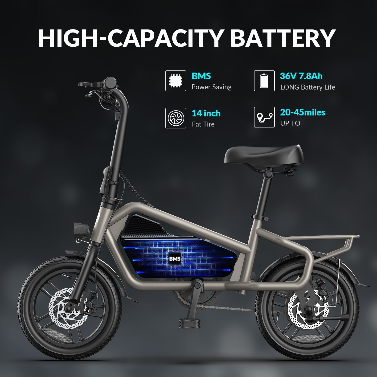 * Smart Display — This e-bike also includes an LED display to monitor battery life, a high-brightness front light, and rear reflector for added safety during night rides.