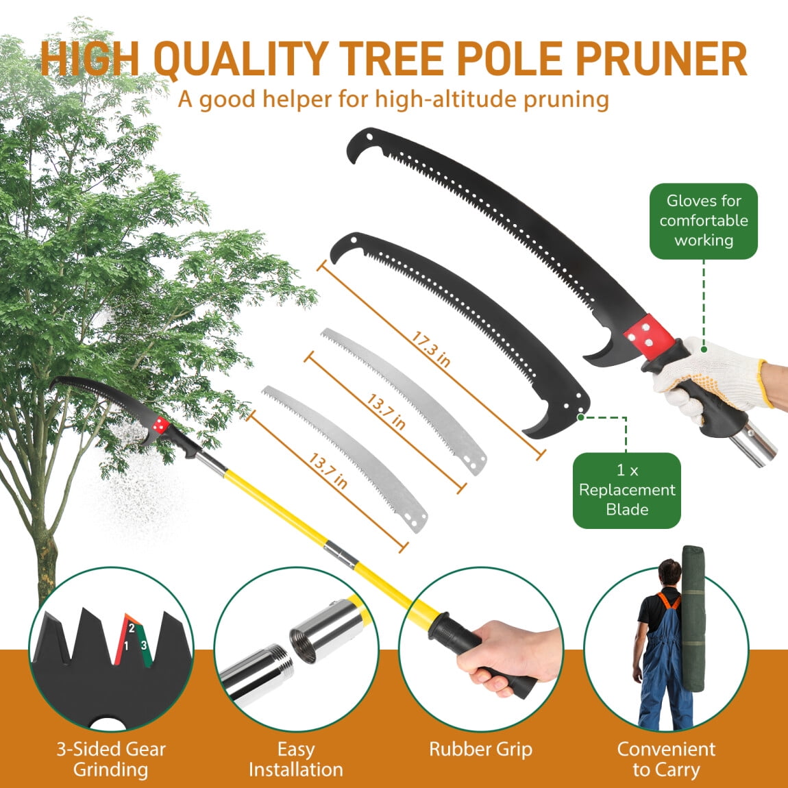 - 【Comprehensive Pruning System】This set includes everything you need for a full pruning solution: two sharp saw blades (one spare), a protective saw sleeve, 8 fiberglass poles, scissors with a pull string, protective gloves, and a durable canvas storage bag, ensuring you’re well-equipped for any pruning jobs.