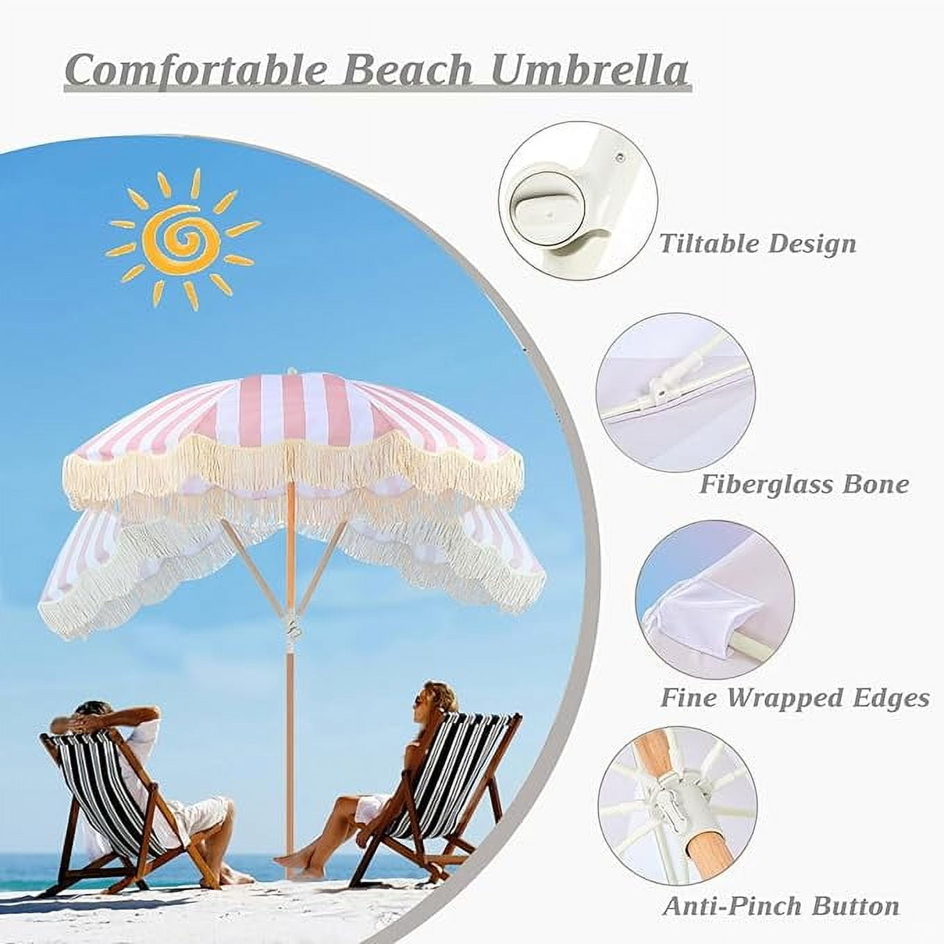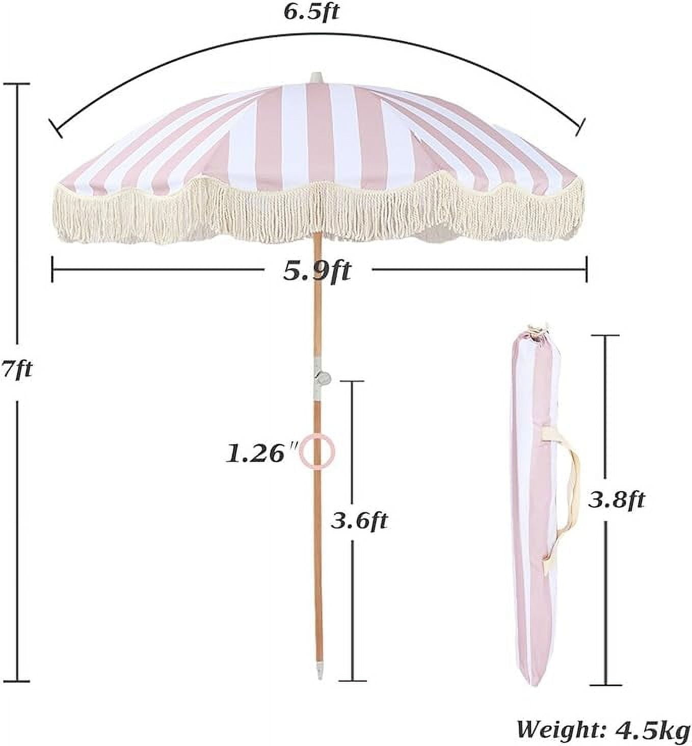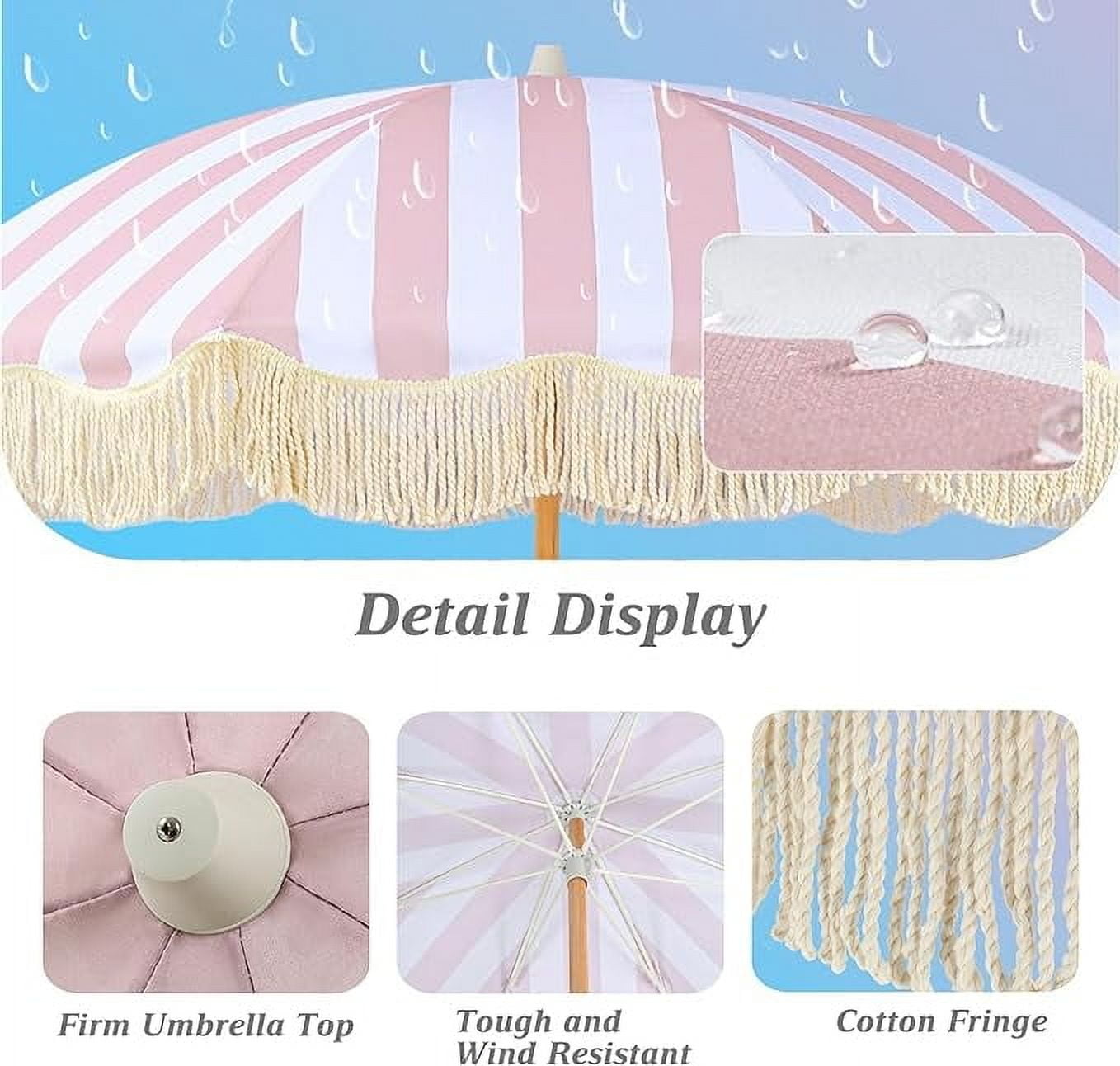 【Wind Resistance】: The beach tassel umbrella is made of 8 strong fibreglass umbrella bones, not easy to break. The umbrella surface has multiple reinforcement points to enable it to withstand strong winds. The solid wood umbrella pole can effectively withstand high winds, increase the stability of the umbrella, so that the umbrella will not be blown over.
