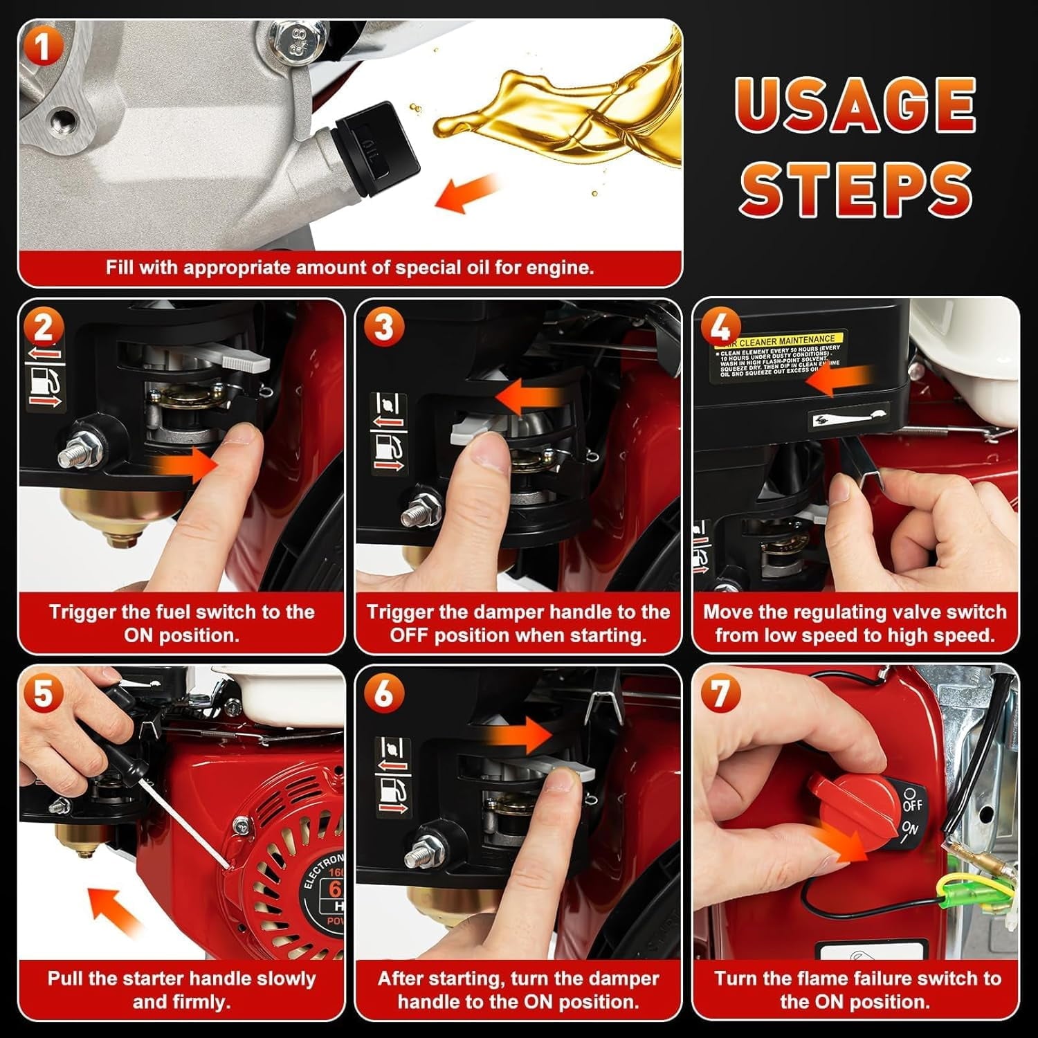 Large Fuel Tank: The engine has a large fuel tank capacity of 6.5L/1.72gal allowing it to work for a long time. You don’t need to fill the tank frequently, which is very convenient.