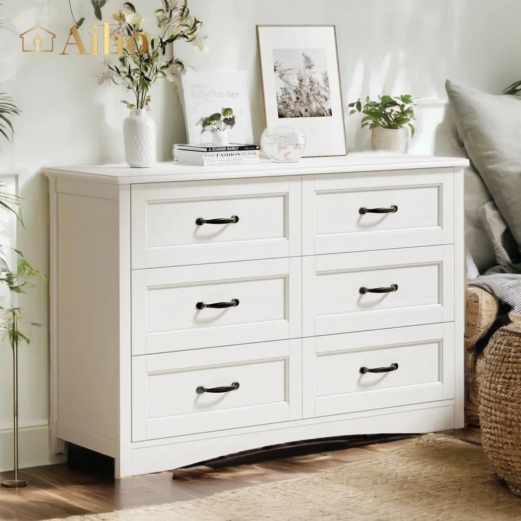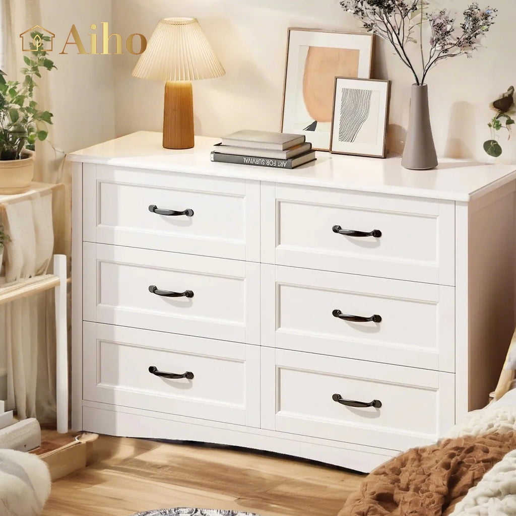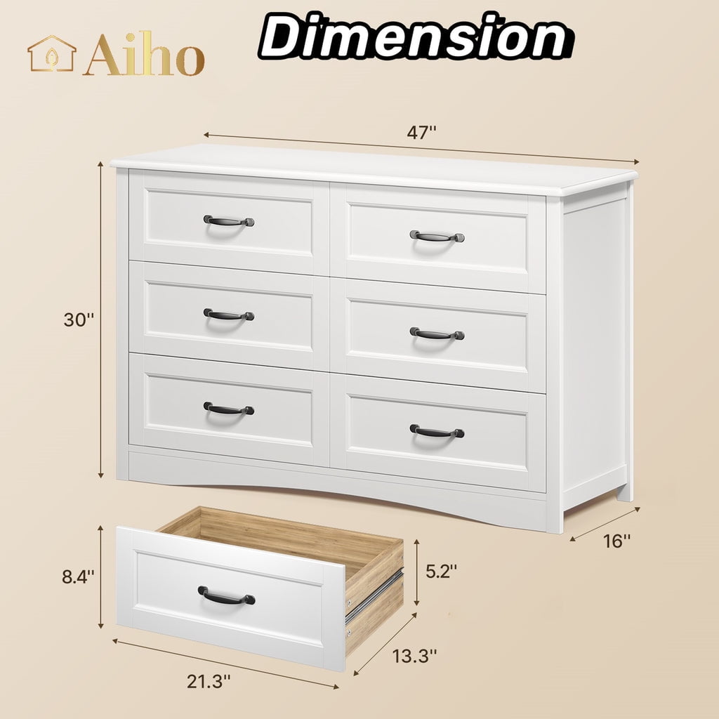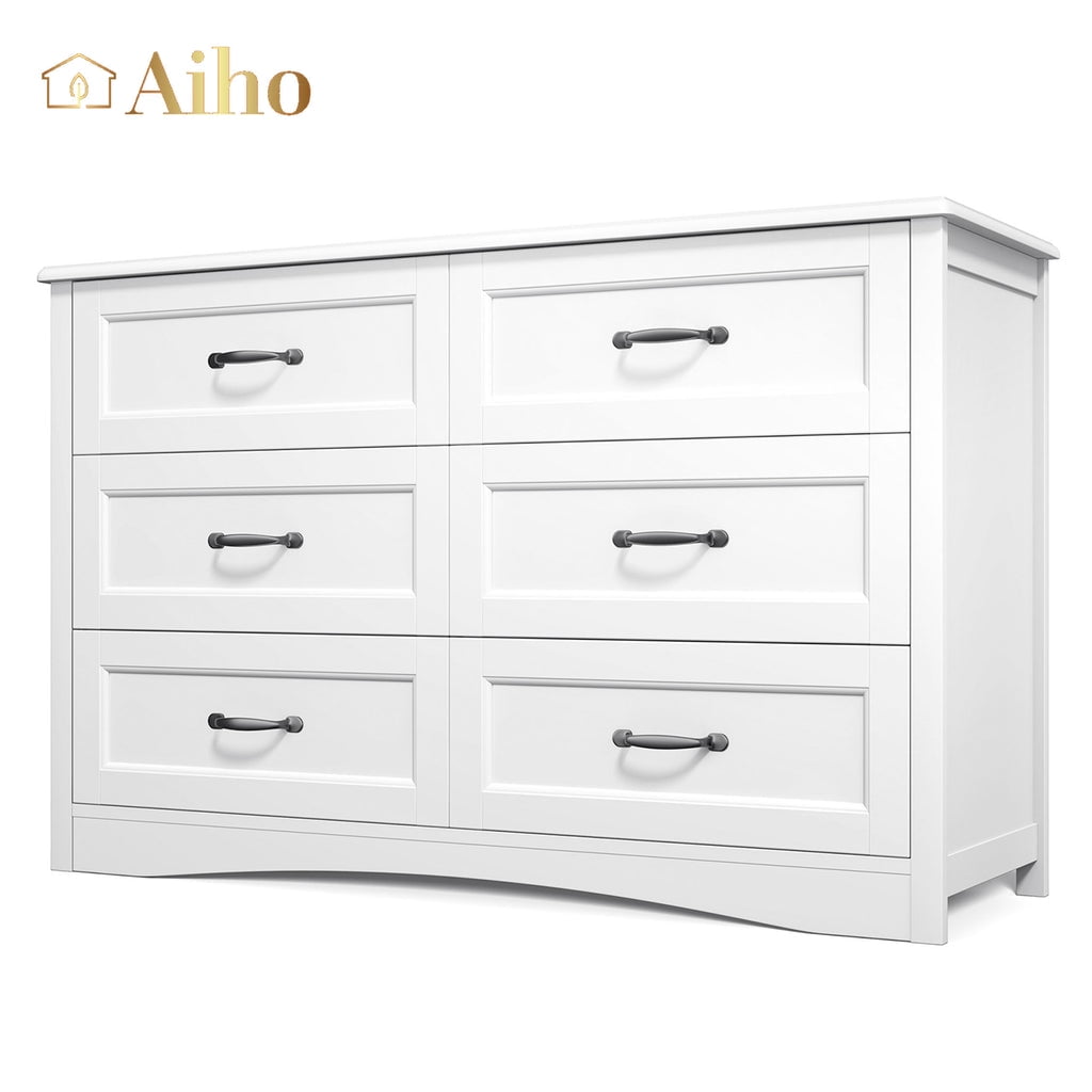 Aiho 6 drawer dresser is designed to enhance your space. This white dresser has 6 large drawers that provide ample storage for clothes and towels, and the 6 drawer dresser’s tabletop can also hold books, toys, vanity mirrors, and display your favorite