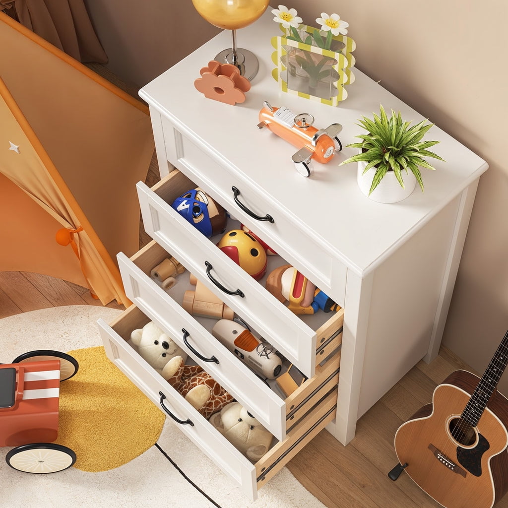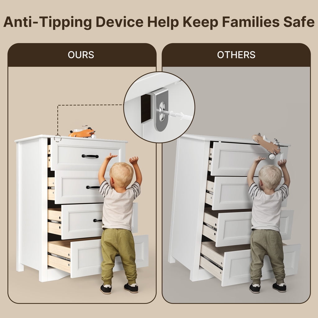 crafts. This dresser for bedroom has a minimalist design with cutout handles. The chest of drawers also features a vertical rectangular silhouette with an anti-tip mechanism for sturdiness and durability, allowing this dresser to be placed in your