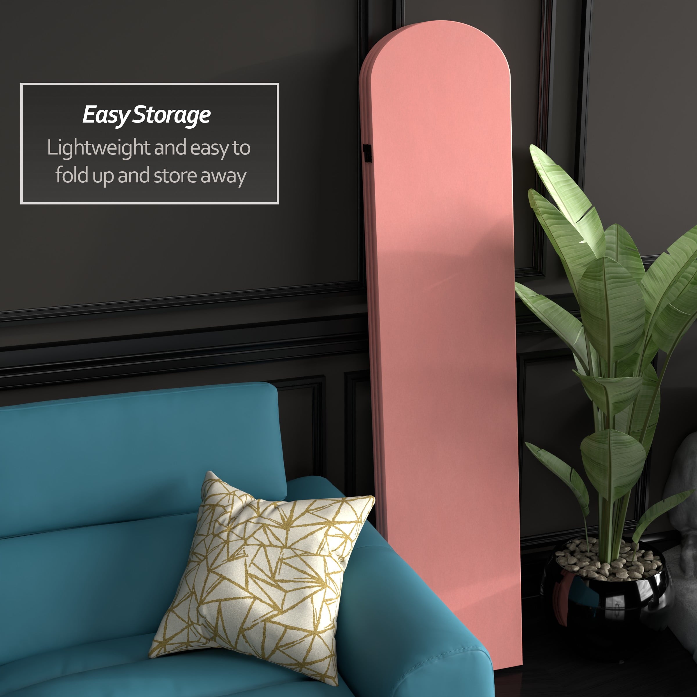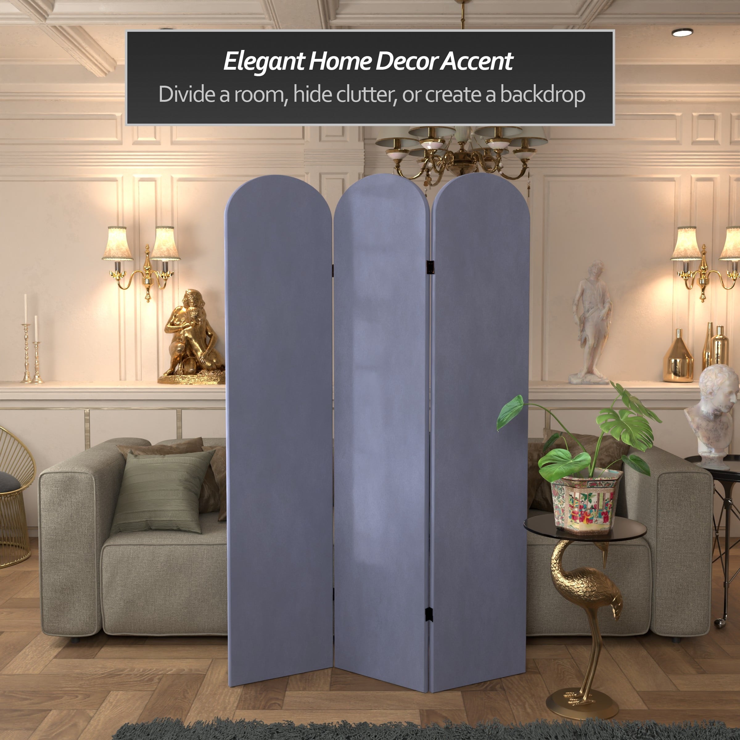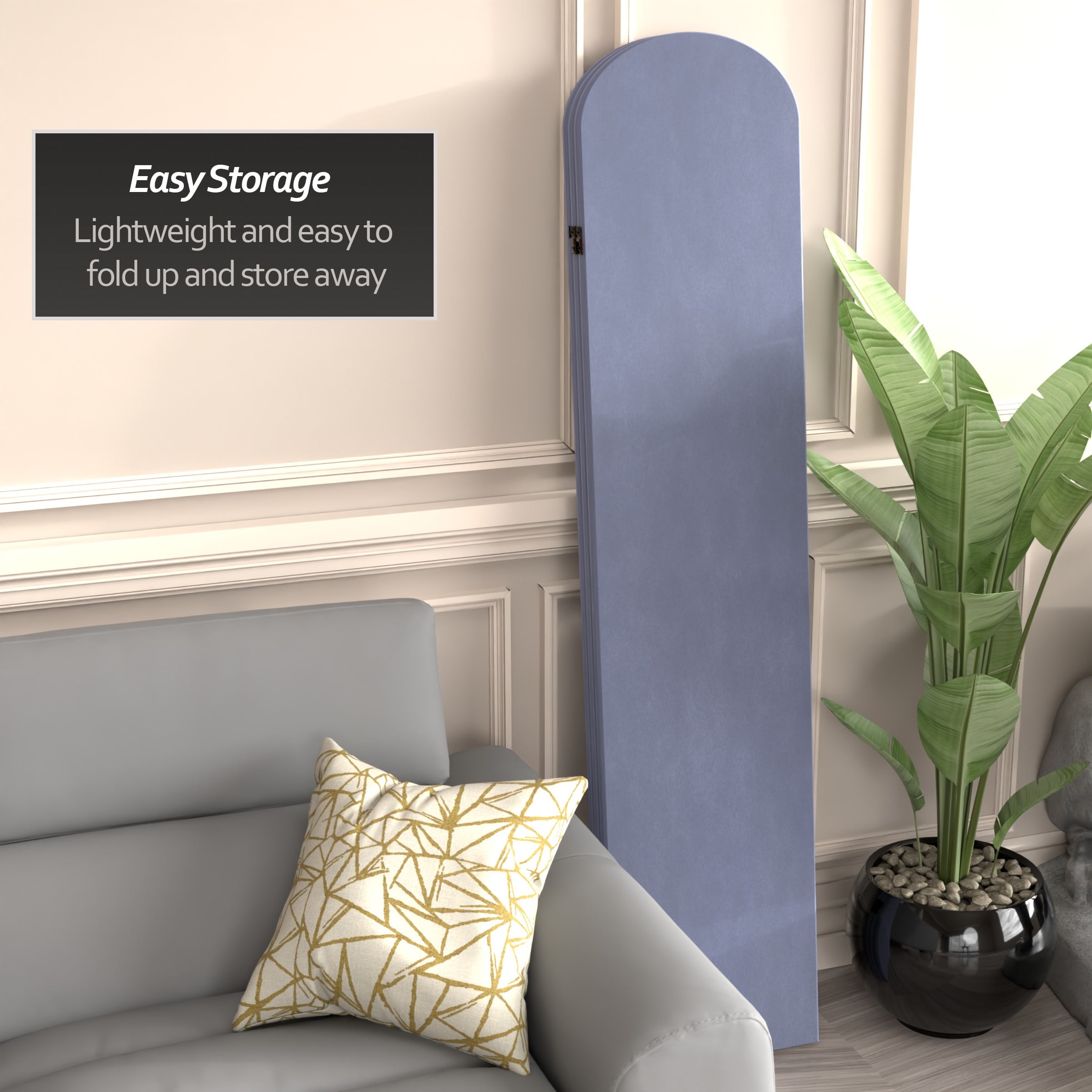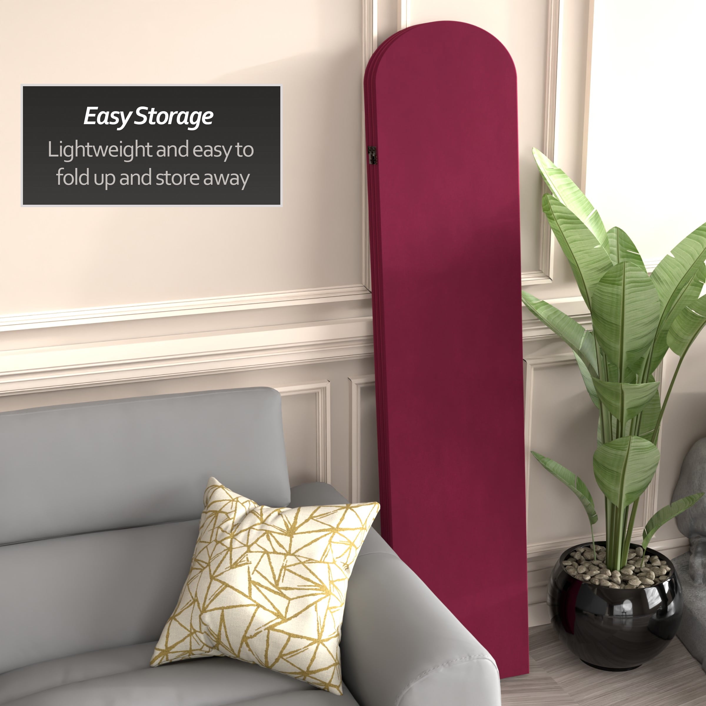 The classic arched panels on this gorgeous screen give it a majestic quality. The texture of the fabric lends a heavy feeling to the screen, while the lightweight wood frame makes it eminently portable. It’s the perfect backdrop for your next zoom meeting, to hide an unsightly area, or create an intimate nook in a large room.