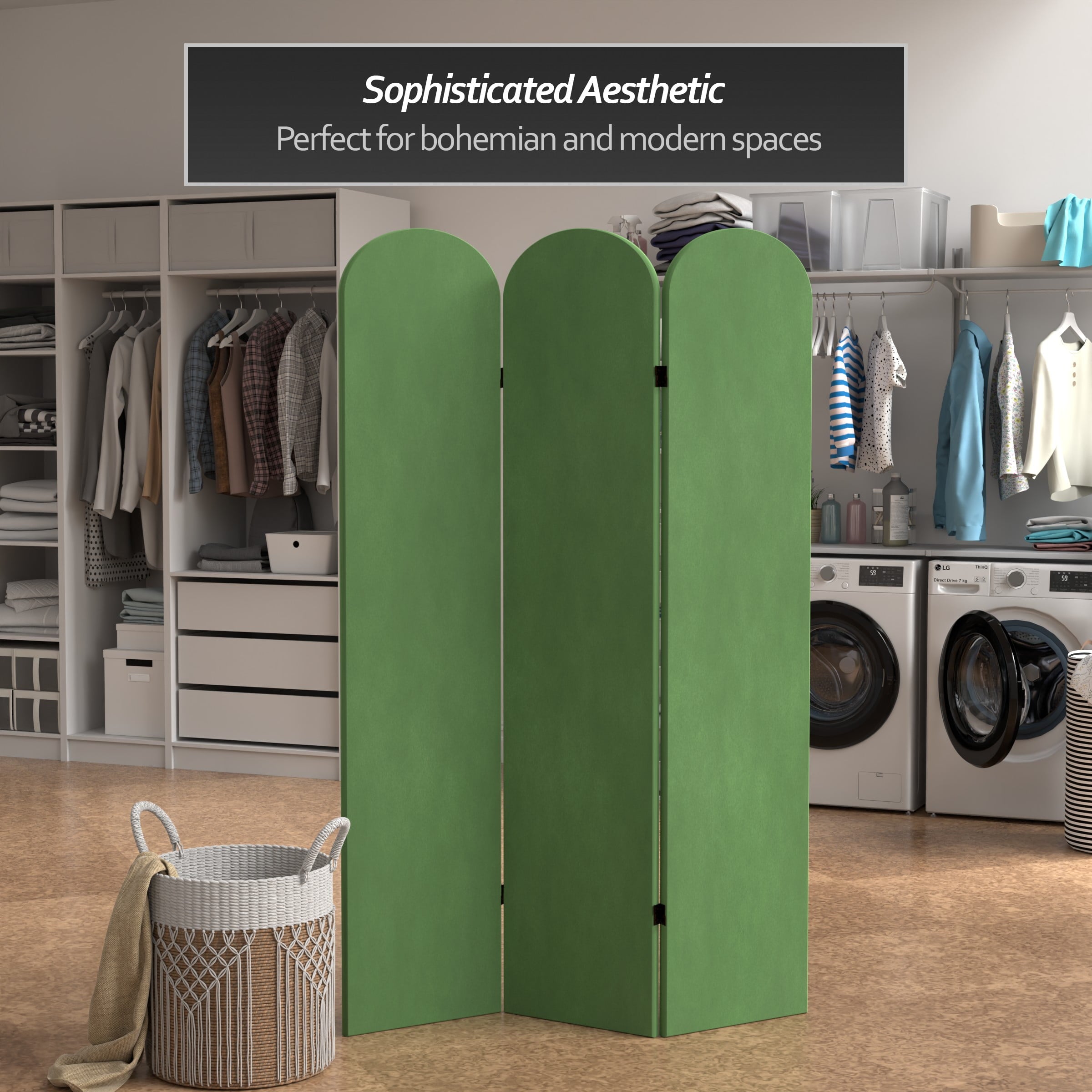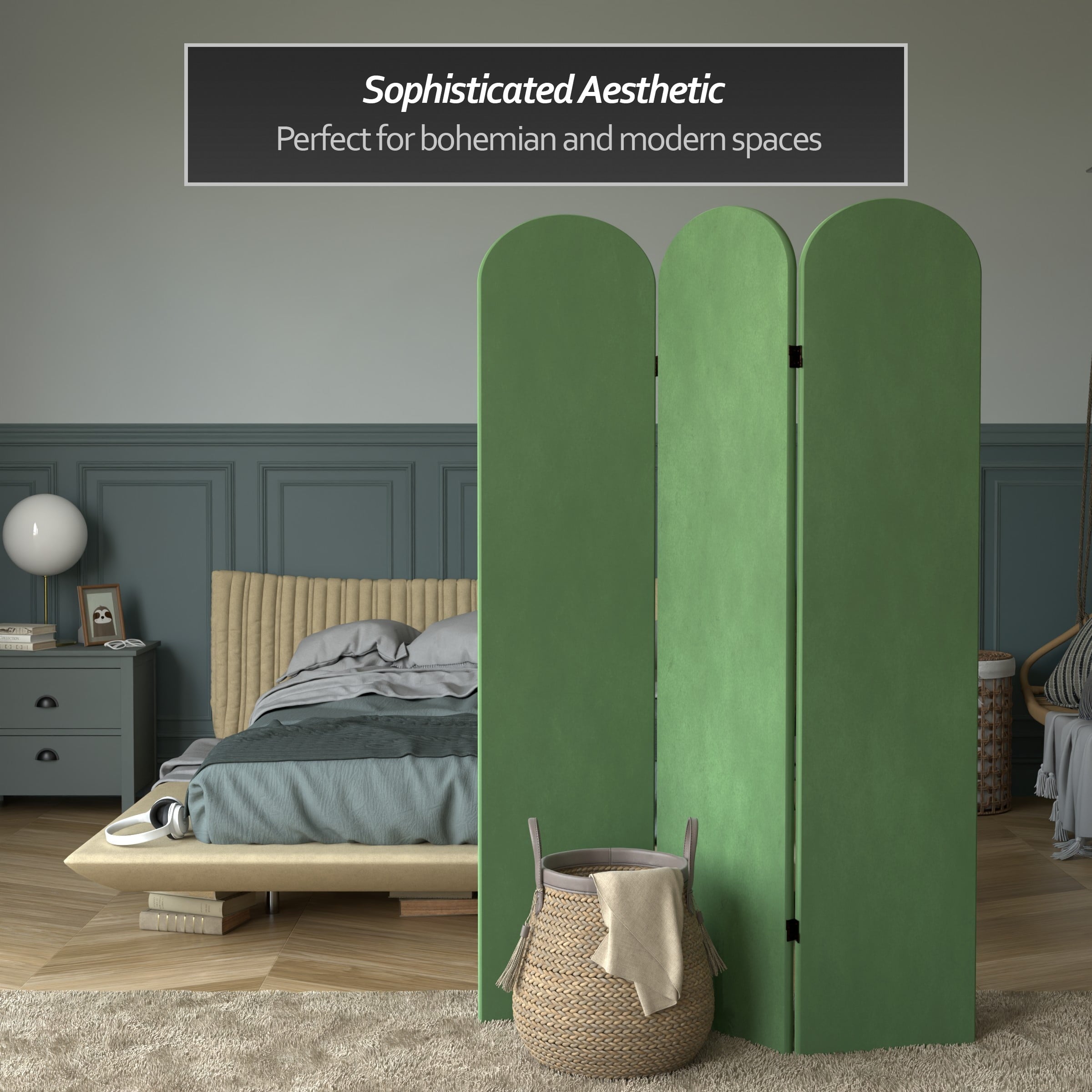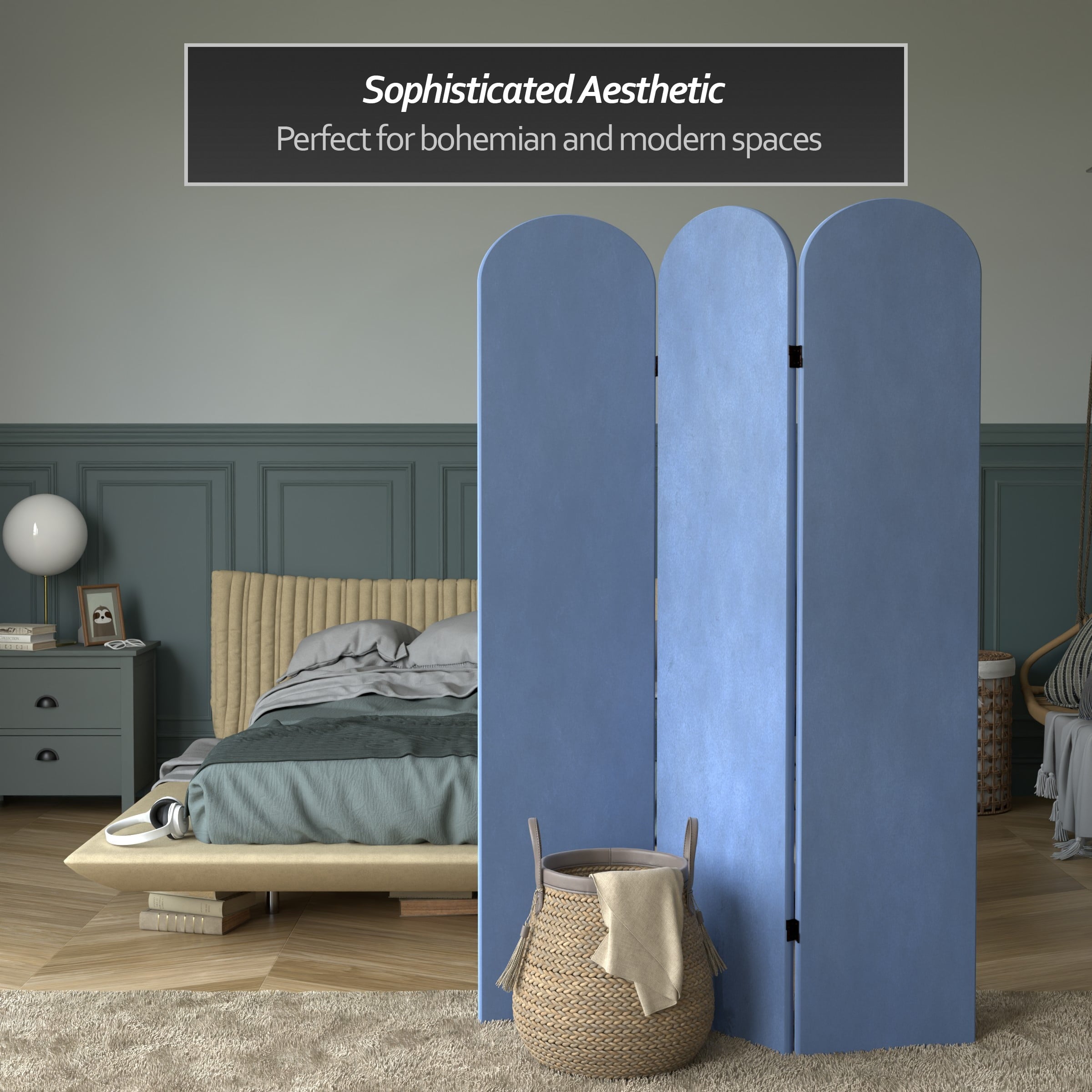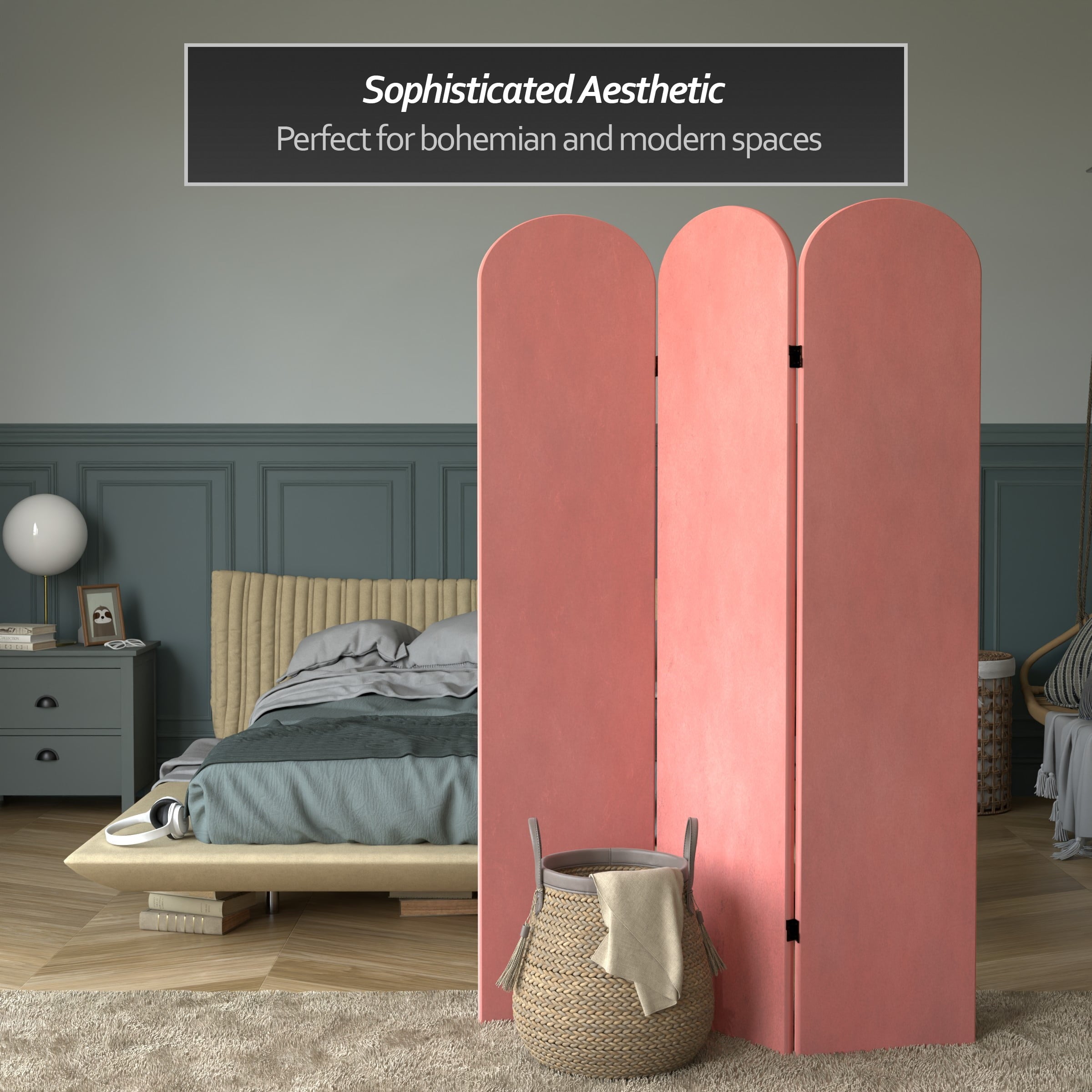 The classic arched panels on this gorgeous screen give it a majestic quality. The texture of the fabric lends a heavy feeling to the screen, while the lightweight wood frame makes it eminently portable. It’s the perfect backdrop for your next zoom meeting, to hide an unsightly area, or create an intimate nook in a large room.