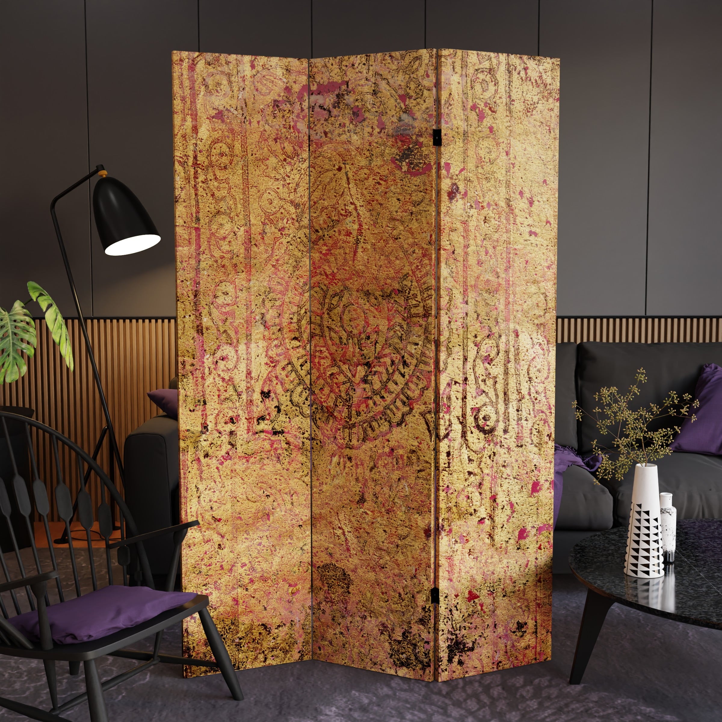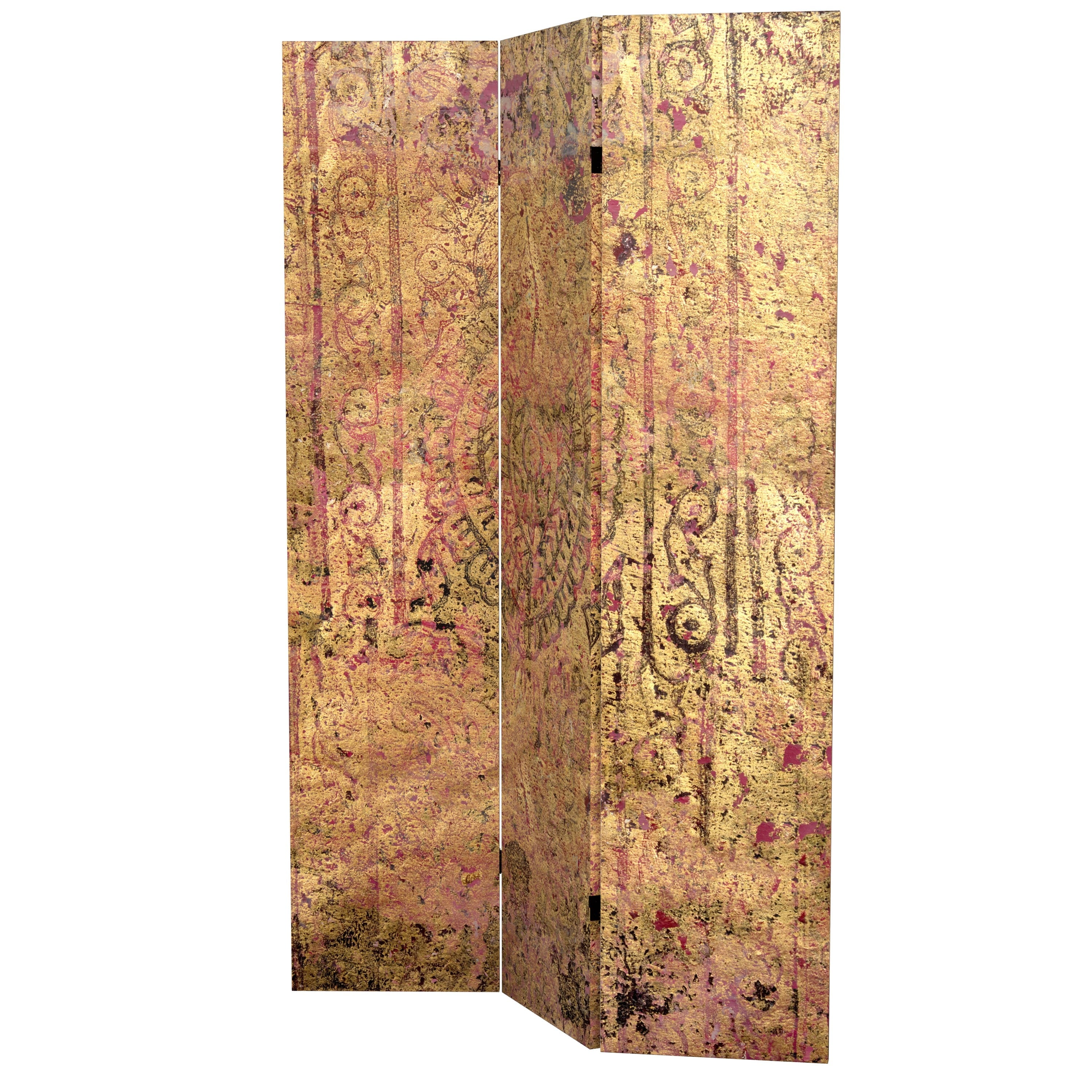 A stylish full sized 3 panel floor screen room divider featuring an abstract, layered red and gold design reminiscent of ancient artwork – an exclusive art print from a contemporary New England artist. Practical, portable, attractive home or office decor, ideal for dividing or defining personal and professional space, block light to shade a monitor, or as a video background. Well crafted and durable, photo print canvas stretched over reinforced wood frames with reversible two way hinges. The distinctive image is laser printed front and back with high color saturation ink, protected with a fade resistant, clear coat waterproof finish to preserve the image. Intended for indoor use. Clean with a clean, dry cloth. Imported.