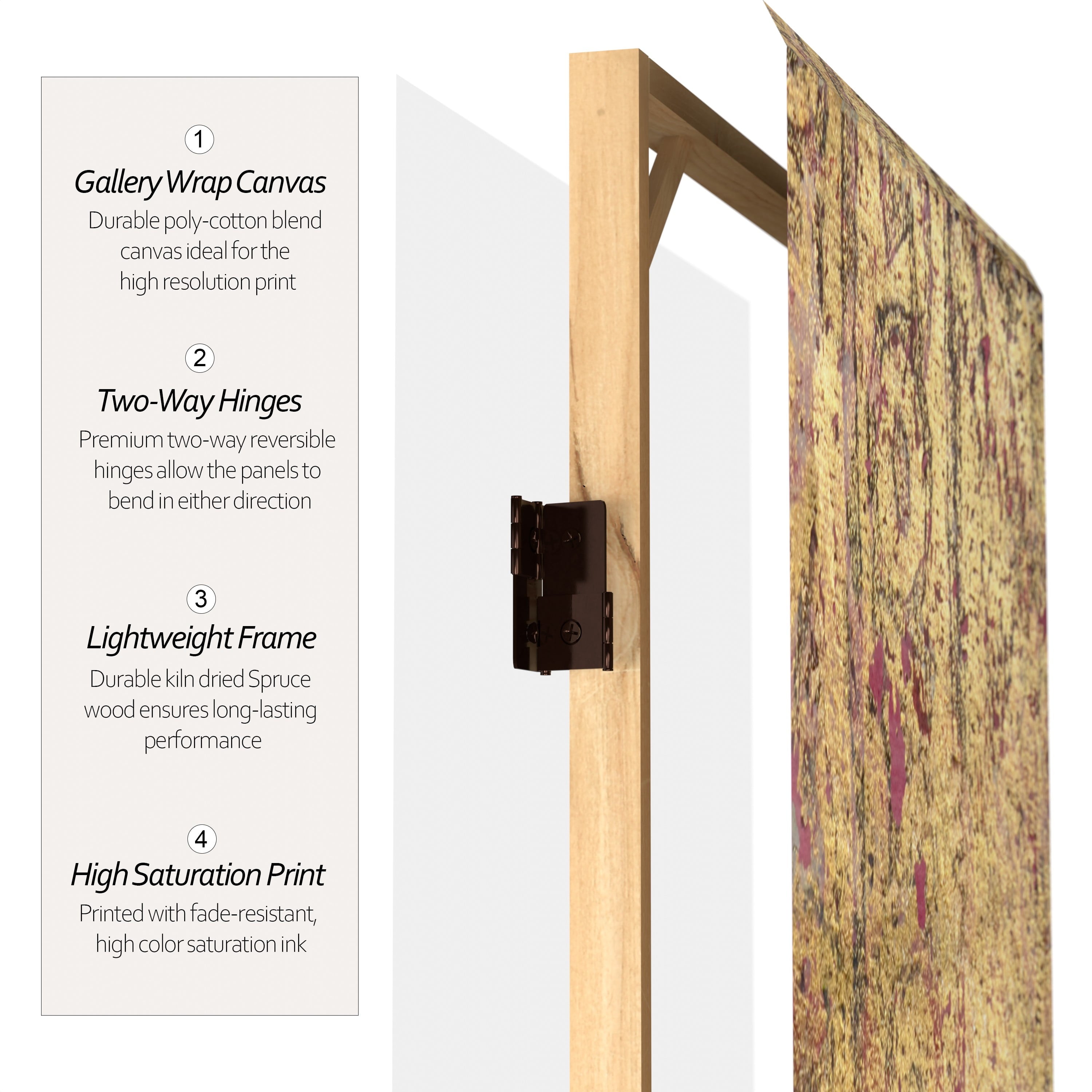 - Wood and Canvas Construction: Our room divider features a durable poly-cotton blend canvas ideal for the high resolution print. The durable kiln dried Spruce wood ensures long-lasting performance while being light enough to move and store easily.