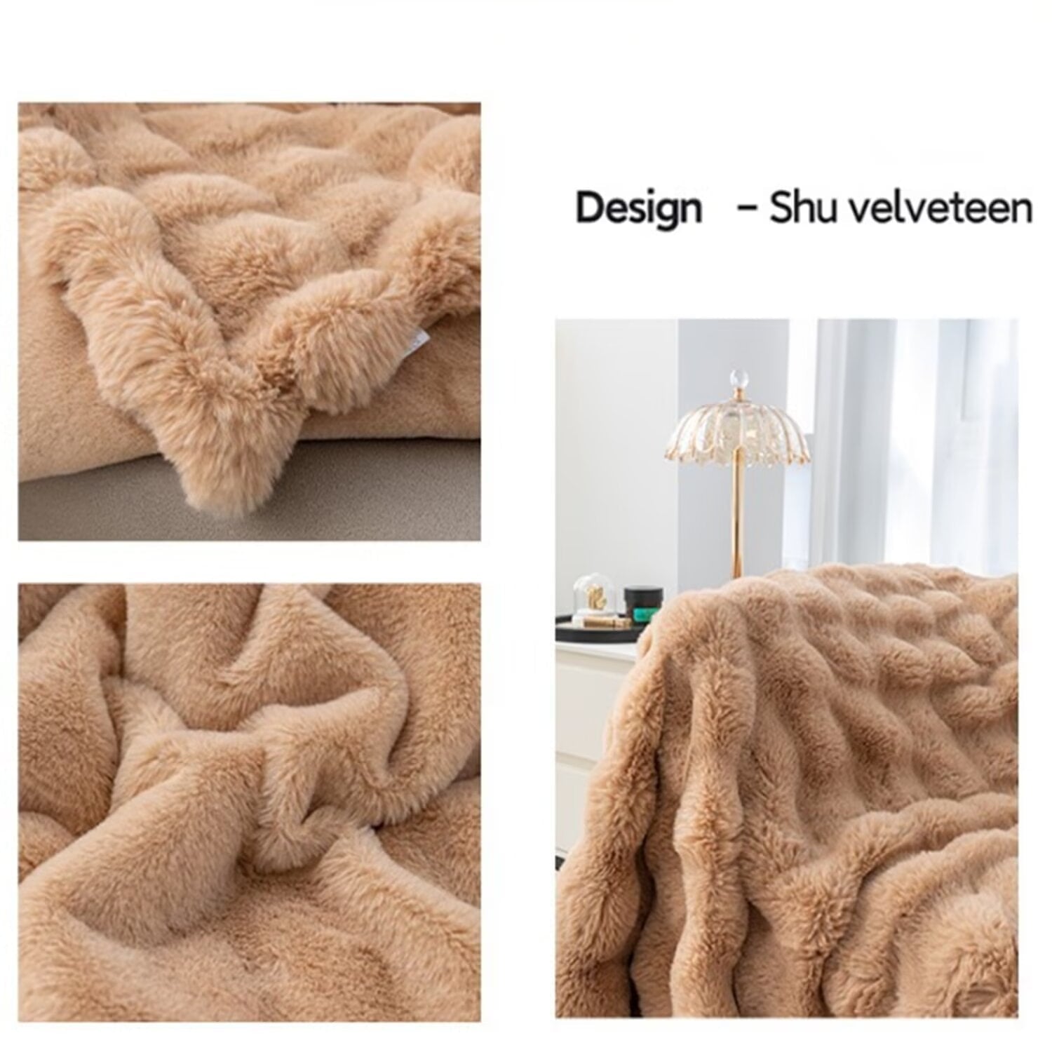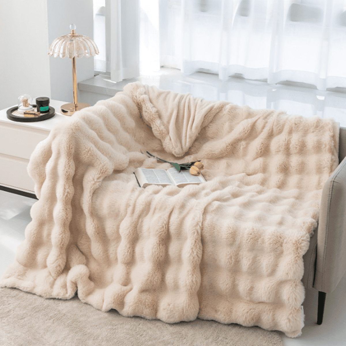 Experience ultimate comfort and warmth with our Bubble Shape Faux Fur Throw Blanket. Made with fluffy faux rabbit fur face side and silky Polyester, this throw blanket is ultra soft and cozy on both sides. The selected fabric weight provides the perfect balance of warmth without causing overheating, making it ideal for cold moment.