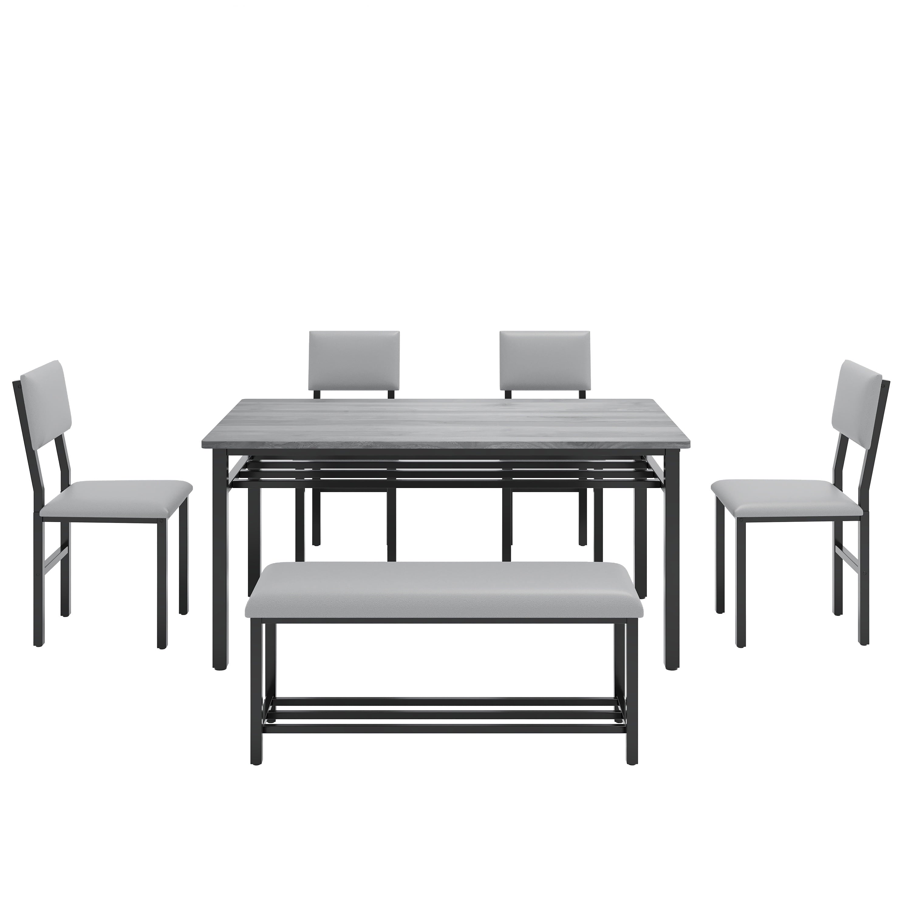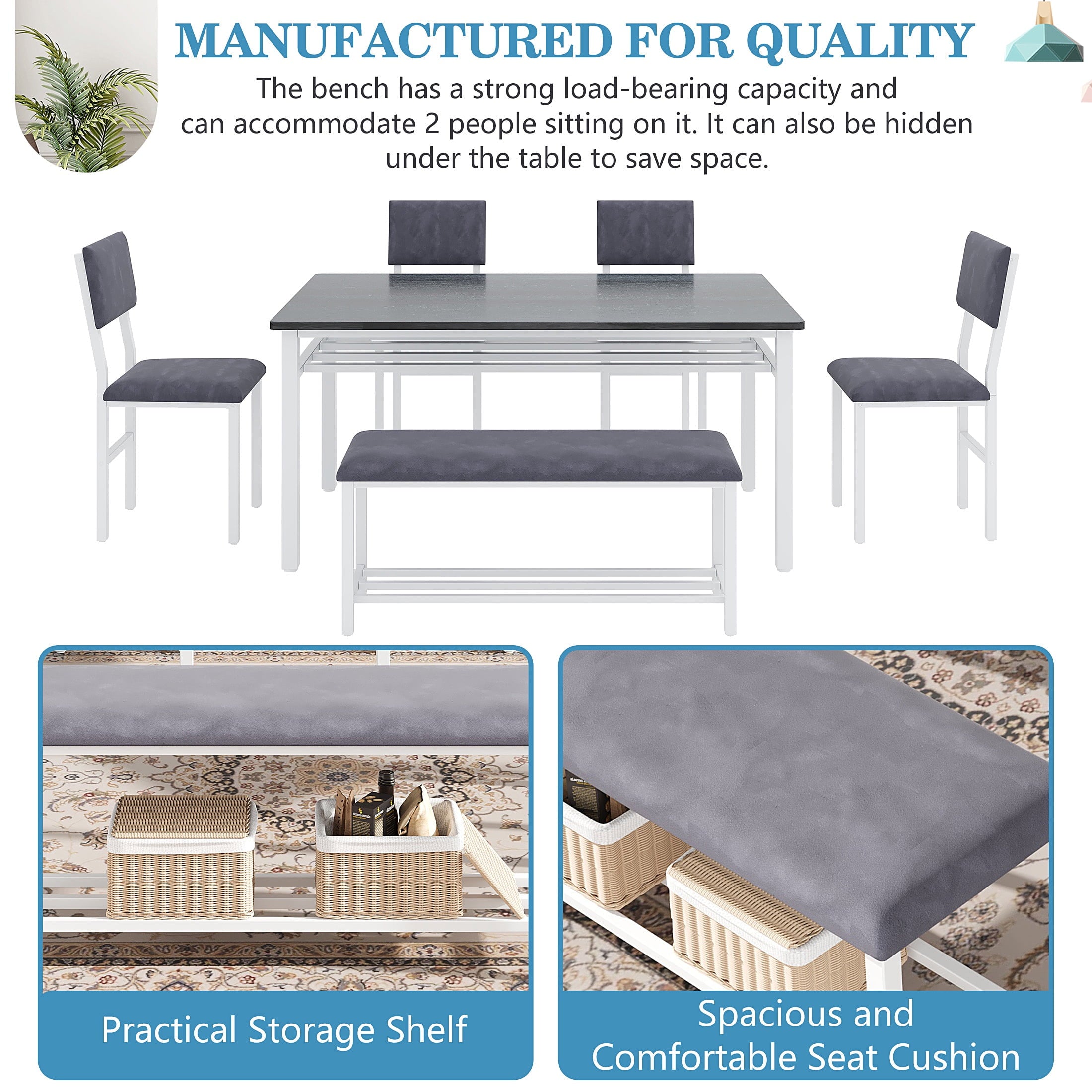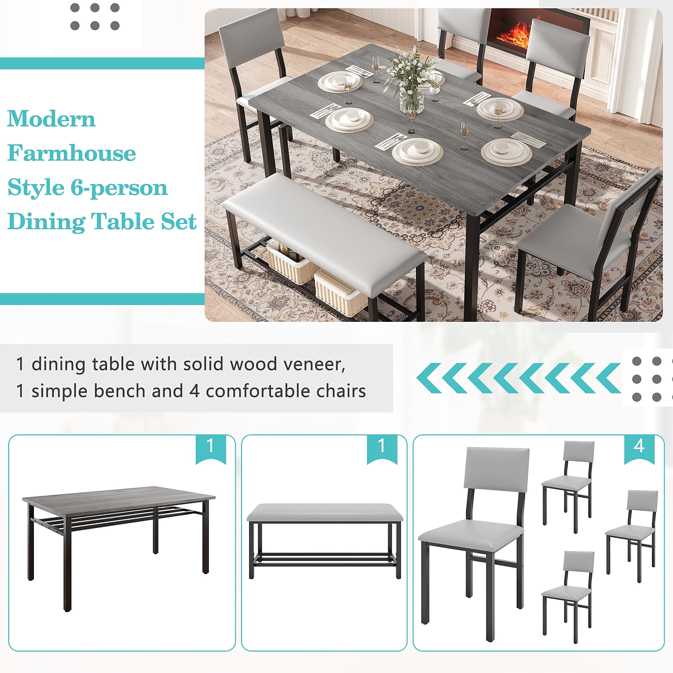 Perfect for Family Gatherings — This 6 piece dining set is designed to accommodate your entire family. With 4 comfortable chairs and a versatile bench, it comfortably seats 6. The spacious 47.2 x 27.56 inch tabletop provides ample room for all your meals, drinks, and activities, perfect for large family meals.