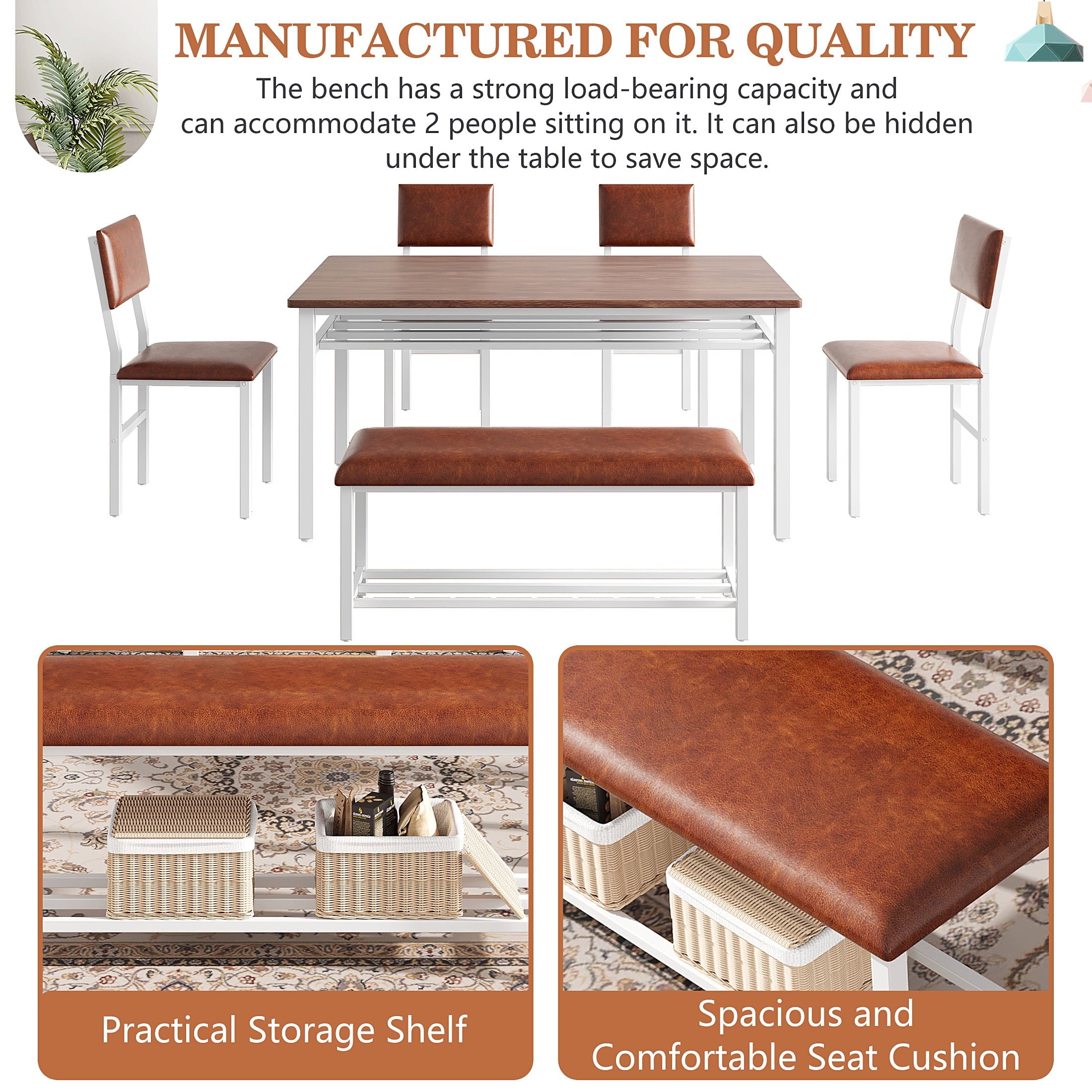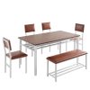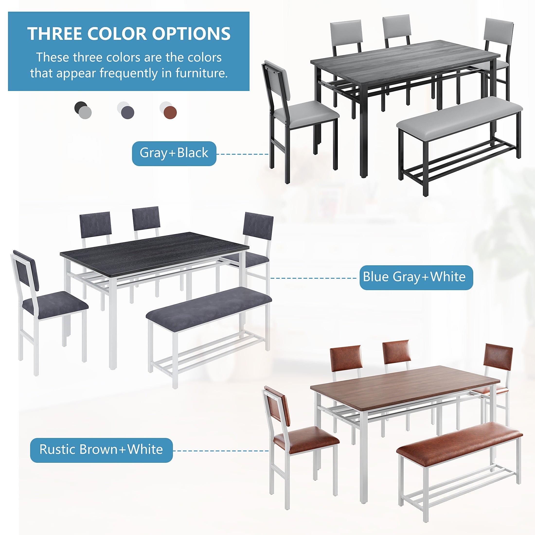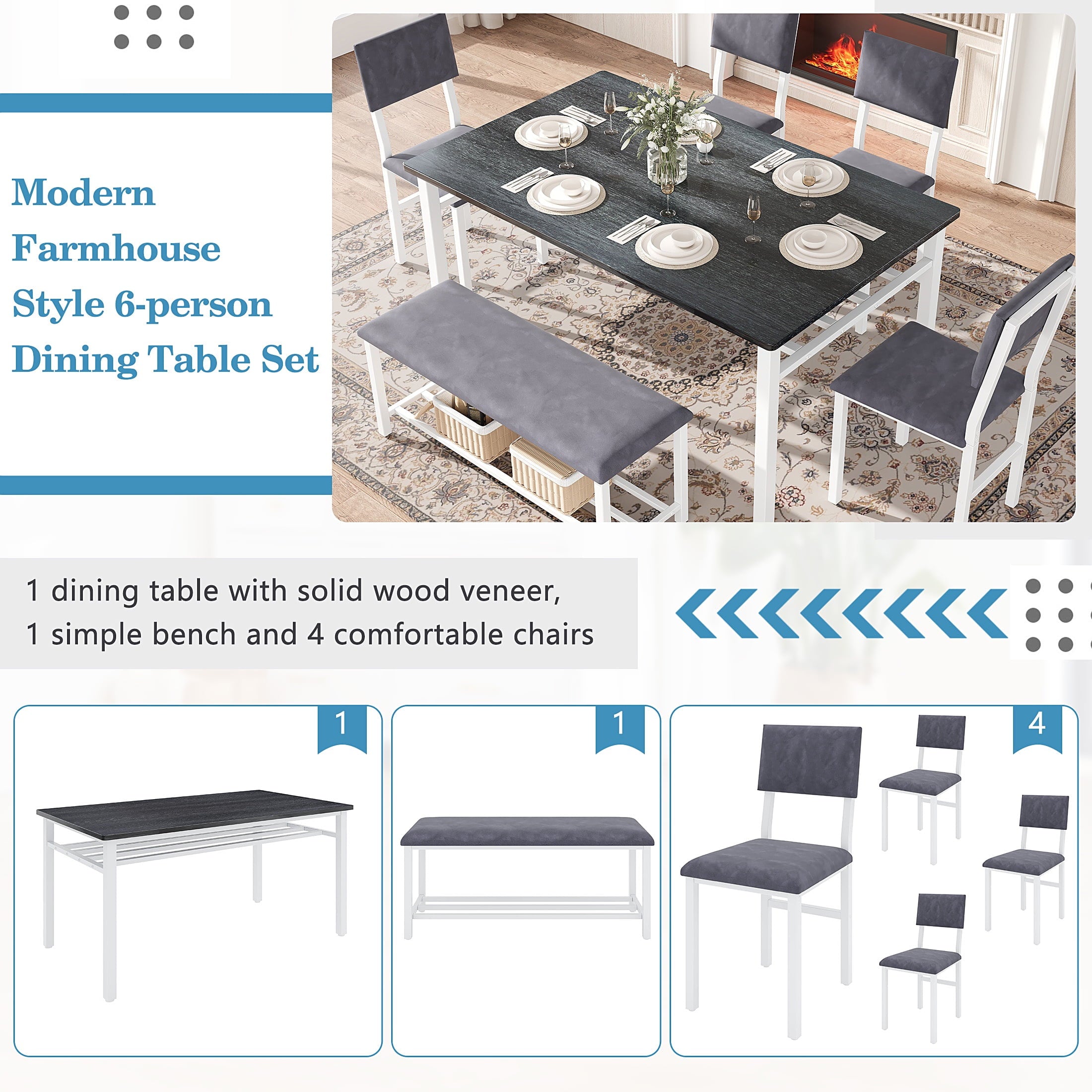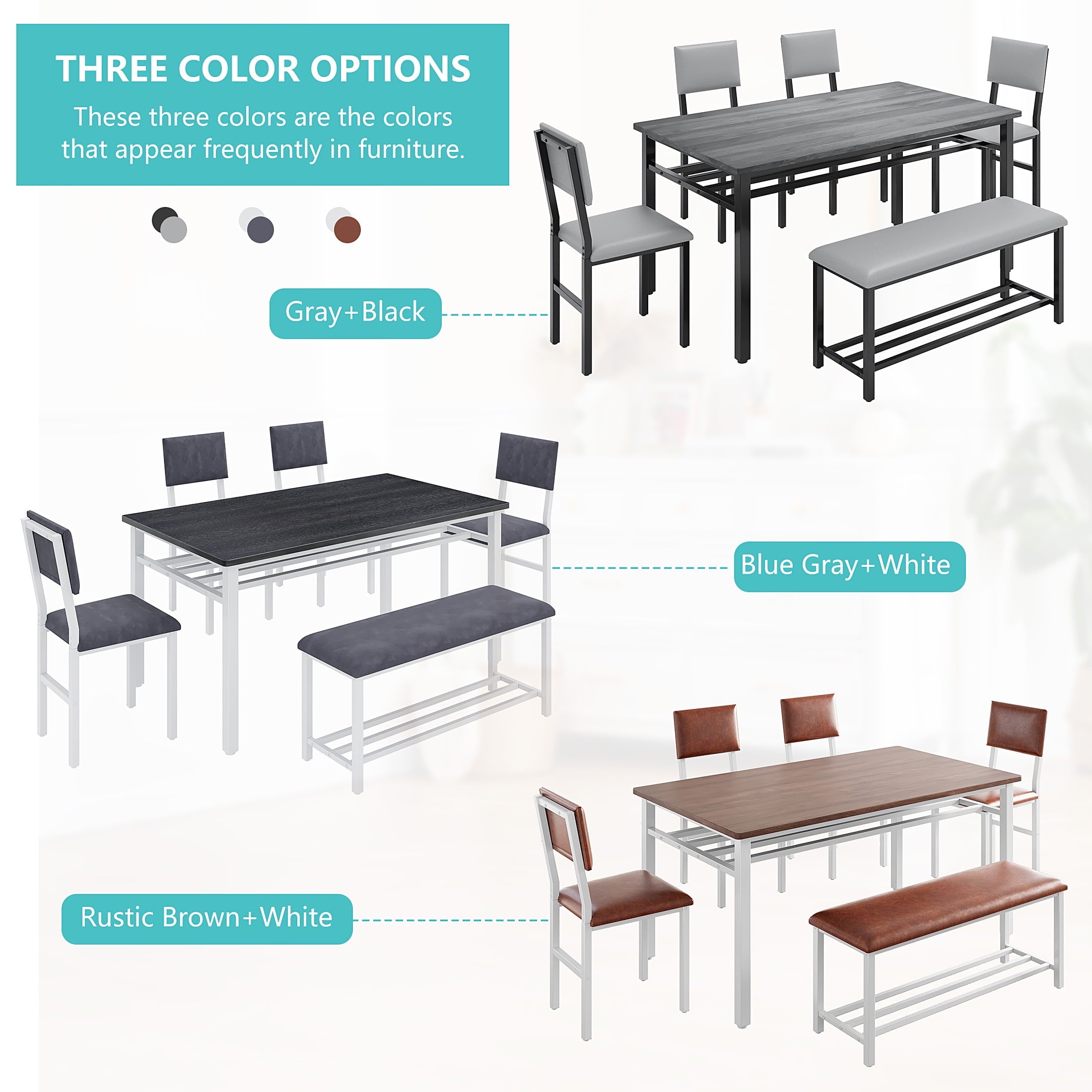 Perfect for Family Gatherings — This 6 piece dining set is designed to accommodate your entire family. With 4 comfortable chairs and a versatile bench, it comfortably seats 6. The spacious 47.2 x 27.56 inch tabletop provides ample room for all your meals, drinks, and activities, perfect for large family meals.