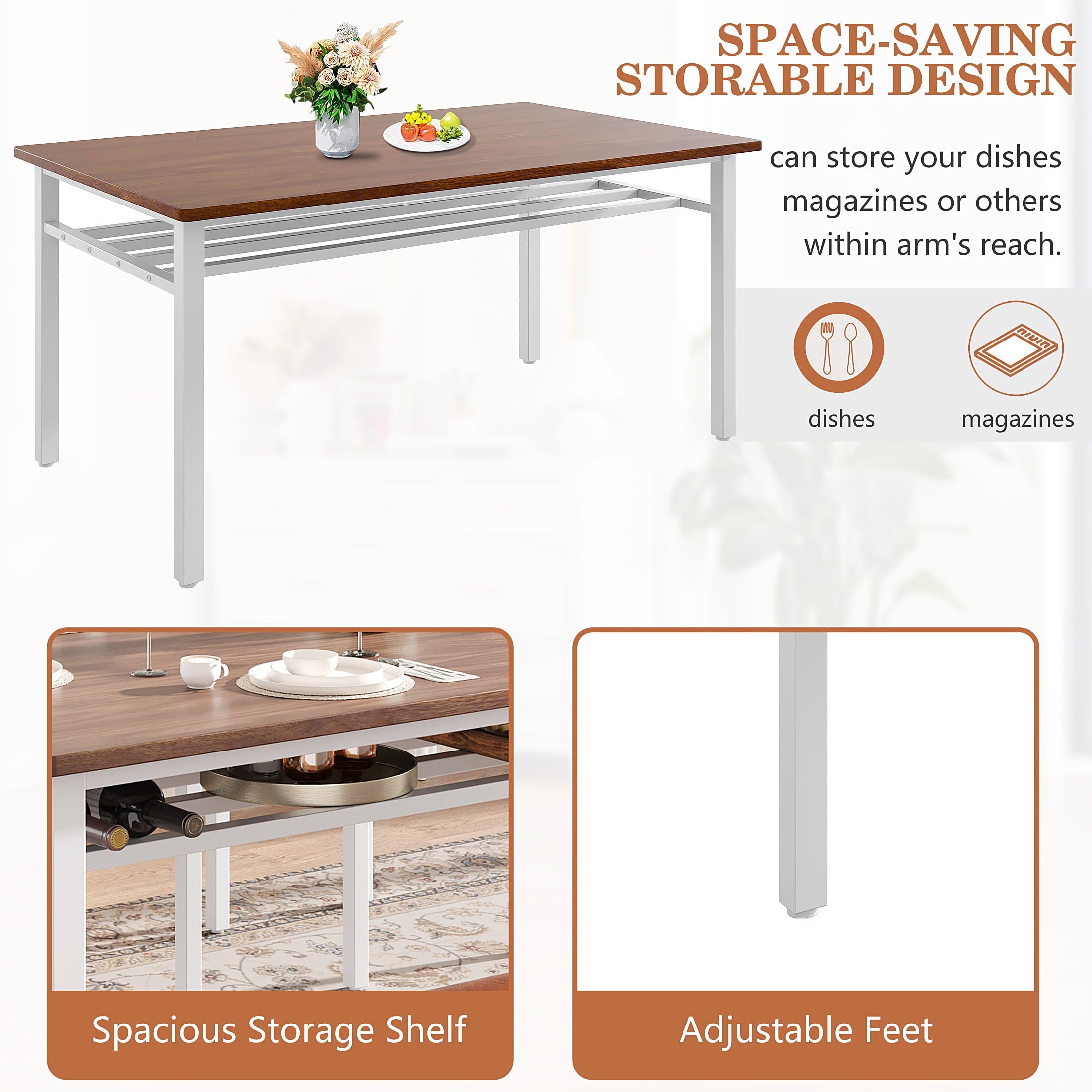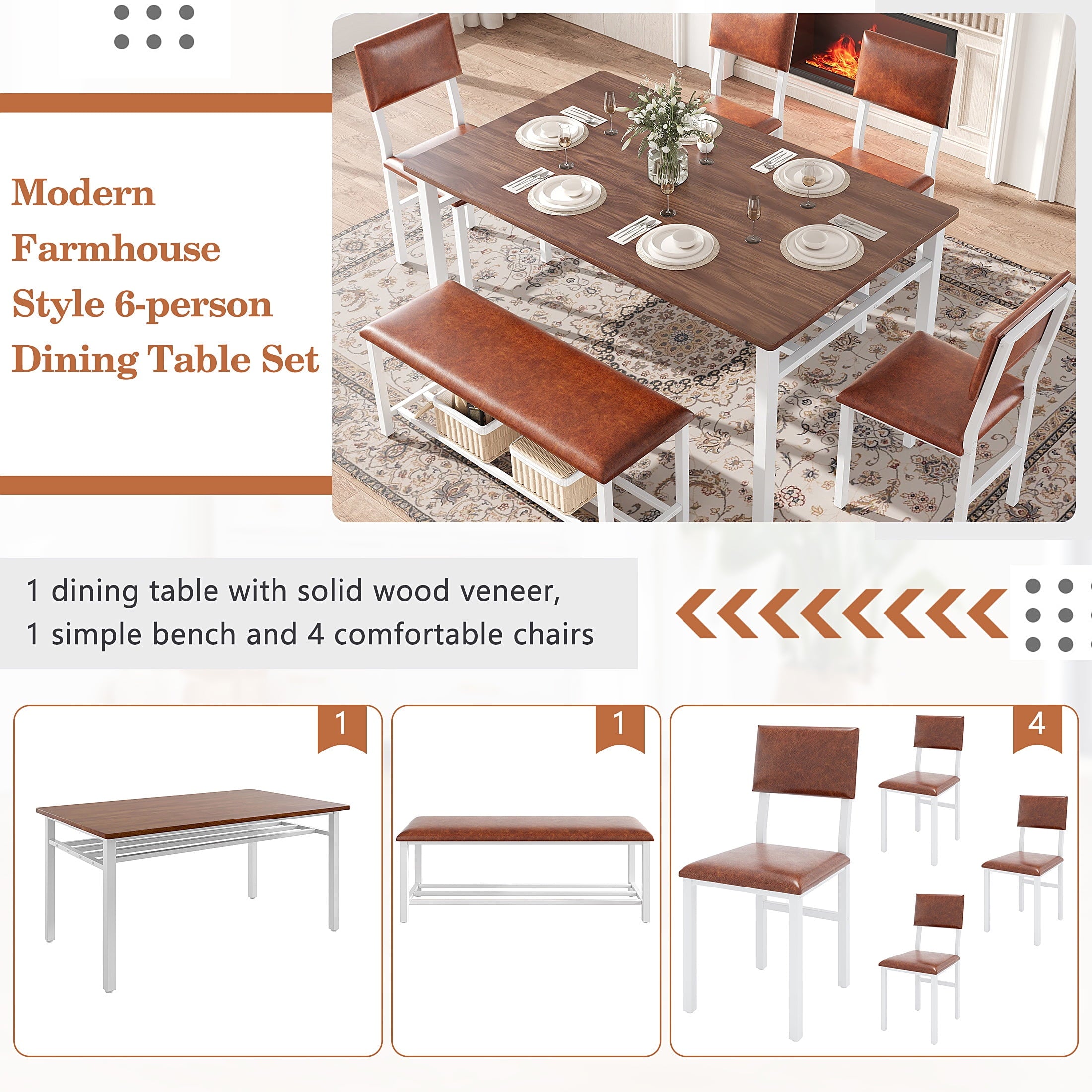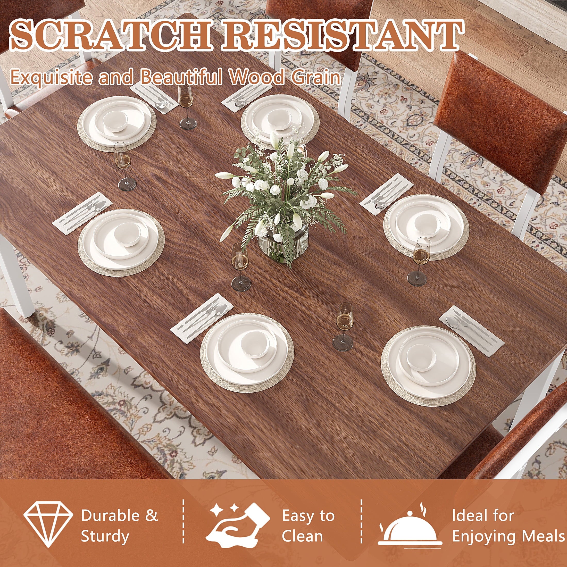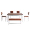 Modern Farmhouse Style with Durable Build — Combining style and durability, this dining room set features a chic brown MDF tabletop and a sturdy white metal frame. The MDF tabletop is scratch-resistant, easy to clean, and highly durable, making it perfect for families. The white iron frame ensures stability and is designed to resist rust, providing long-term reliability and elegance.
