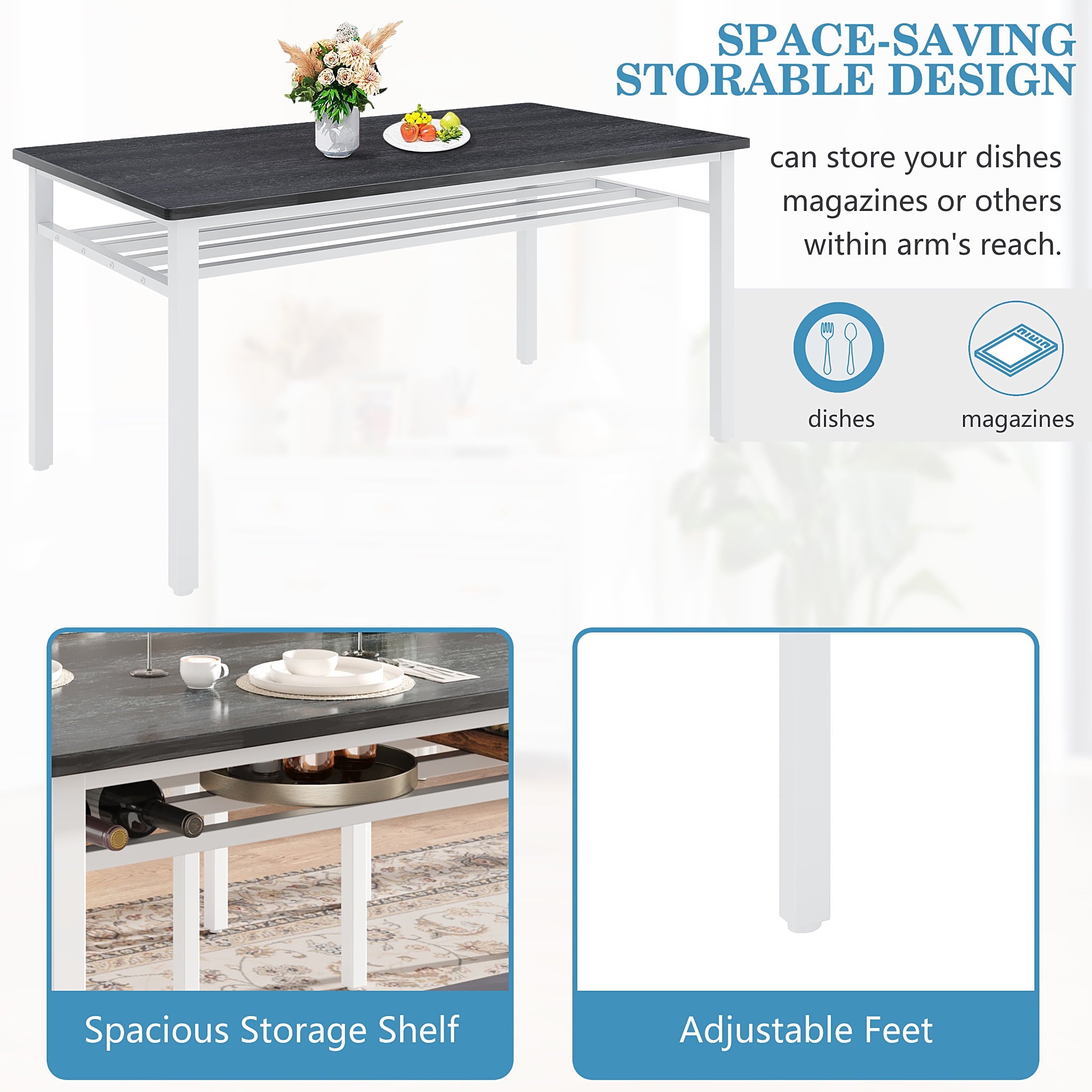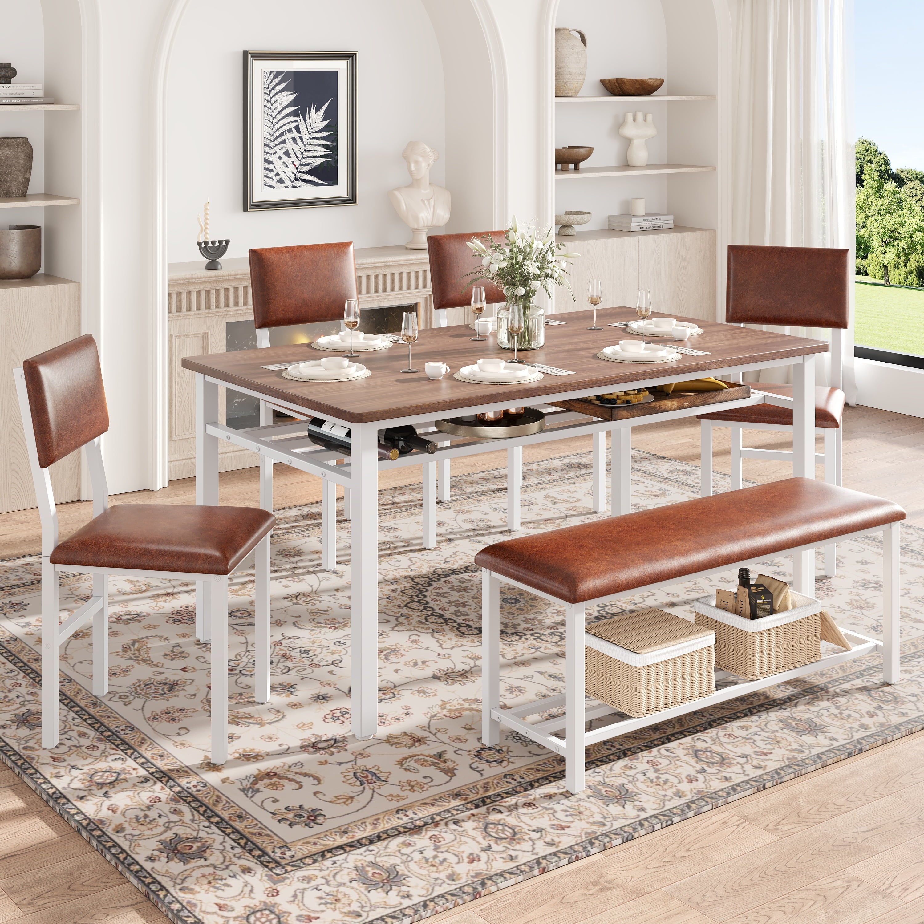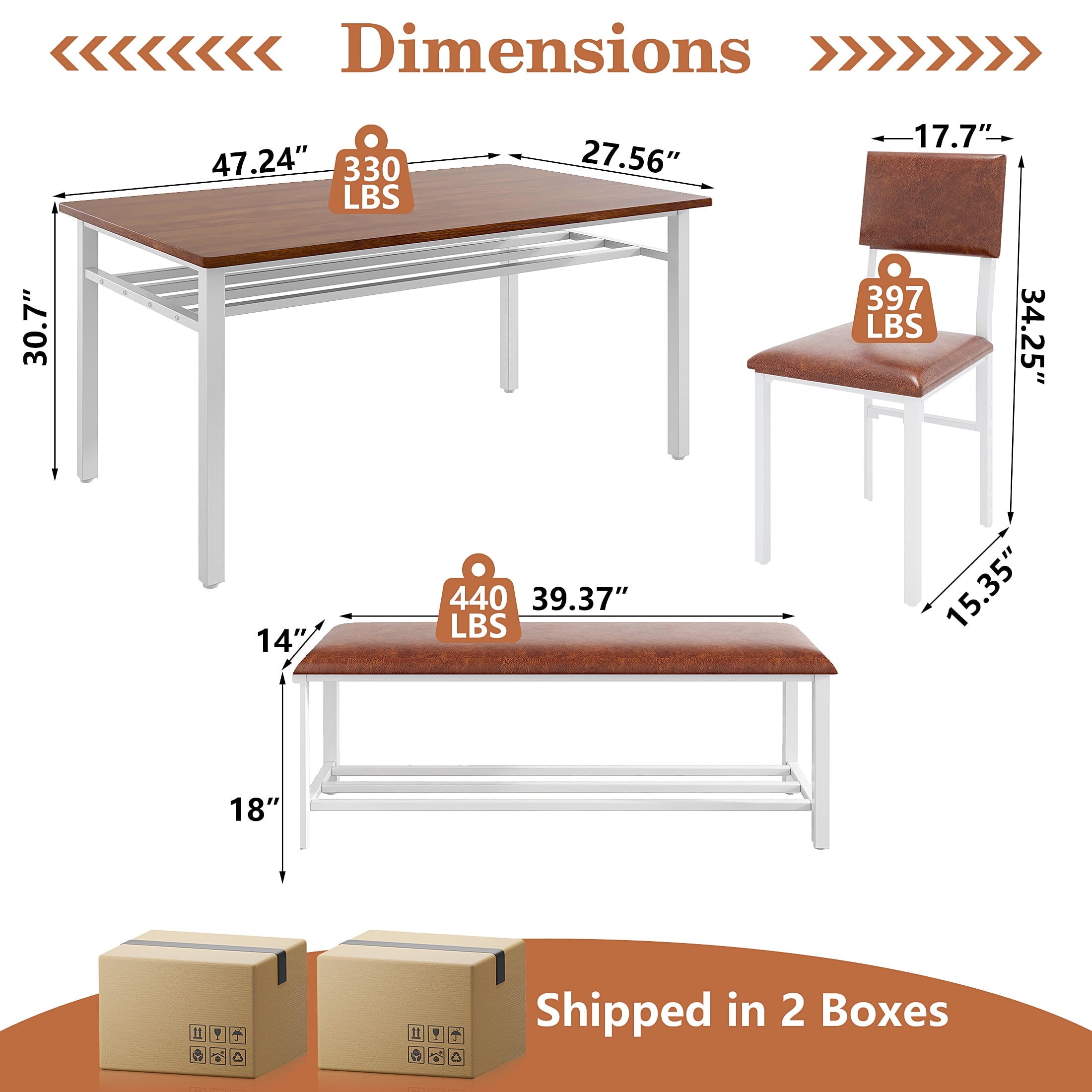 Modern Farmhouse Style with Durable Build — Combining style and durability, this dining room set features a chic brown MDF tabletop and a sturdy white metal frame. The MDF tabletop is scratch-resistant, easy to clean, and highly durable, making it perfect for families. The white iron frame ensures stability and is designed to resist rust, providing long-term reliability and elegance.