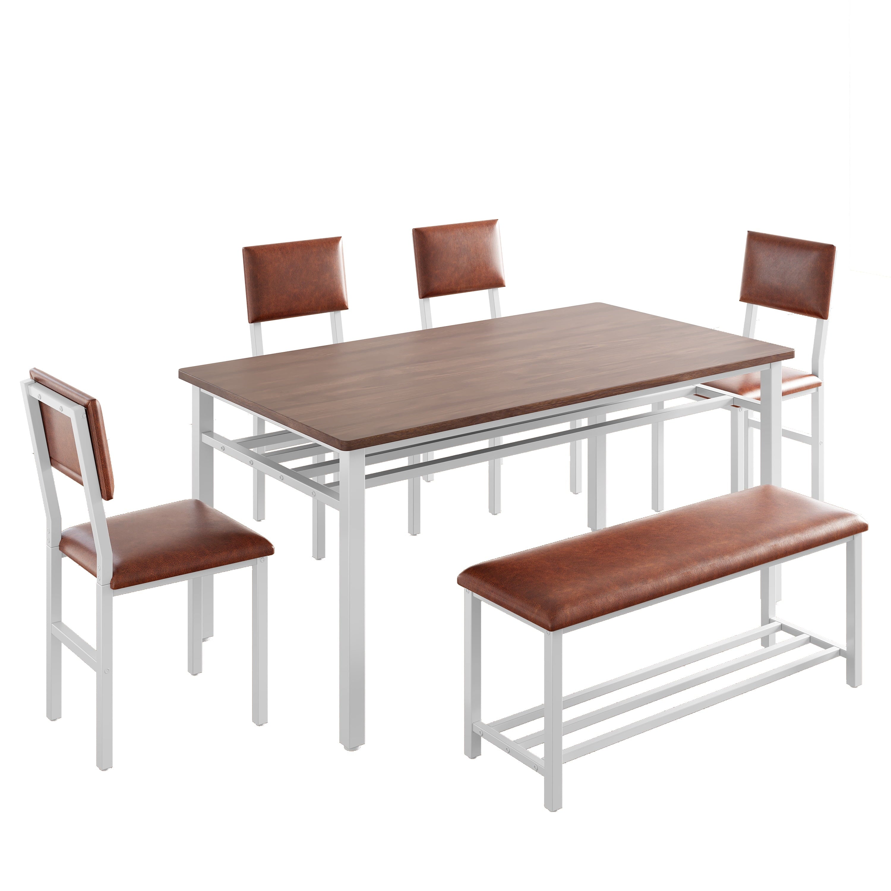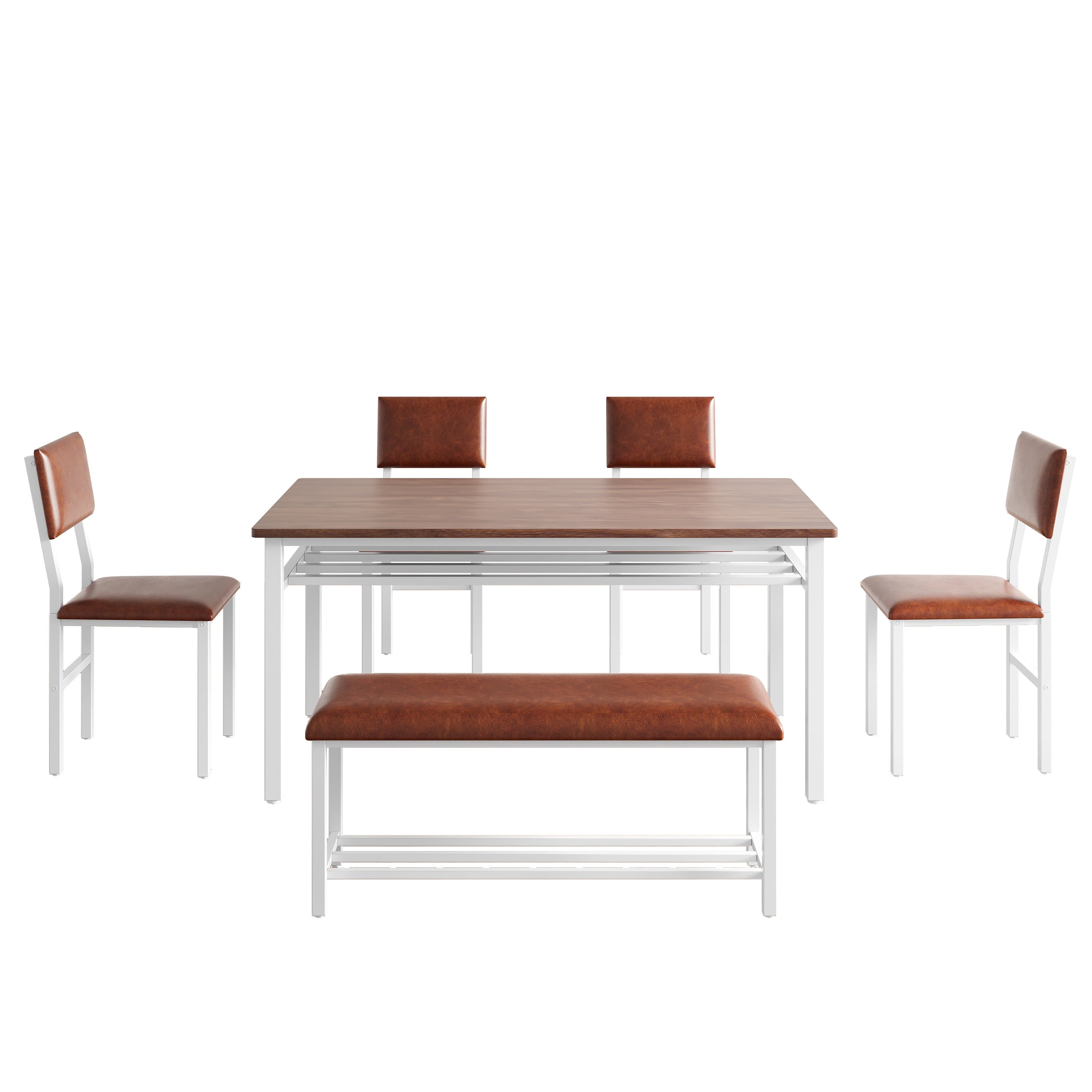 Elevate your dining experience with this 6-piece dining set, designed for family gatherings and modern living. This dining table set features a chic brown MDF tabletop paired with a sturdy white iron frame, and with glossy cognac brown chairs, blending modern farmhouse style with durability. The plush padded PU leather cushions and ergonomic backrests of the dining set provide all-day comfort, while the easy-to-maintain MDF tabletop and durable white metal frame ensure this dining room set remains looking beautiful for years to come. Whether you’re hosting a dinner party or enjoying a quiet meal, this dining table set has everything you need to entertain and relax in style.