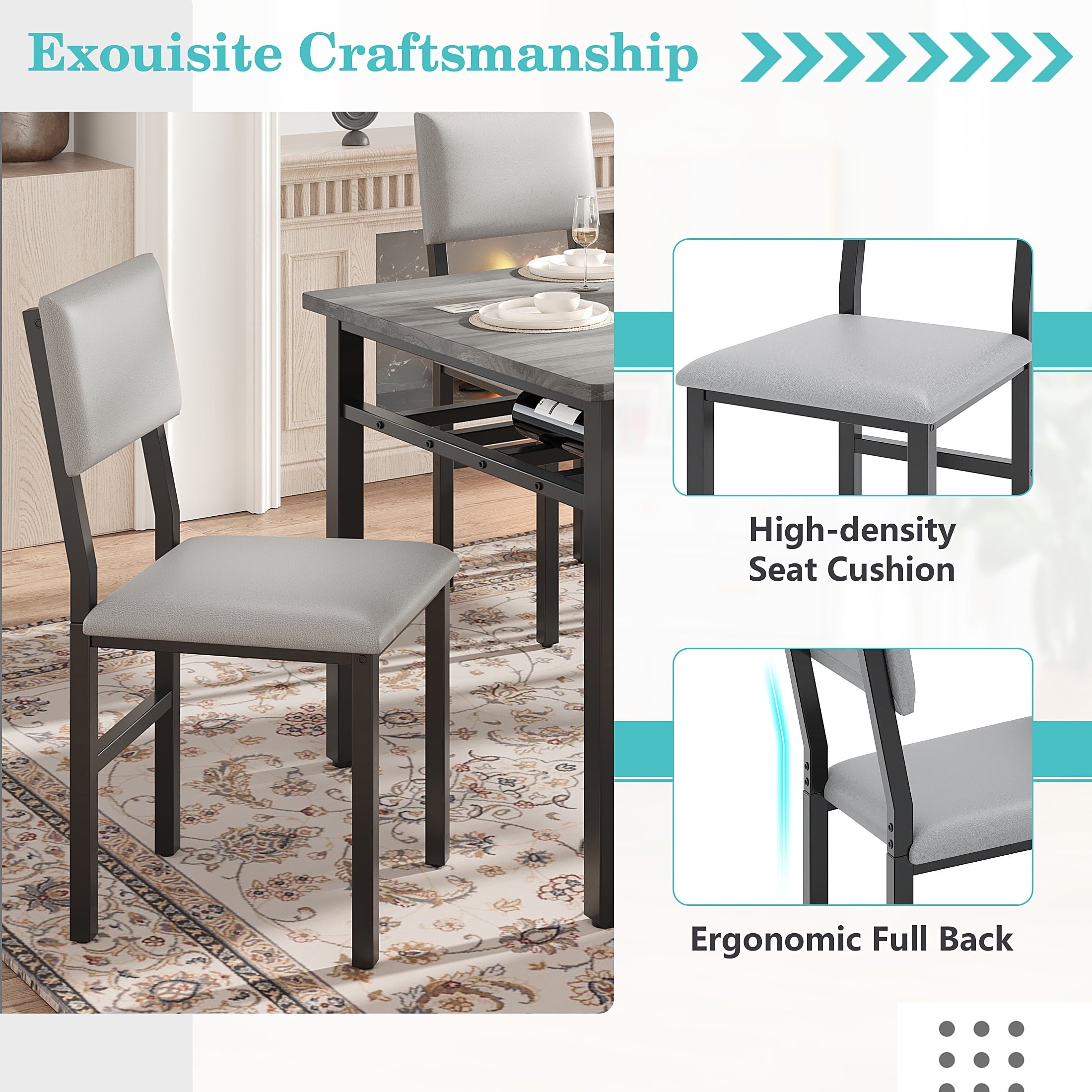 Easy Maintenance — The dining room set features luxurious padded fabric that mimics leather, offering both comfort and a sophisticated look. The seats are easy to wipe clean, ideal for families with children or those who love to entertain.