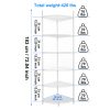 - [Super large storage space] Heavy duty shelving with leveling feet – each layer shelf can hold 70lbs (evenly distributed), maximum load capacity is 420 lbs. It is recommend that heavy items on the bottom shelf for maximum stability. The triangle shelf has 6 shelf Liners, beautiful and fun transparent colors allow you to add a pop of color to your life. Shelf Liners is waterproof – Won’t get damaged from exposure to moisture.